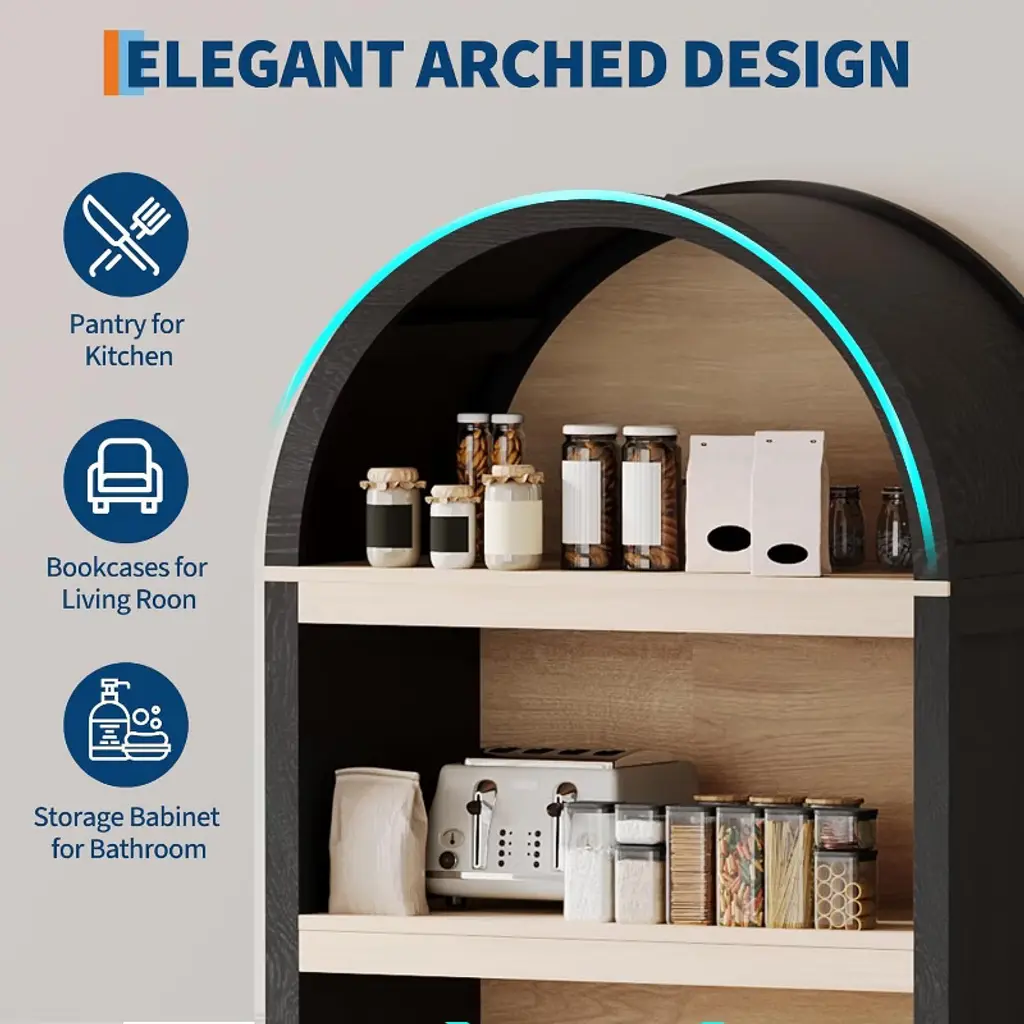 71" Arched Storage Cabinet With 5 Tiers, Mid-century Style Doors, Kitchen Pantry And Display Shelves For Office, Dining Room, Living Room