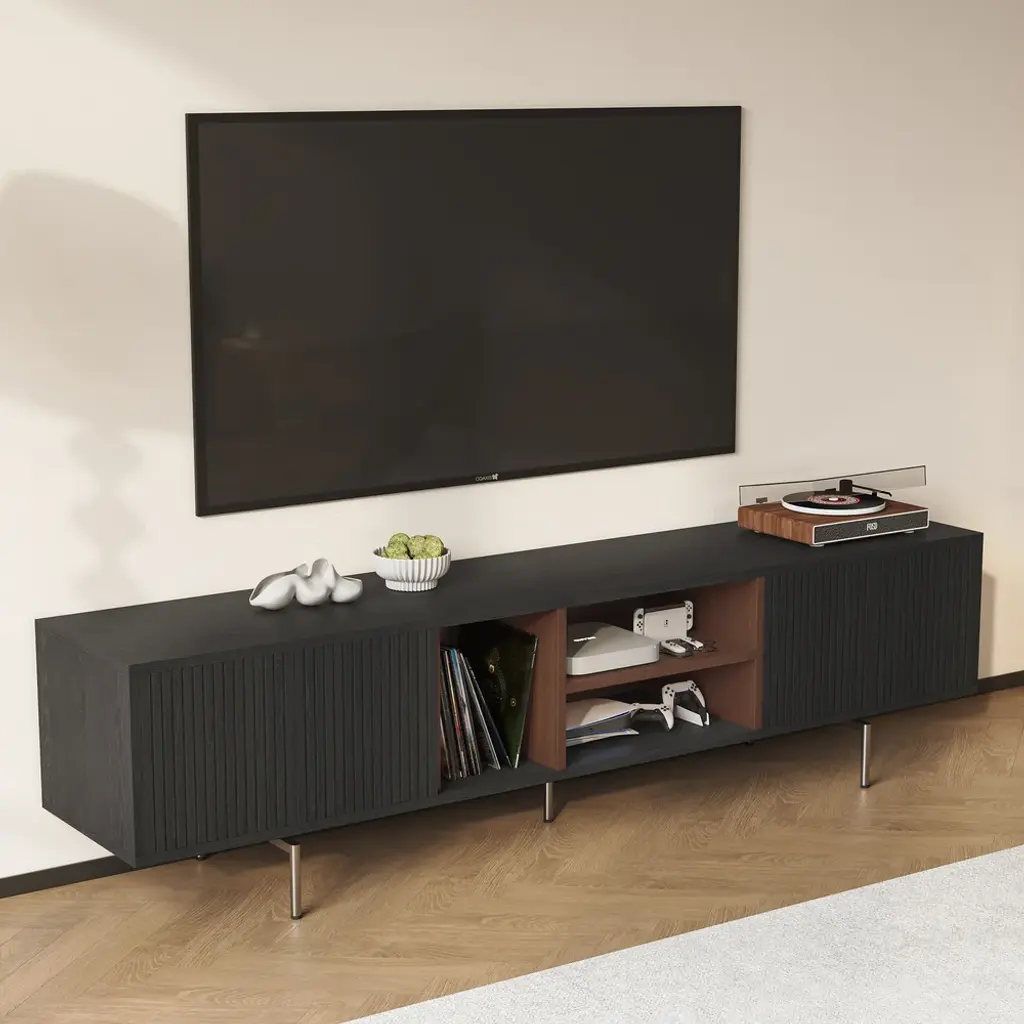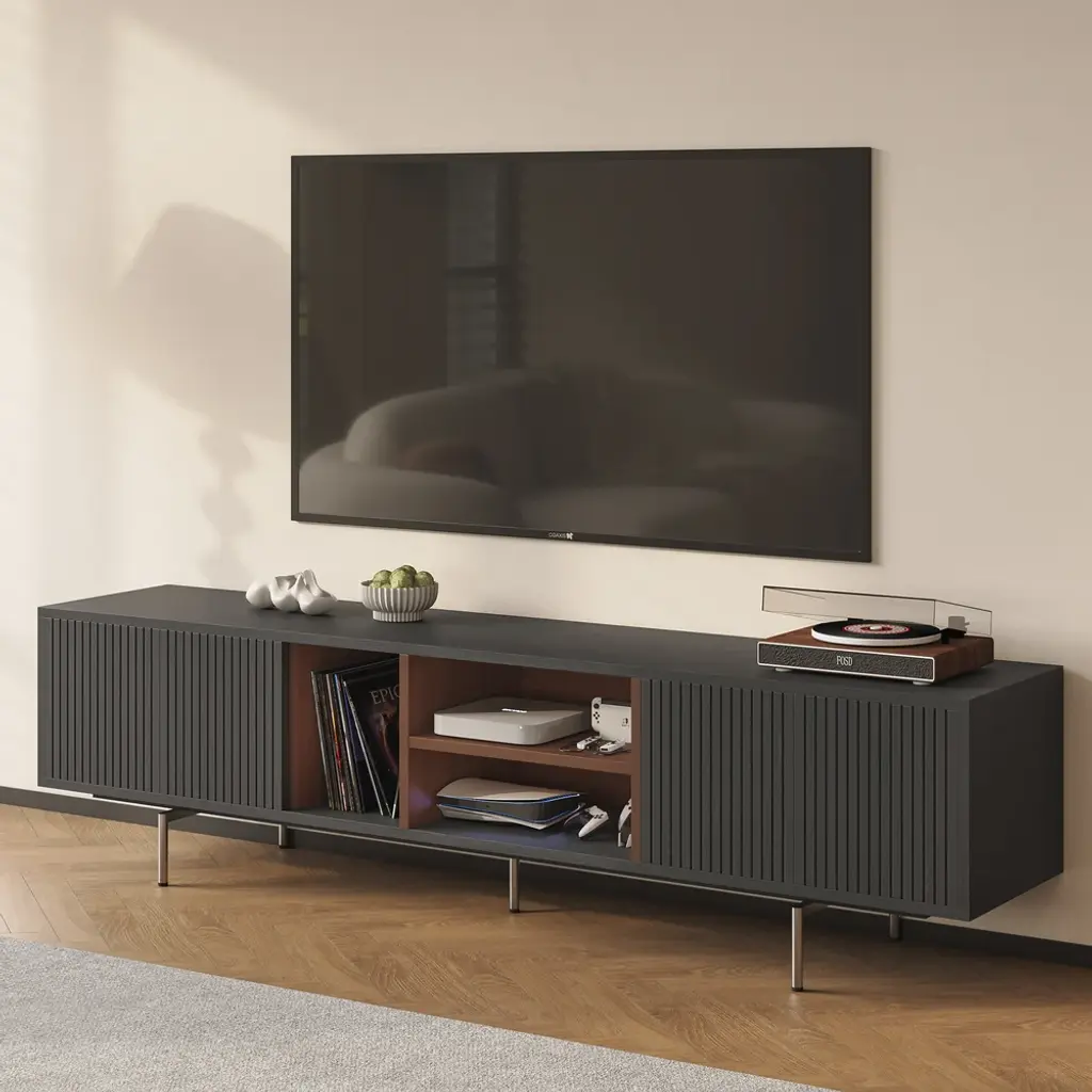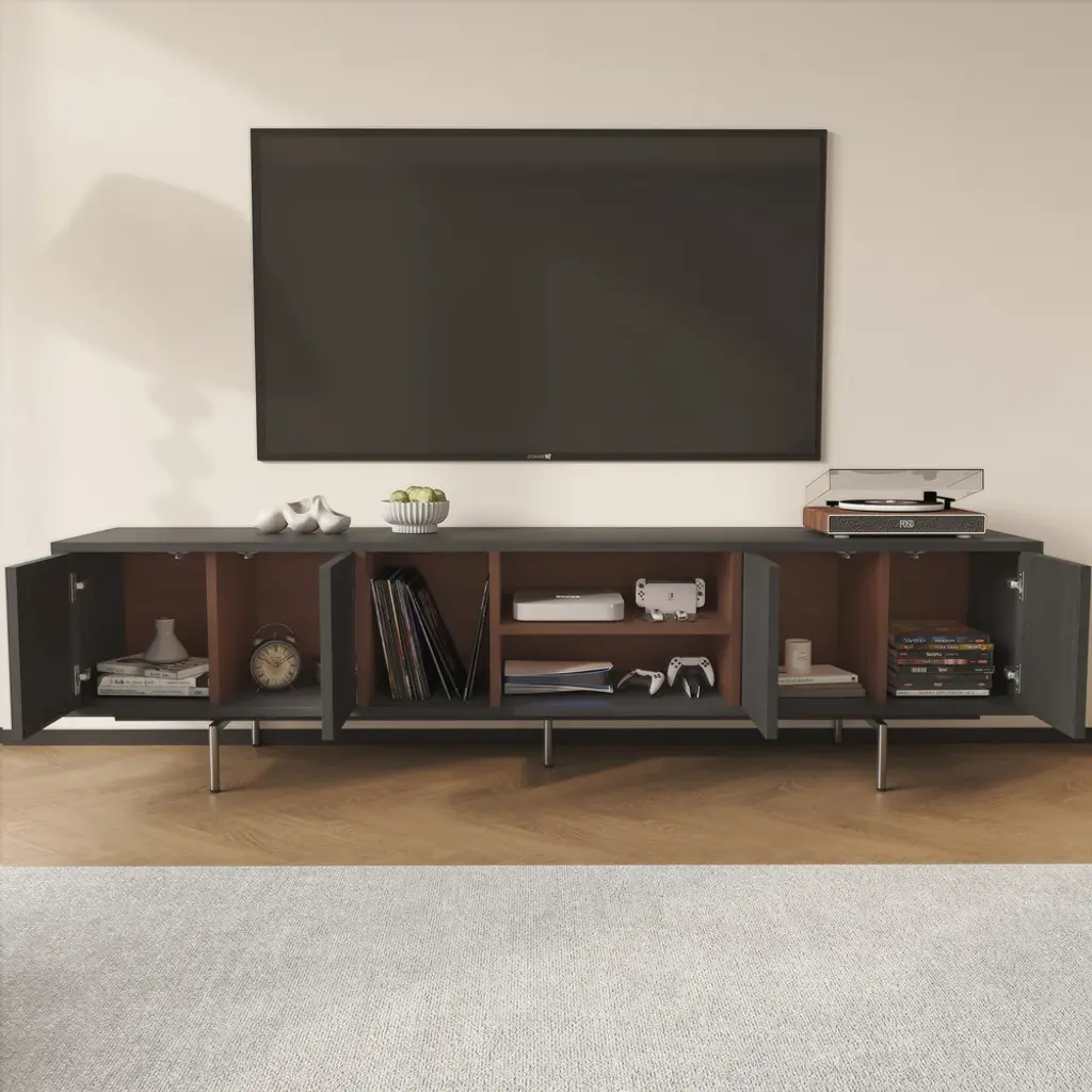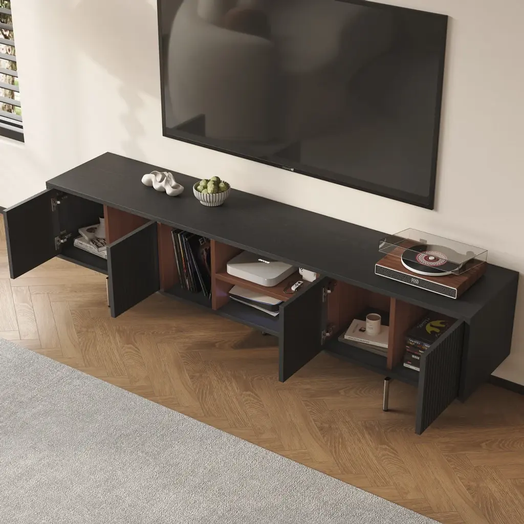 This TV cabinet embodies practical aesthetics through modern design. Featuring four doors, it offers ample storage to keep everyday clutter out of sight and your living room tidy. The open-shelf layout provides convenient space to display books, decor, or frequently used items, making everything easily accessible. Its elevated design not only creates a light and airy look but also allows robot vacuums to pass underneath effortlessly, ensuring a spotless clean with no hard-to-reach areas.