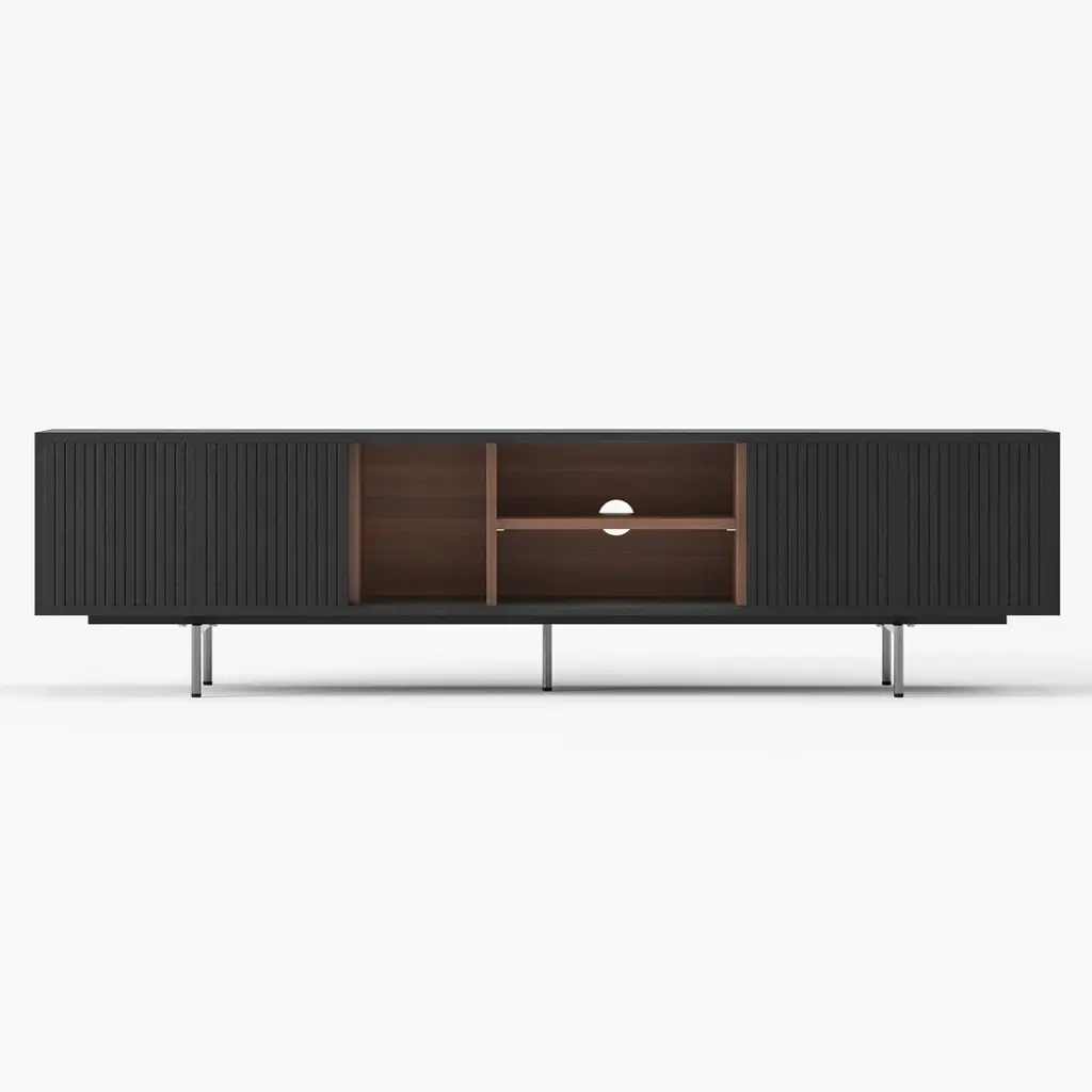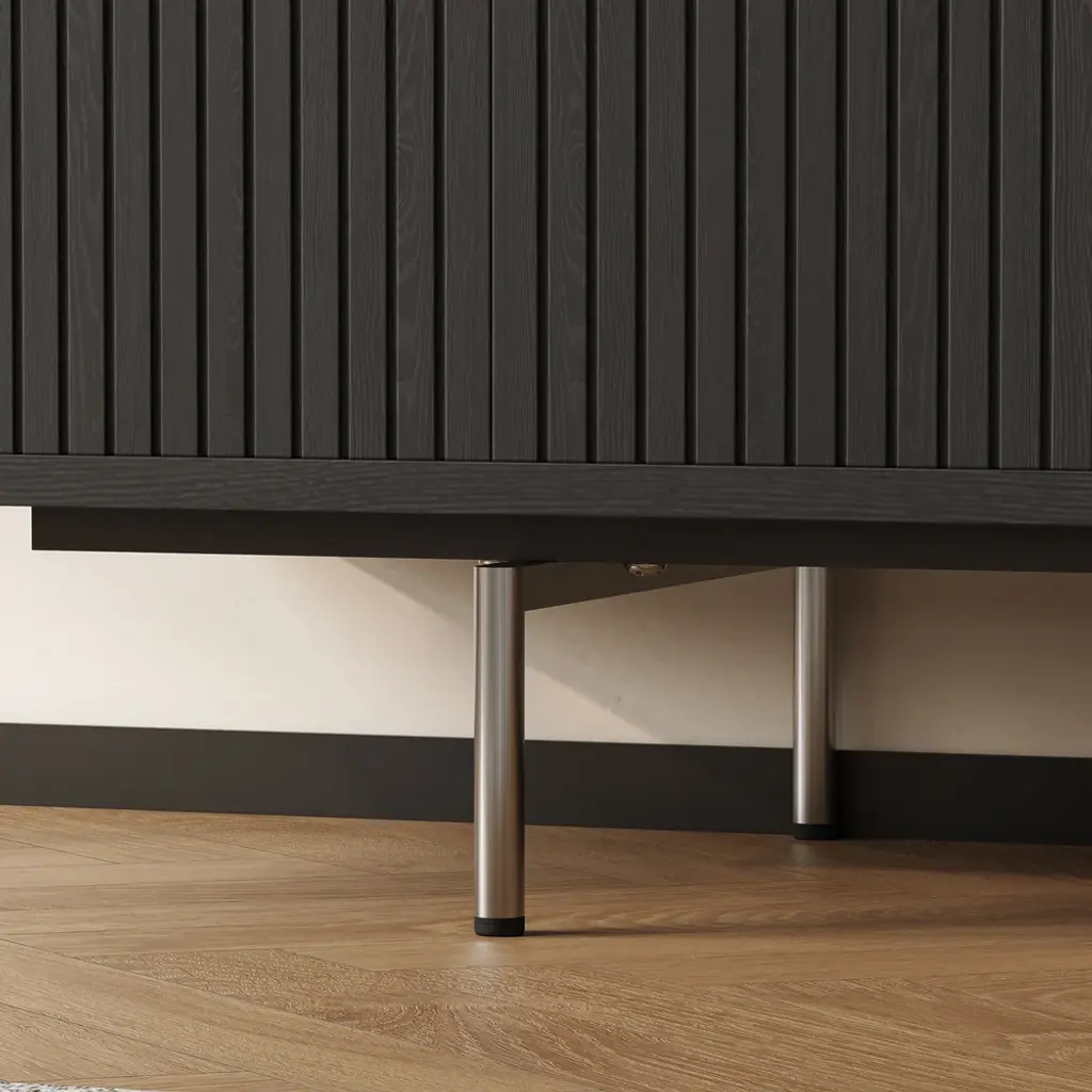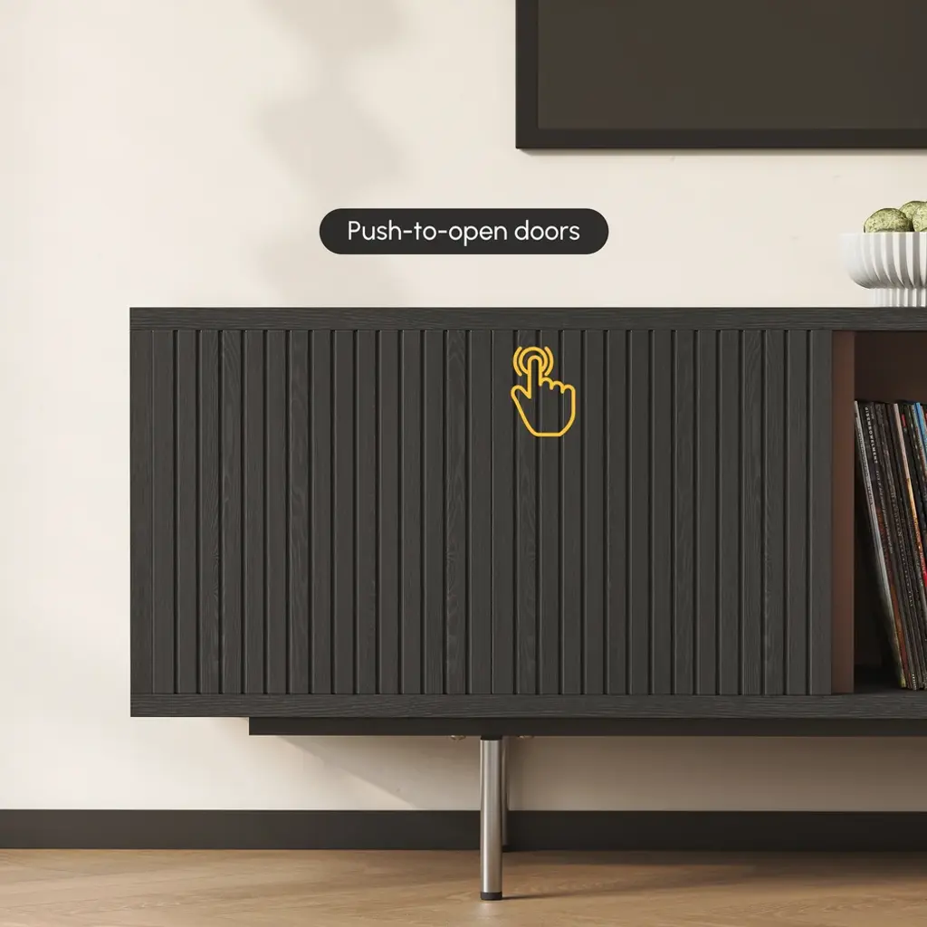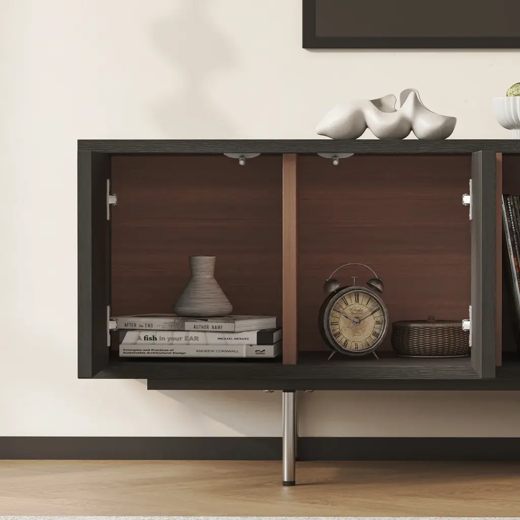 This TV cabinet embodies practical aesthetics through modern design. Featuring four doors, it offers ample storage to keep everyday clutter out of sight and your living room tidy. The open-shelf layout provides convenient space to display books, decor, or frequently used items, making everything easily accessible. Its elevated design not only creates a light and airy look but also allows robot vacuums to pass underneath effortlessly, ensuring a spotless clean with no hard-to-reach areas.