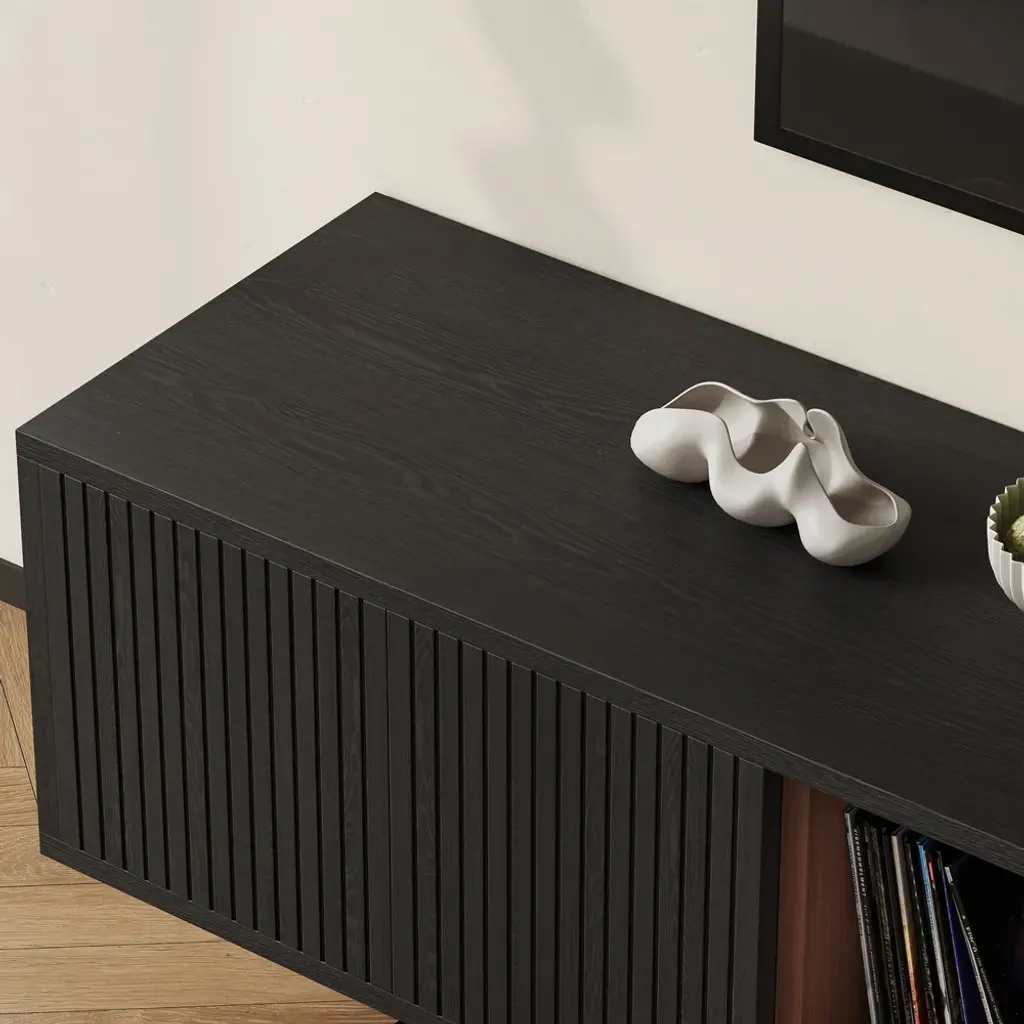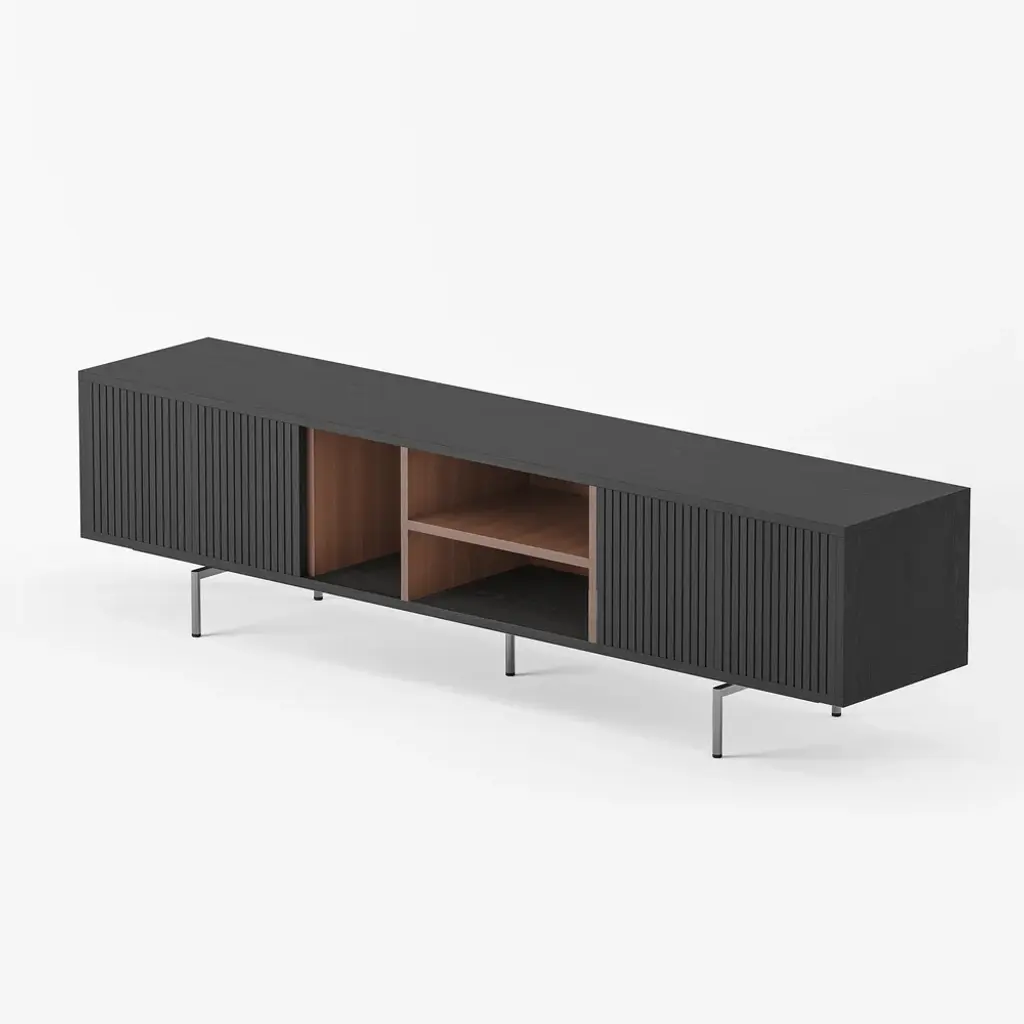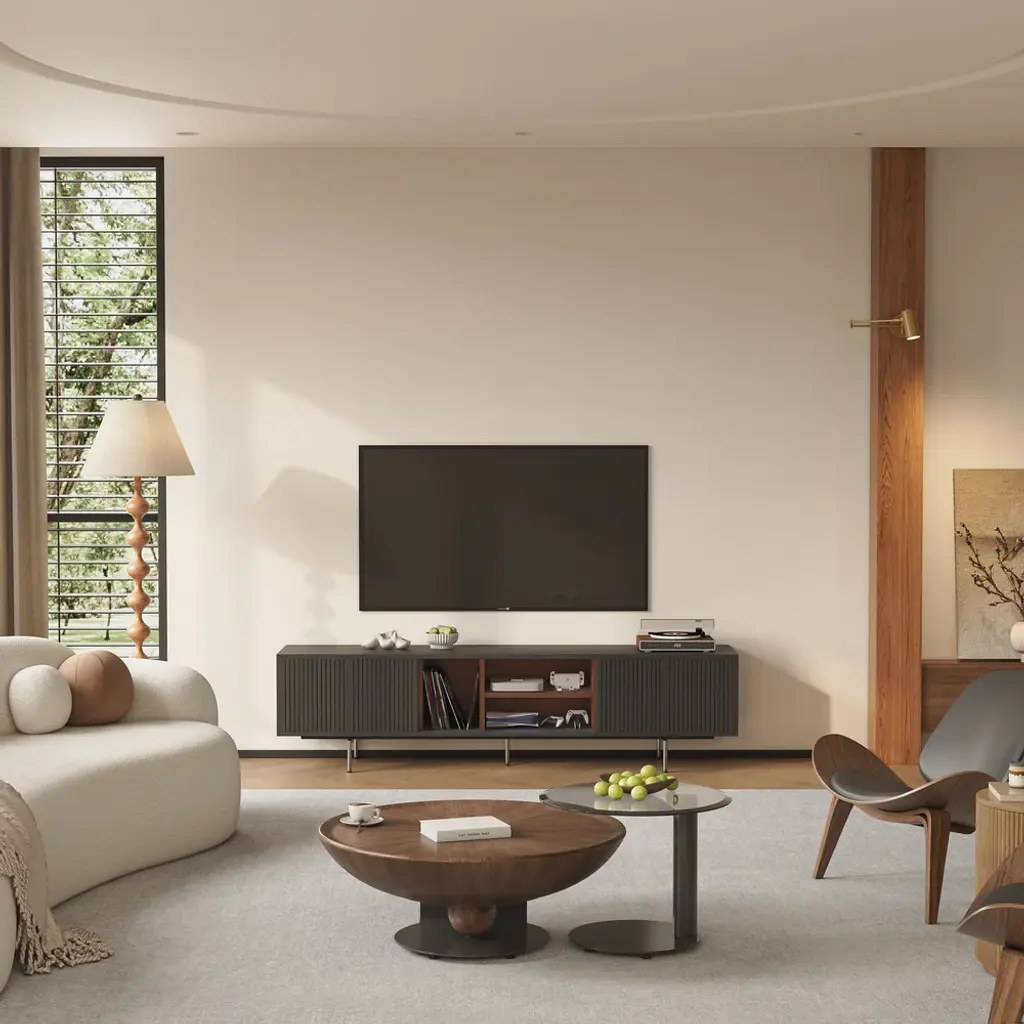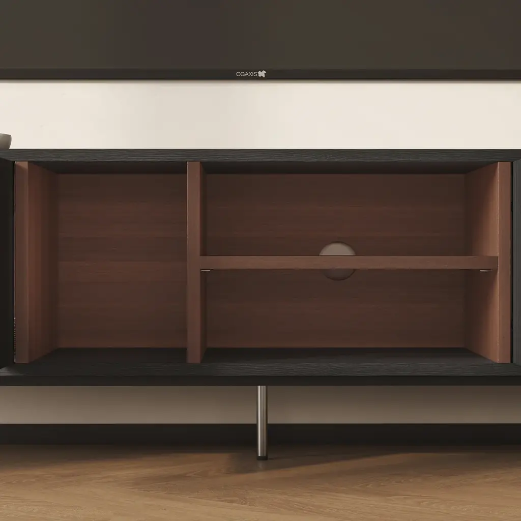 This TV cabinet embodies practical aesthetics through modern design. Featuring four doors, it offers ample storage to keep everyday clutter out of sight and your living room tidy. The open-shelf layout provides convenient space to display books, decor, or frequently used items, making everything easily accessible. Its elevated design not only creates a light and airy look but also allows robot vacuums to pass underneath effortlessly, ensuring a spotless clean with no hard-to-reach areas.