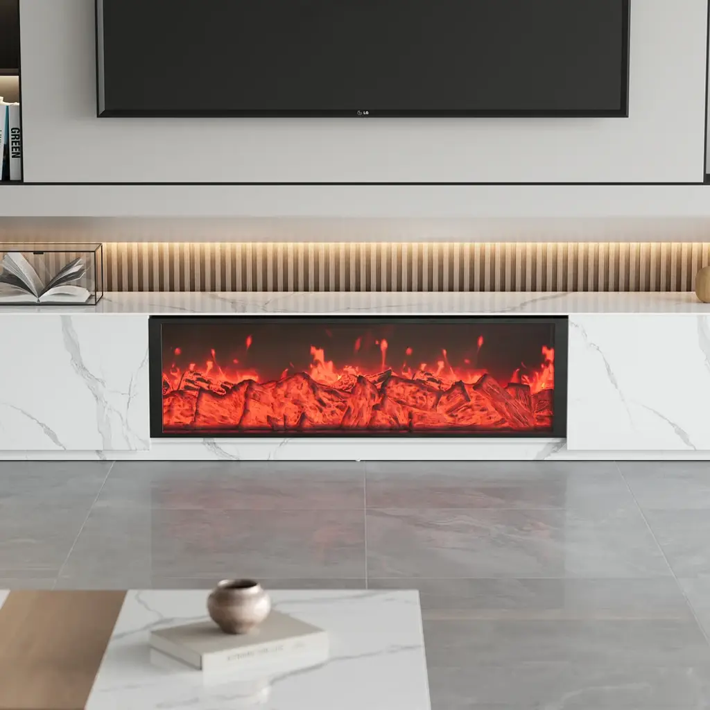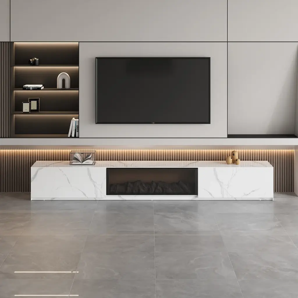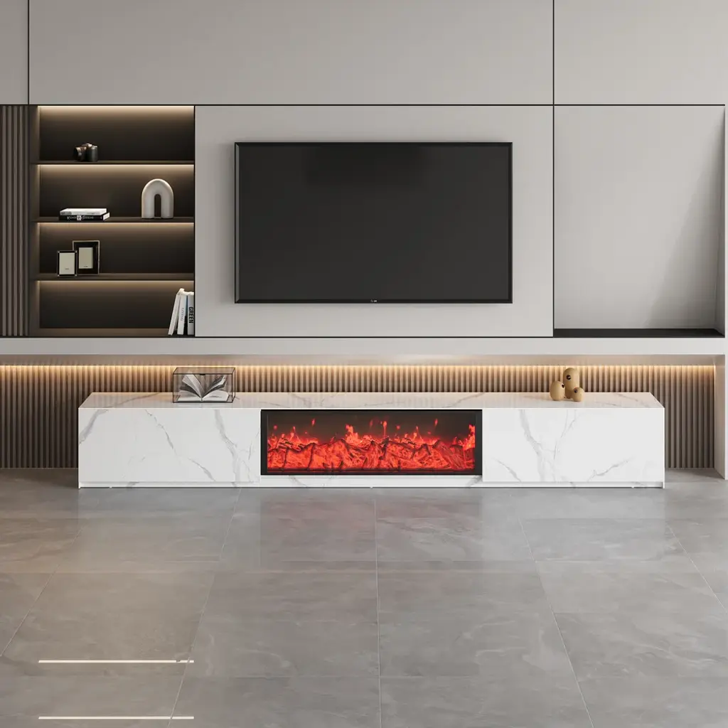 This TV cabinet is made of high-quality marble veneer and marble veneer plates, which are durable and stylish. The electric fireplace has easy control, with the capacity to deliver far more realistic 3D flame effects, glowing logs, and embers to create coziness in the atmosphere. This comes with ample storage space, making it the best choice for decorating the living room and practicality.