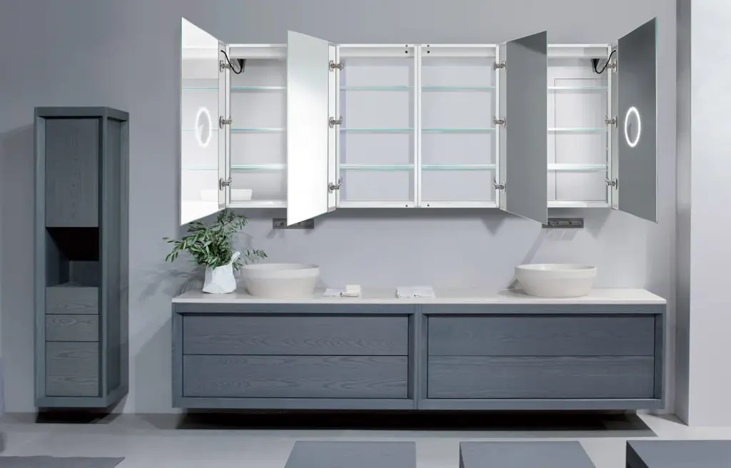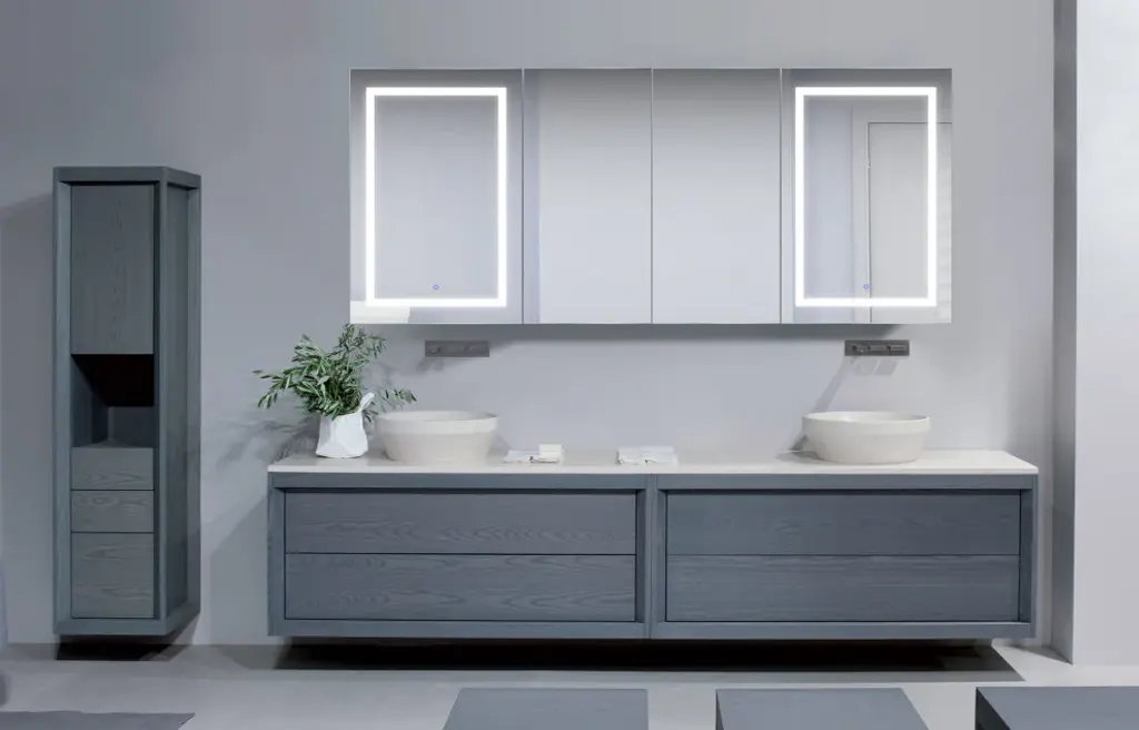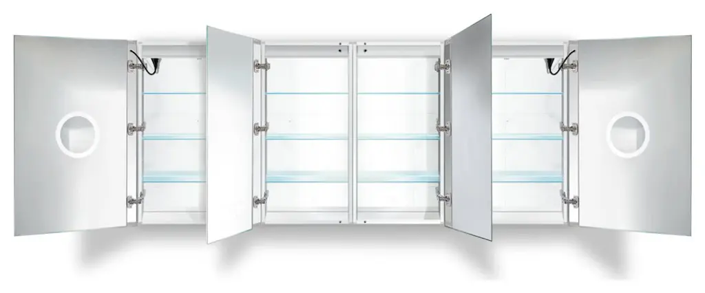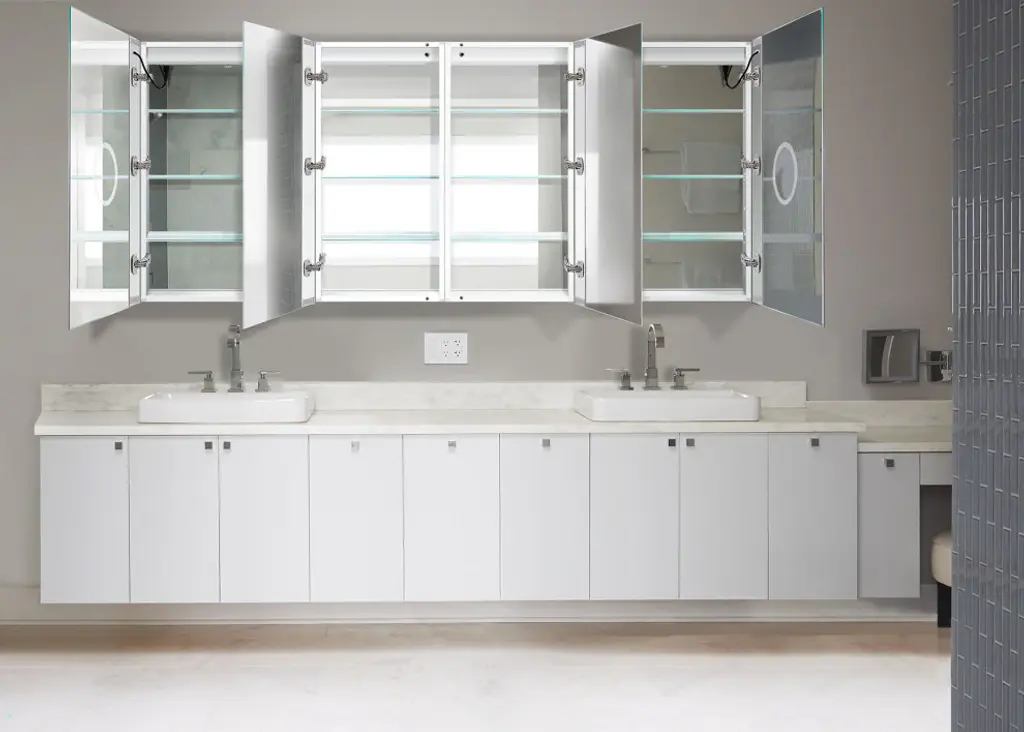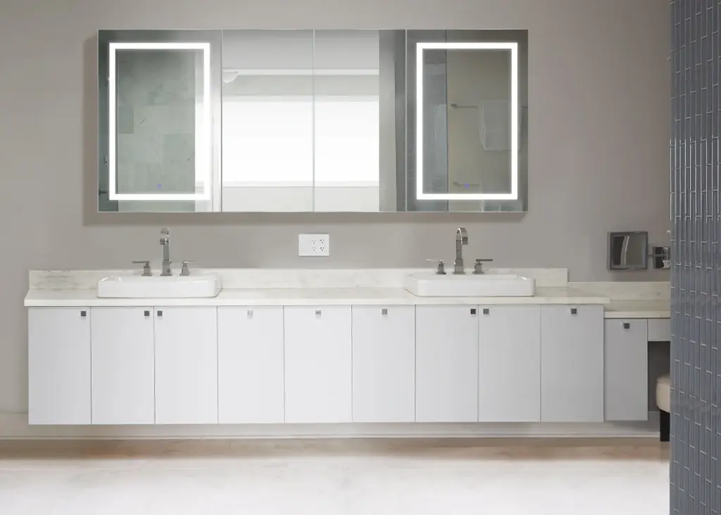Our LED Medicine Cabinet is a symphony of design elements. We combined our most powerful lighting advancements to create a beautiful storage solution an expression of luxury and function for your bath. From a distance, the LED border produces a striking, modern glow. Up close, enjoy unparalleled light dispersion on the face and body. Effortless to use, a revolutionary touch icon is integrated into the mirror face for seamless on/off toggling and dimming with memory functionality Open the lighted section cabinet to reveal the full suite of amenities. In the mirrored door, a 3x magnified, LED-lit mirror is perfect for detailed makeup application. The mirrored interior is illuminated automatically for a luxurious touch. Our wide-angle hinges provide freedom of motion and panorama. The 2+2 smart outlet contains two traditional outlets and two USB interfaces to keep beauty tools, as well as a smartphone or tablet, close at hand. We ensure reliable optical clarity with active defogging technology. This LED Medicine Cabinet is limited only by your imagination.
