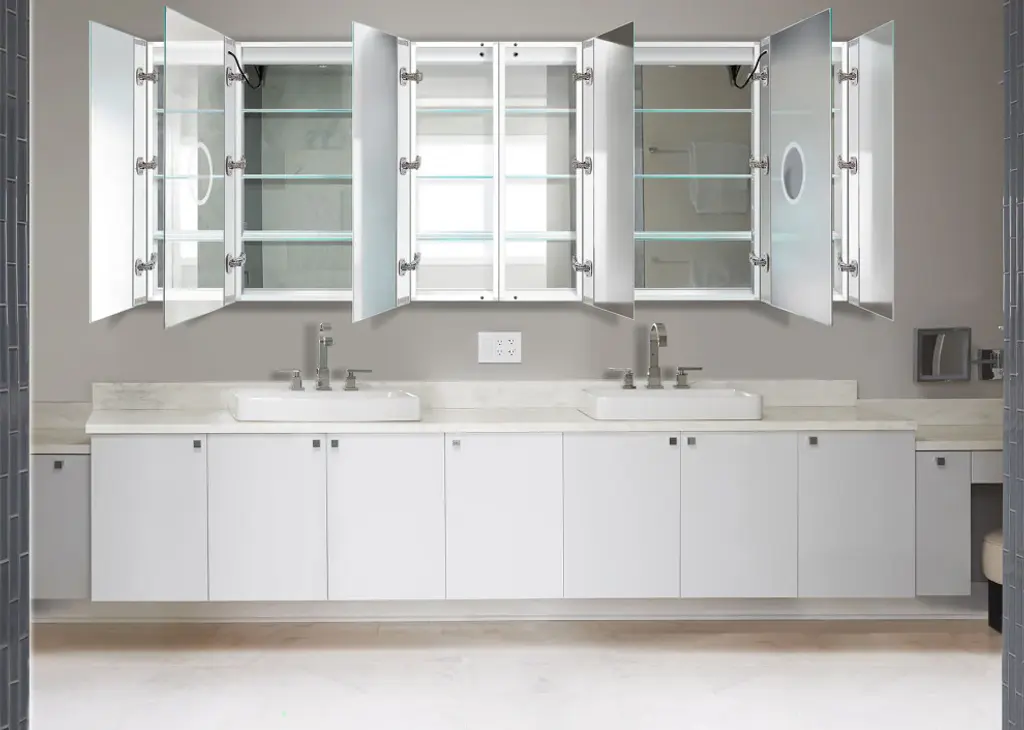 Our LED Medicine Cabinet is a symphony of design elements. We combined our most powerful lighting advancements to create a beautiful storage solution an expression of luxury and function for your bath. From a distance, the LED border produces a striking, modern glow. Up close, enjoy unparalleled light dispersion on the face and body. Effortless to use, a revolutionary touch icon is integrated into the mirror face for seamless on/off toggling and dimming with memory functionality Open the lighted section cabinet to reveal the full suite of amenities. In the mirrored door, a 3x magnified, LED-lit mirror is perfect for detailed makeup application. The mirrored interior is illuminated automatically for a luxurious touch. Our wide-angle hinges provide freedom of motion and panorama. The 2+2 smart outlet contains two traditional outlets and two USB interfaces to keep beauty tools, as well as a smartphone or tablet, close at hand. We ensure reliable optical clarity with active defogging technology. This LED Medicine Cabinet is limited only by your imagination.
