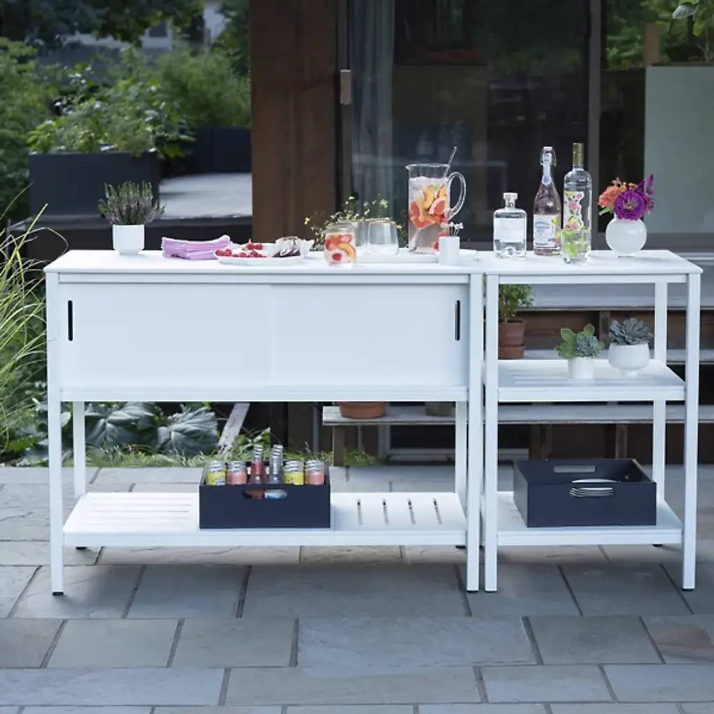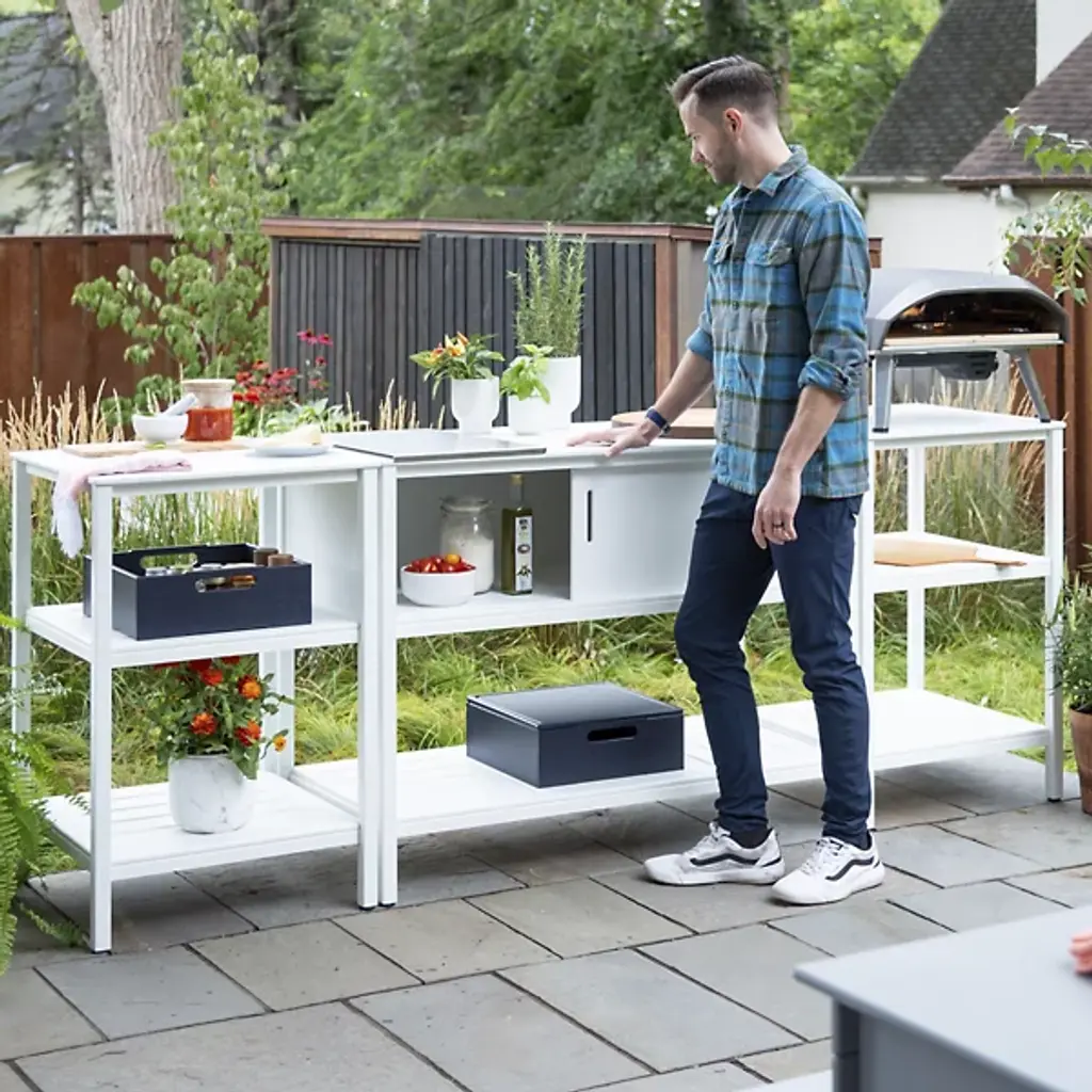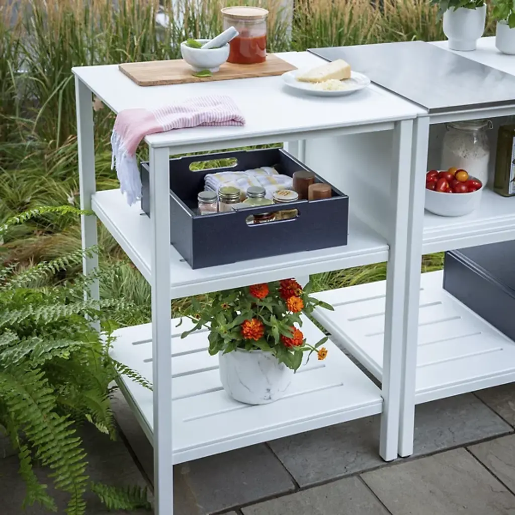 The A La Carte Square Open Outdoor Cubby from Loll Designs is an ideal modular storage solution for your outdoor kitchen. It features shelves designed to accommodate most common appliances. Place it next to a grill for convenient meal prep, or pair it with other A La Carte Cabinets to create ample storage or additional kitchen prep space. Its adjustable feet ensure stability on uneven surfaces, making customization effortless.