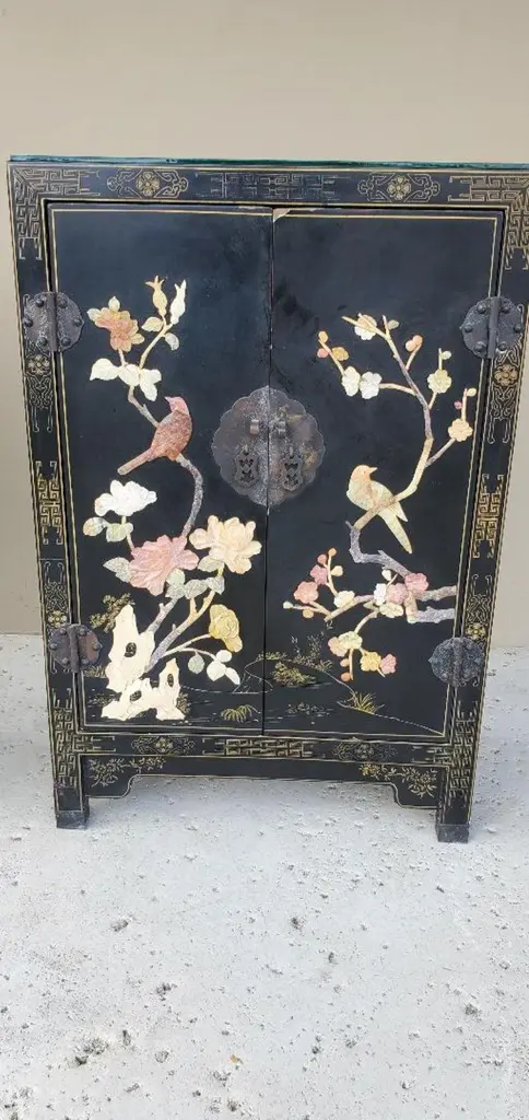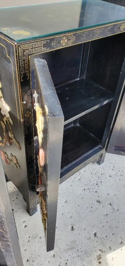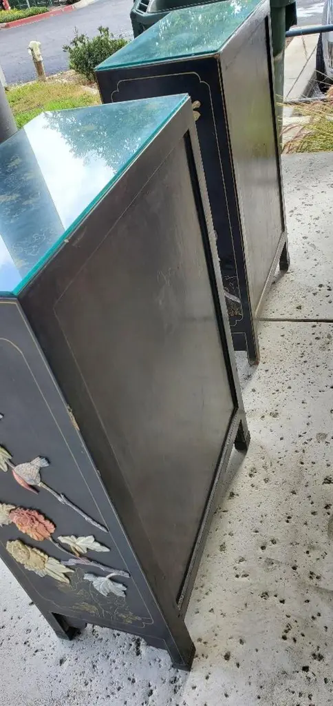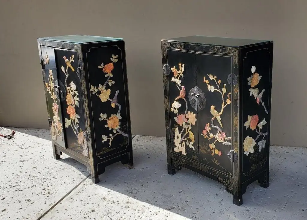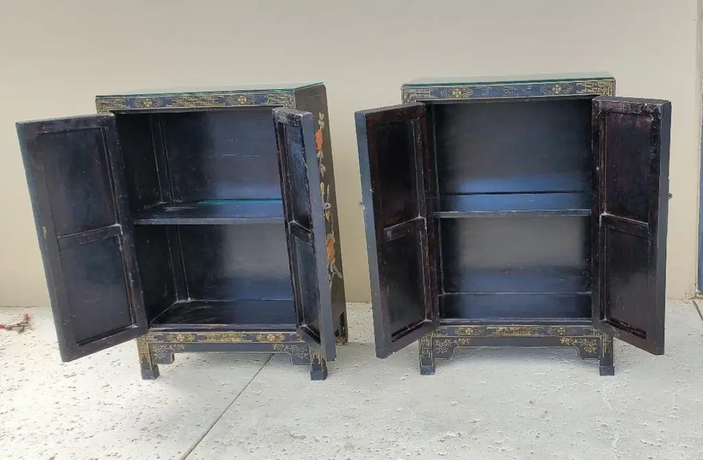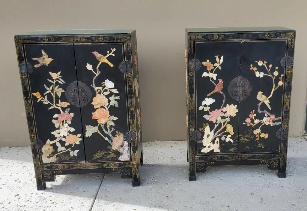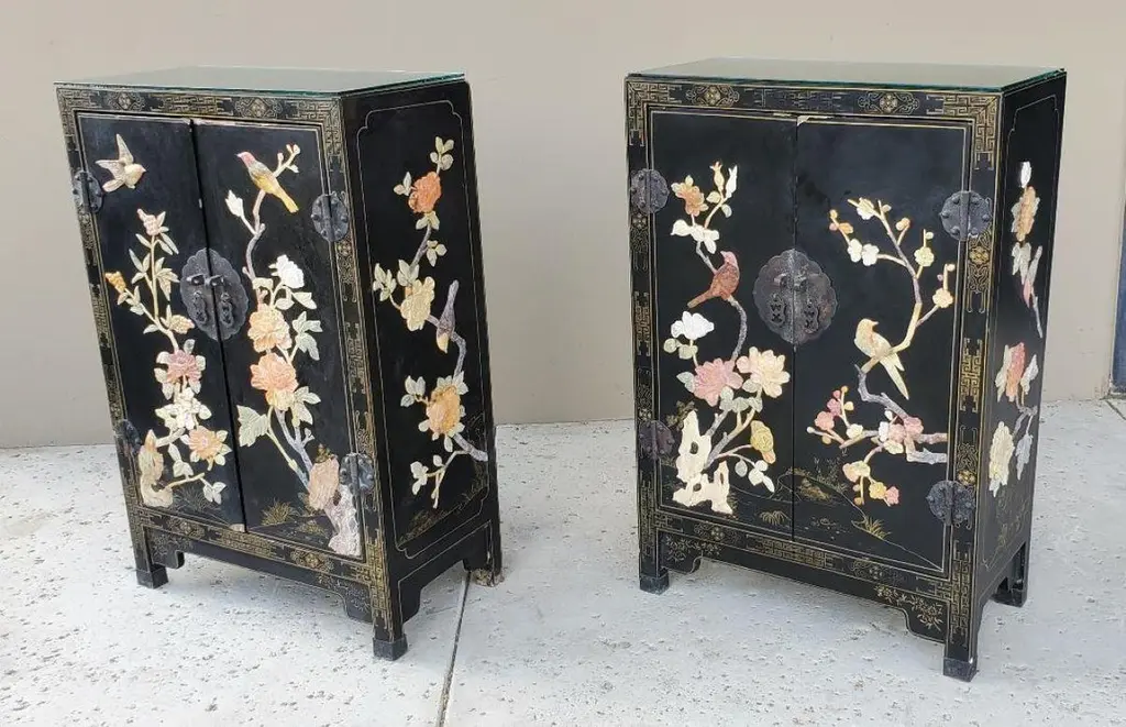 A Pair Of Antique Chinese Black Lacquered Wooden Cabinets With Hard Stone Inlay.These 2 Black Wooden Chinese Lacquered Cabinets Are Decorated With Hand Carved Multi-Colored Hard Stones. The Inlays Are Illustrating A Beautiful Array Of Birds Perched On Branches Of The Peony Flower Tree As Well As Birds In Flight. The Cabinets Are Painted With Gold Trimming On All 3 Sides With Brass Hardware Including Brass Caps On Cabinet Legs And Glass Tops To Each Cabinet.The Cabinets Are Strong And Sturdy Yet Show Signs Of Age And Use.There Are Some Chipping And Cracking In The Lacquer Here And There Please See Multiple Pics. There Is A Brass Cap Missing On Cabinet 1 In The Back As Well As Partial Missing Brass Hinge (See Pic).The Double Door Cabinets Have It's Original Lock Plates But No Keys Or Locks Are Available.Dimensions Are:36.25 Inches Tall24.35 Inches Wide12.25 Inches Deep