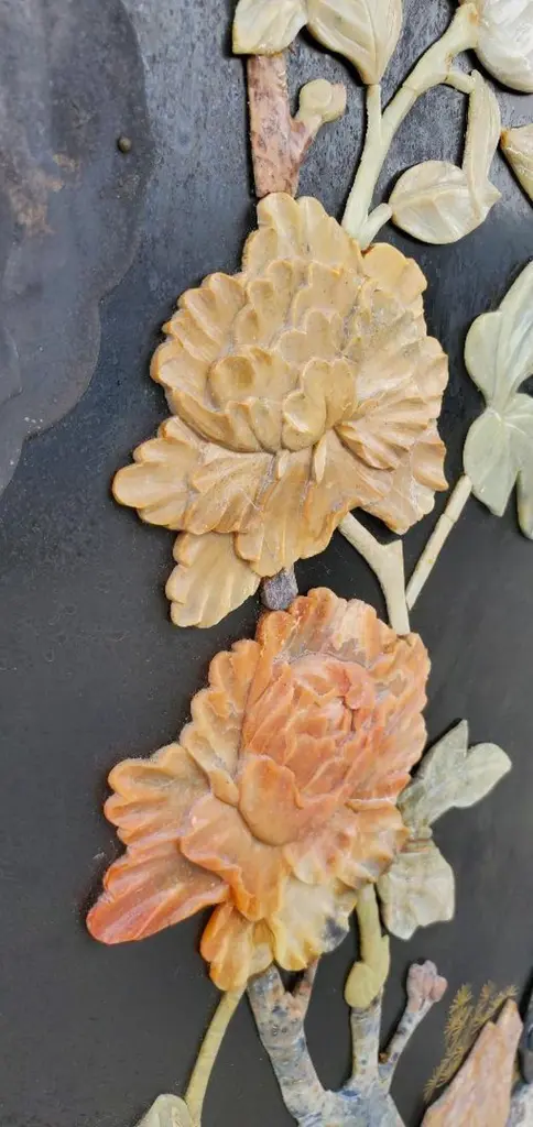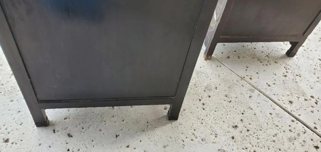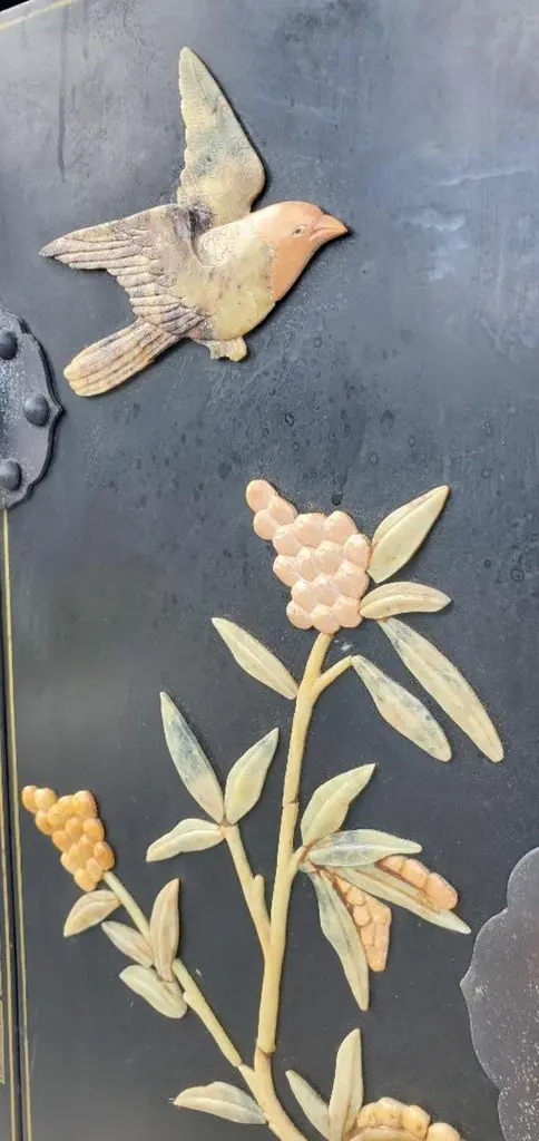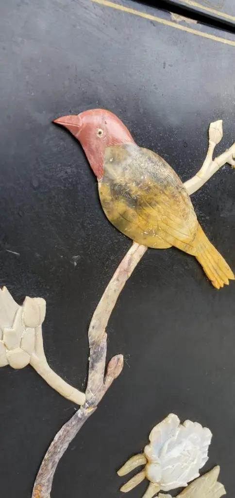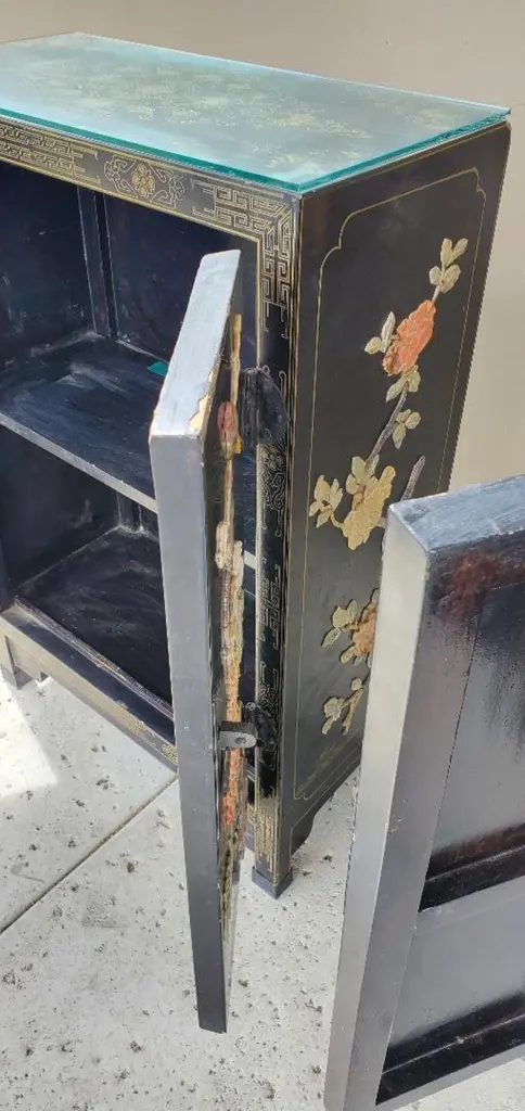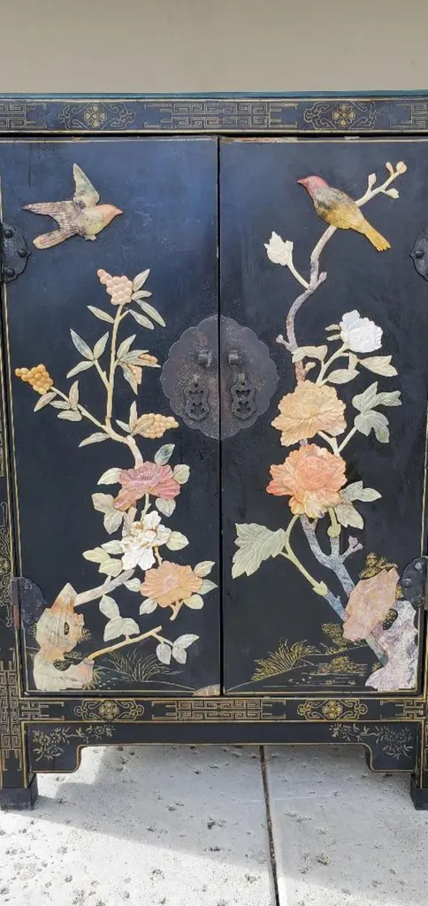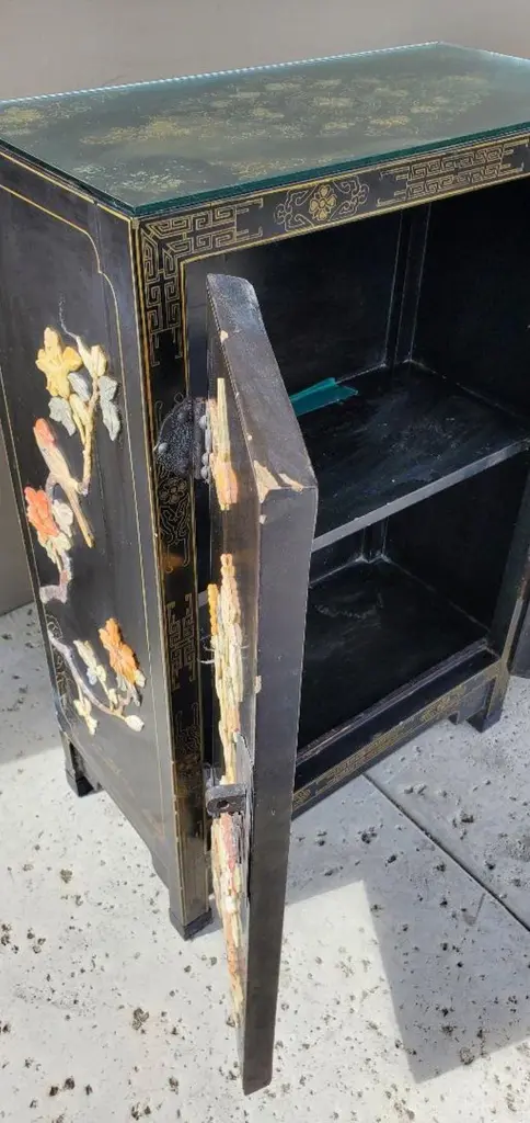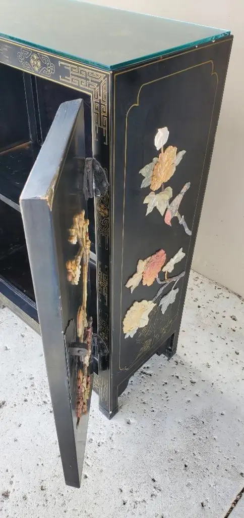 A Pair Of Antique Chinese Black Lacquered Wooden Cabinets With Hard Stone Inlay.These 2 Black Wooden Chinese Lacquered Cabinets Are Decorated With Hand Carved Multi-Colored Hard Stones. The Inlays Are Illustrating A Beautiful Array Of Birds Perched On Branches Of The Peony Flower Tree As Well As Birds In Flight. The Cabinets Are Painted With Gold Trimming On All 3 Sides With Brass Hardware Including Brass Caps On Cabinet Legs And Glass Tops To Each Cabinet.The Cabinets Are Strong And Sturdy Yet Show Signs Of Age And Use.There Are Some Chipping And Cracking In The Lacquer Here And There Please See Multiple Pics. There Is A Brass Cap Missing On Cabinet 1 In The Back As Well As Partial Missing Brass Hinge (See Pic).The Double Door Cabinets Have It's Original Lock Plates But No Keys Or Locks Are Available.Dimensions Are:36.25 Inches Tall24.35 Inches Wide12.25 Inches Deep