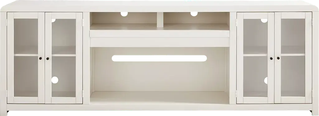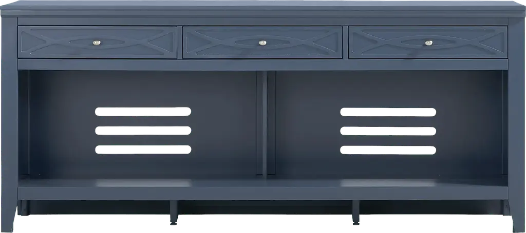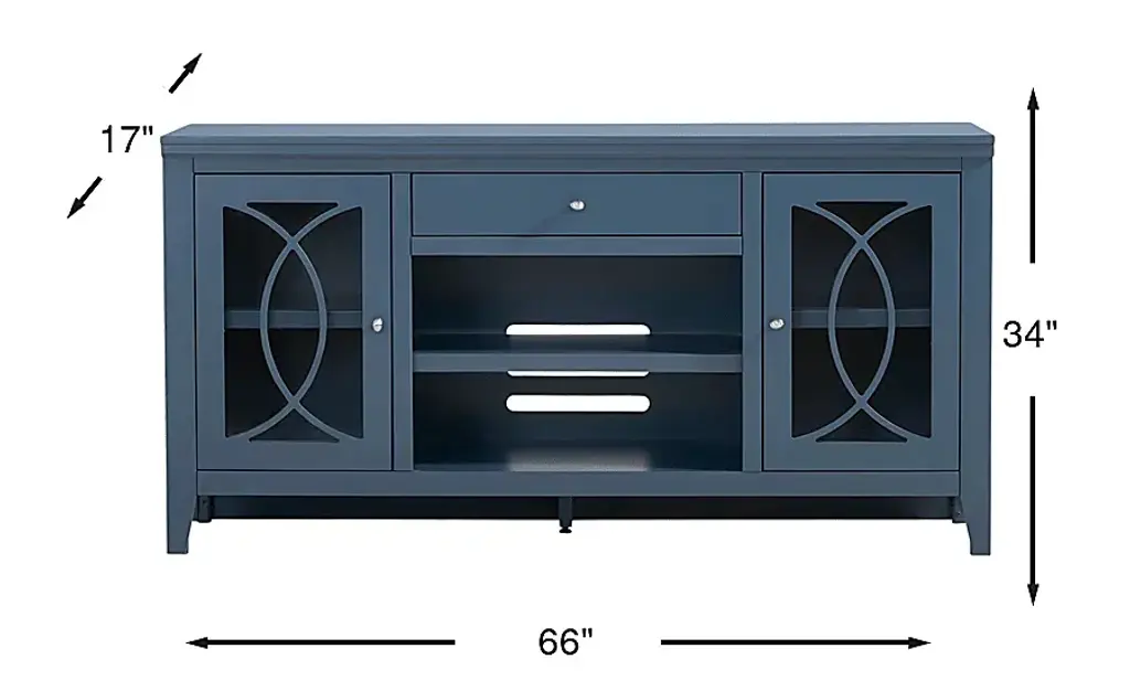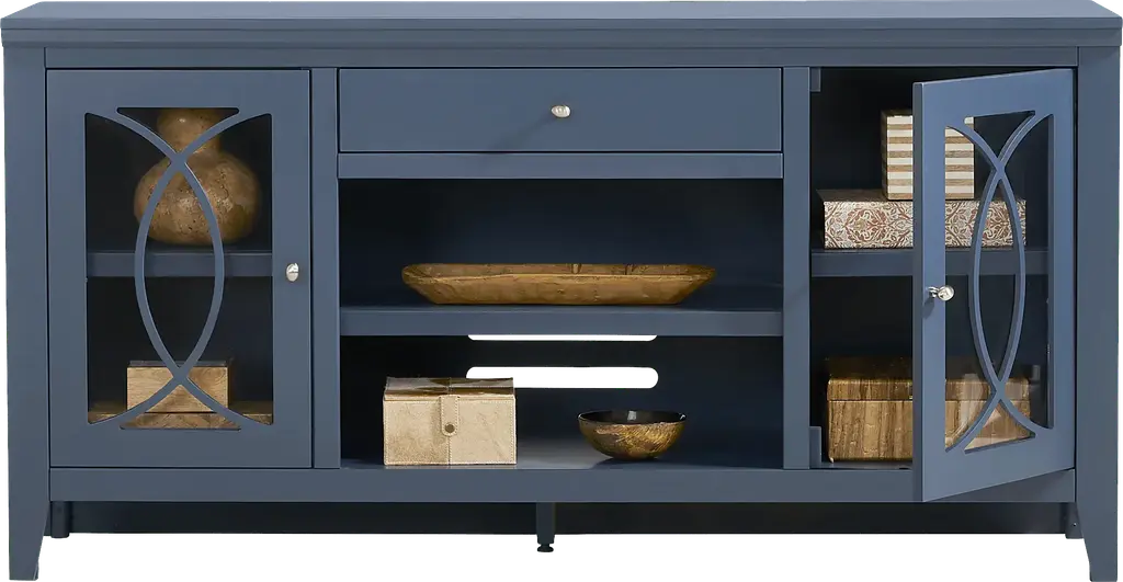 Bring sleek style and smart storage to your living room with the Abbie II console. Featuring a gorgeous blue finish, this console features a wide center drawer for essentials, two open shelves with cutouts for easy cord management and a pair of glass-front cabinets on each side. Each cabinet includes an interior shelf, making it easy to organize and display electronics, decor and more. Brushed silver hardware and geometric glass overlay detailing add a touch of contemporary elegance to this versatile storage solution.