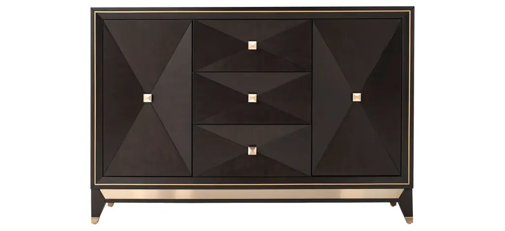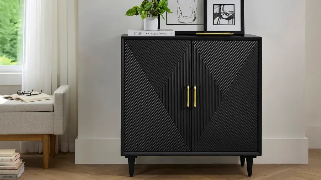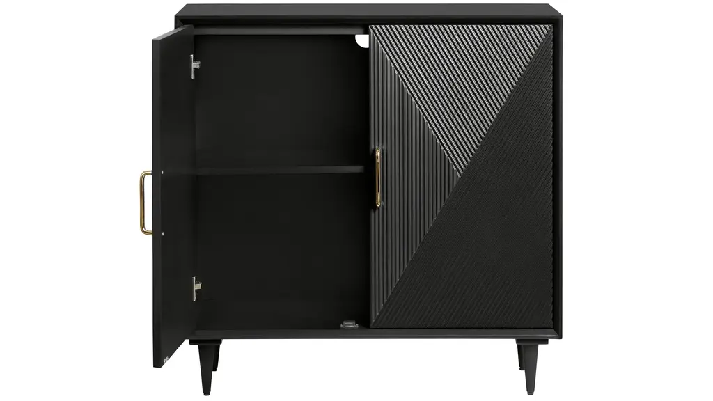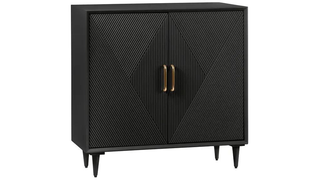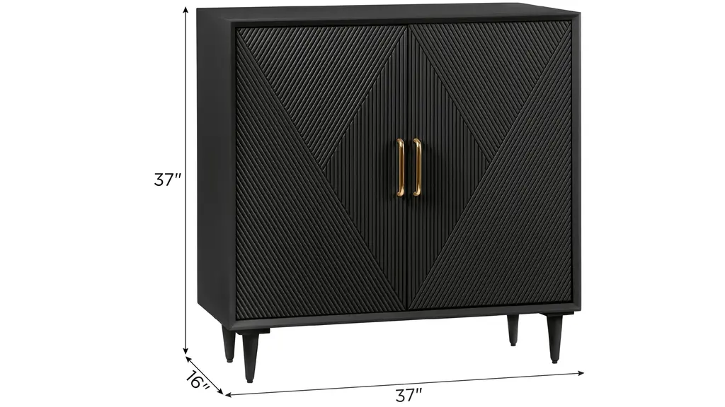 Discover chic functionality with the bold and modern Abella Accent Cabinet. Featuring a sleek, textured geometric design in your choice of deep, rich hues. This piece brings a touch of contemporary luxury to any room. The enclosed interior provides plenty of storage space; while striking gold metal door pulls and slim legs are the refined finishing touches.