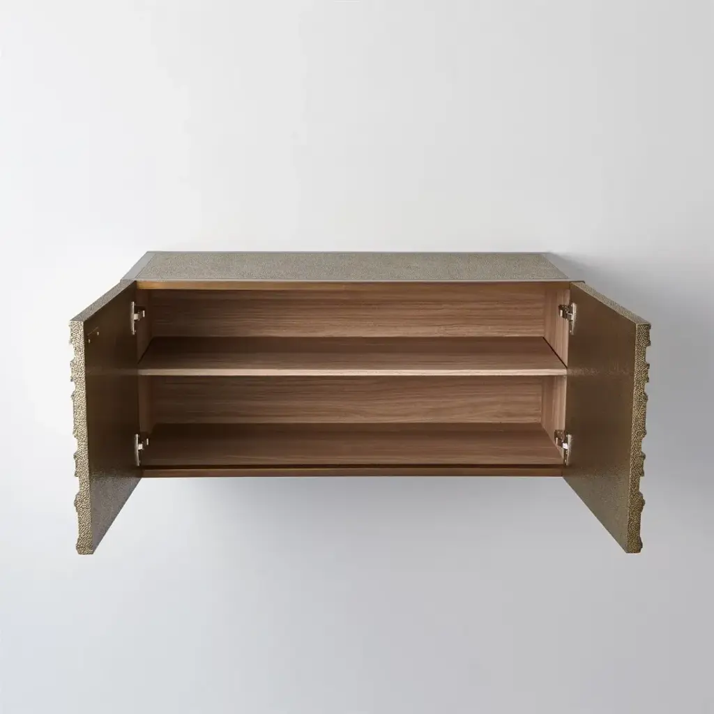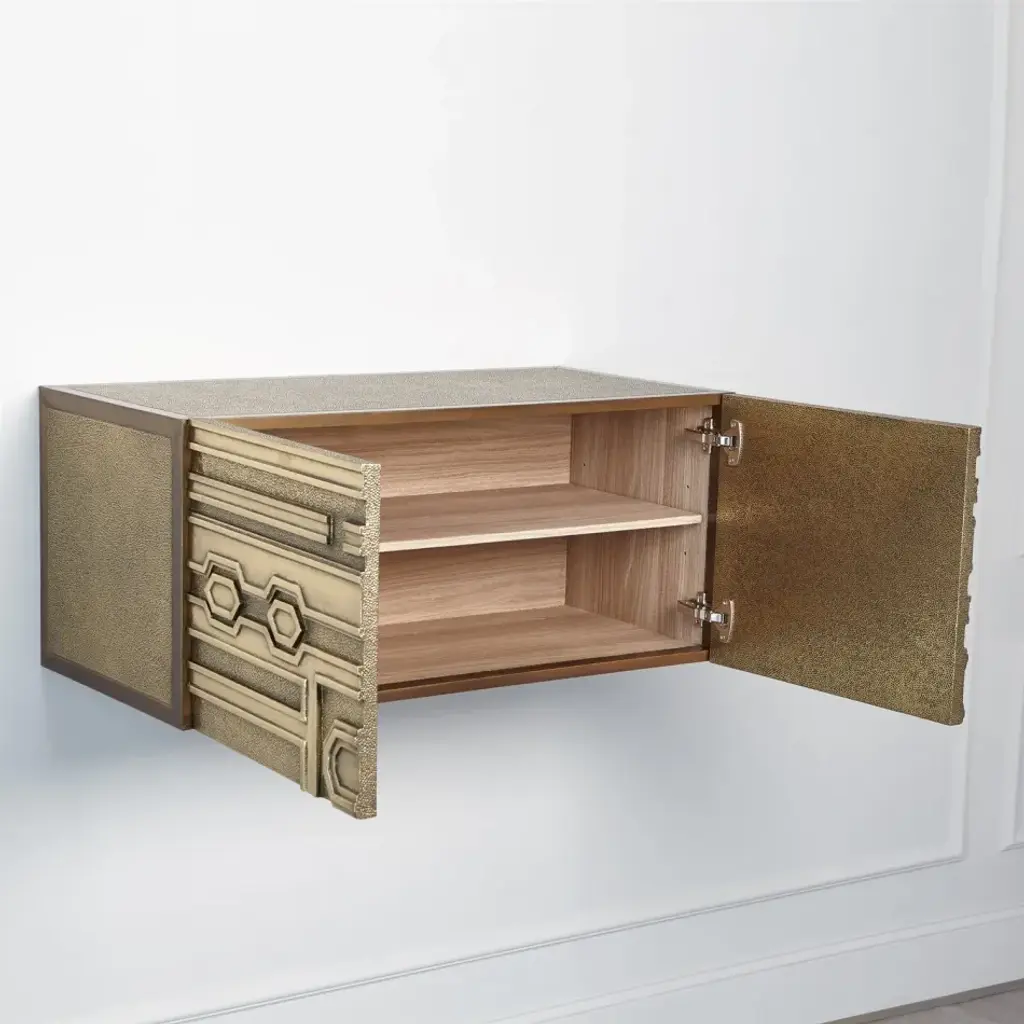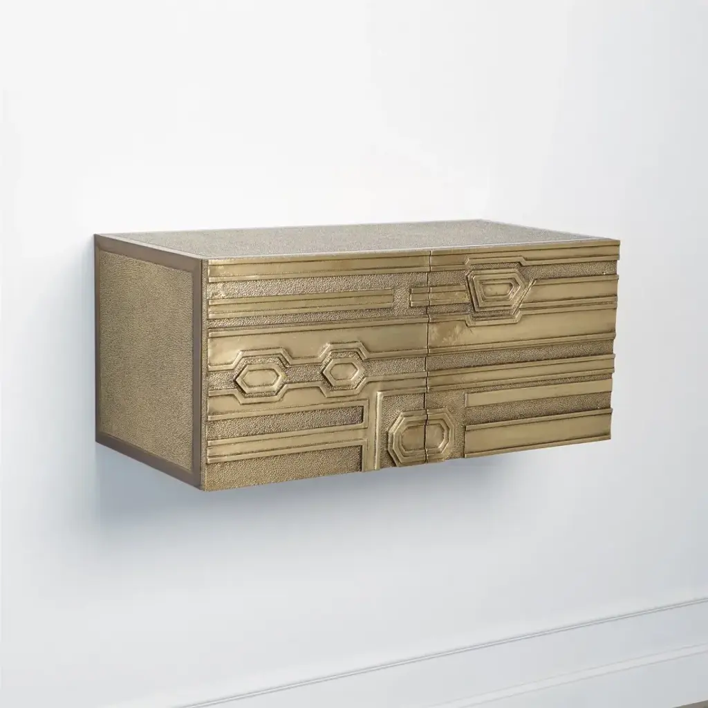 The Abstract Block Cabinet is made of wood and covered in a metal sheet with a protective coating. It features a postmodern geometric relief pattern. The floating cabinet offers an adjustable shelf that can be removed for ample storage. From a fashion forward perspective, Global Views offers accessories, furniture, statement lighting, and an assortment of rugs and mirrors to add beauty and joy to your home.