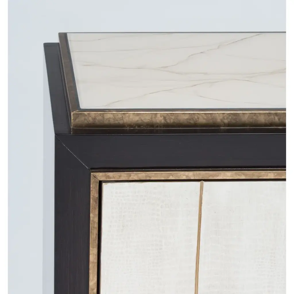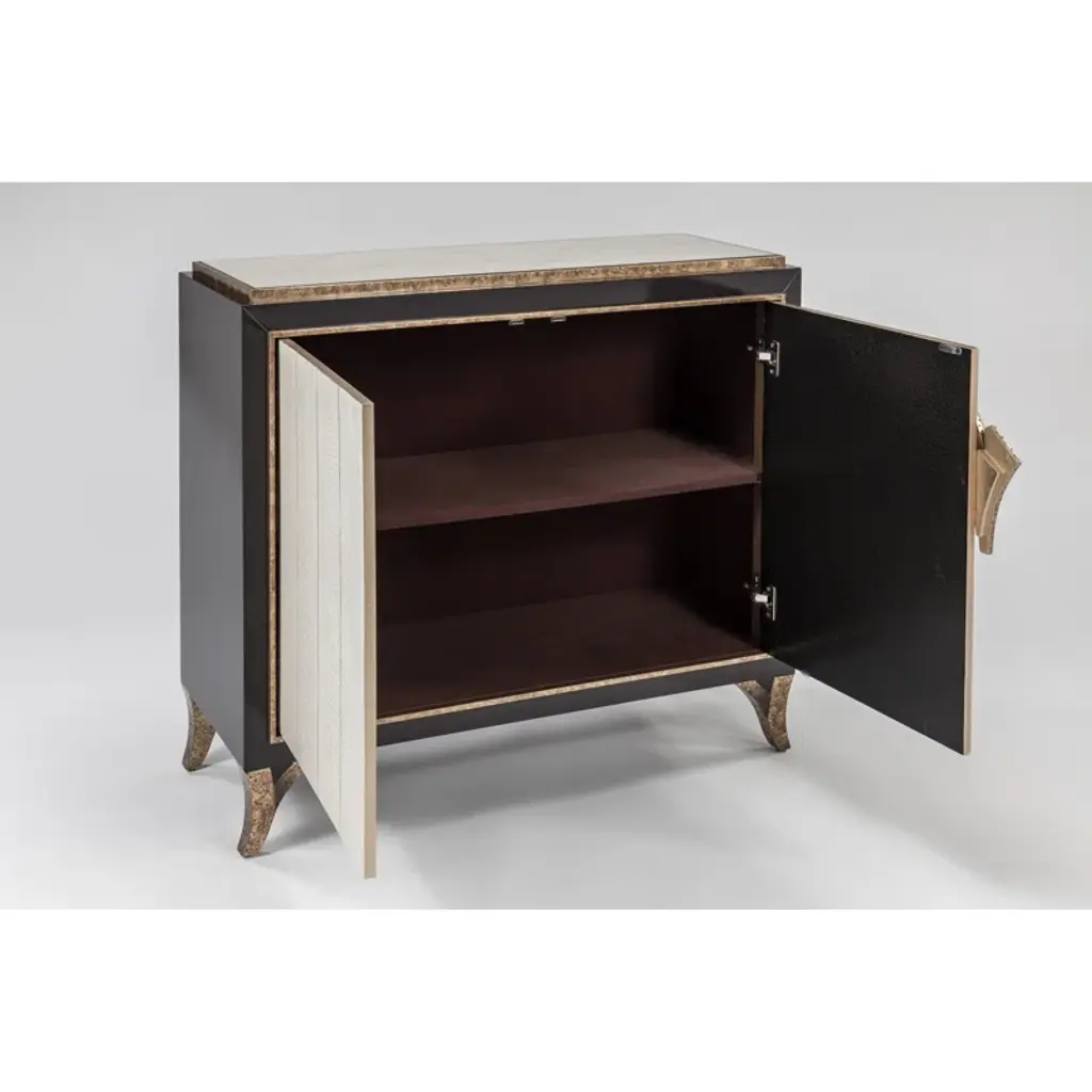 Espresso with antiqued worn gold legs, trims, and door pull. Door front in faux leather vanilla beige finish.