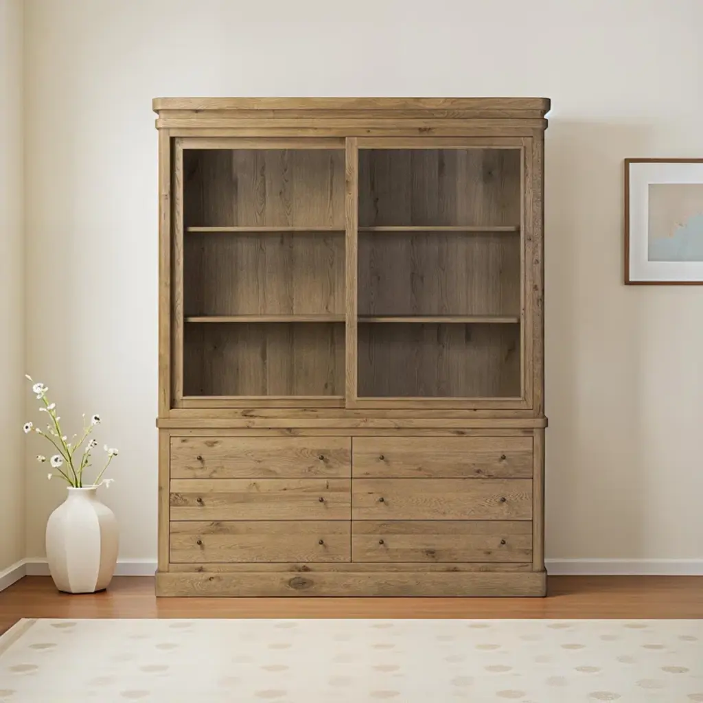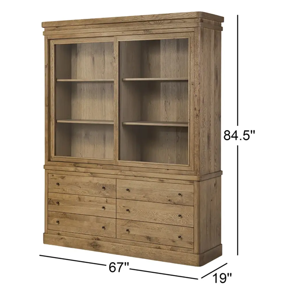 Large, traditional cabinetry of honey-finished oak brings a timeless look — and plenty of storage — to any room in the house. Sliding glass doors modernize this heritage-inspired piece, so you can style your favorite books and belongings. Six roomy drawers create endless storage possibilities for your space.