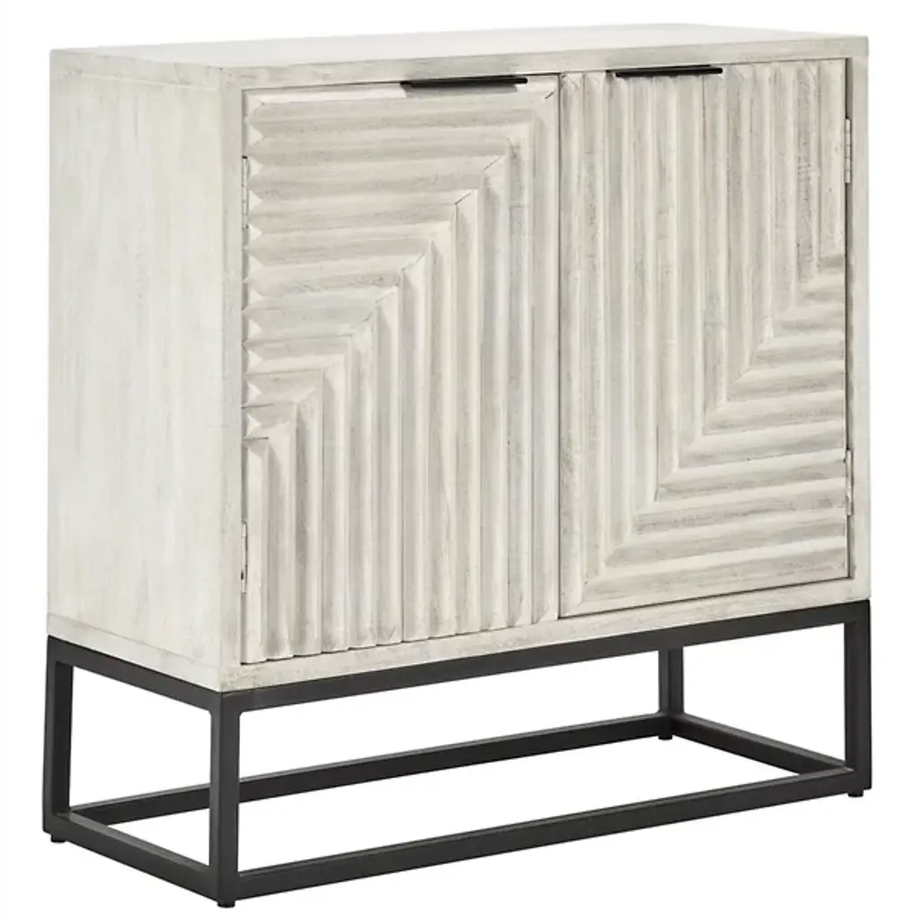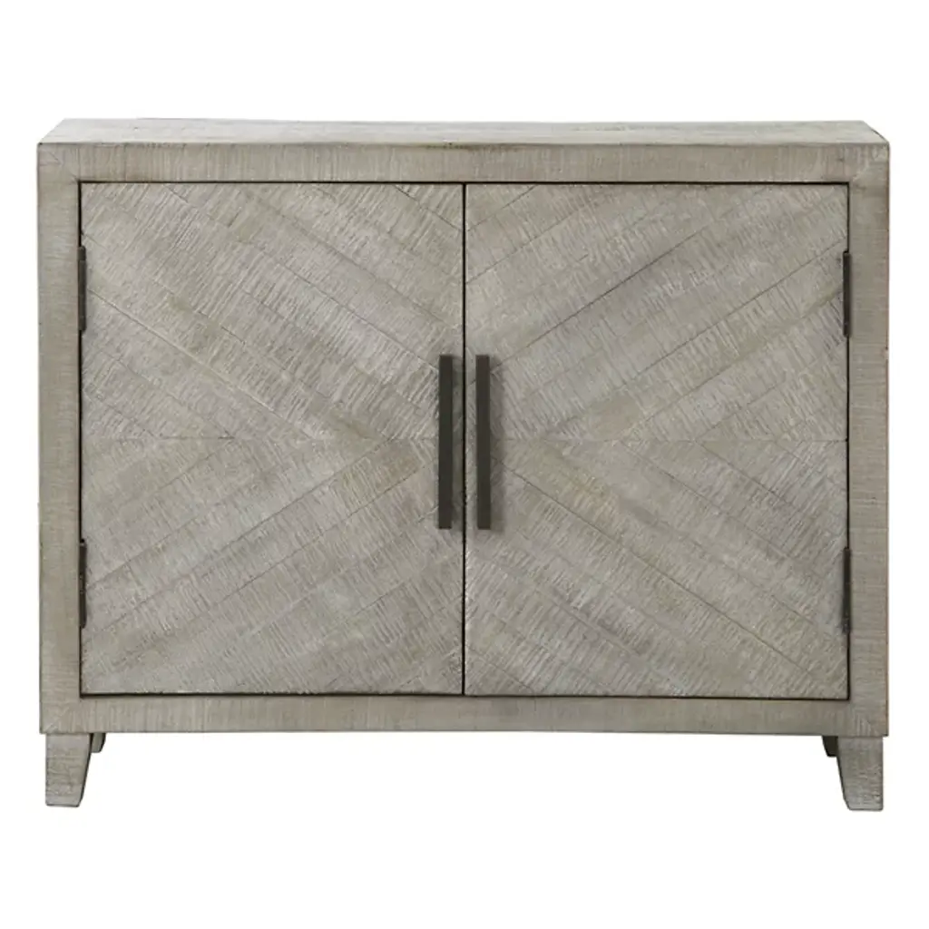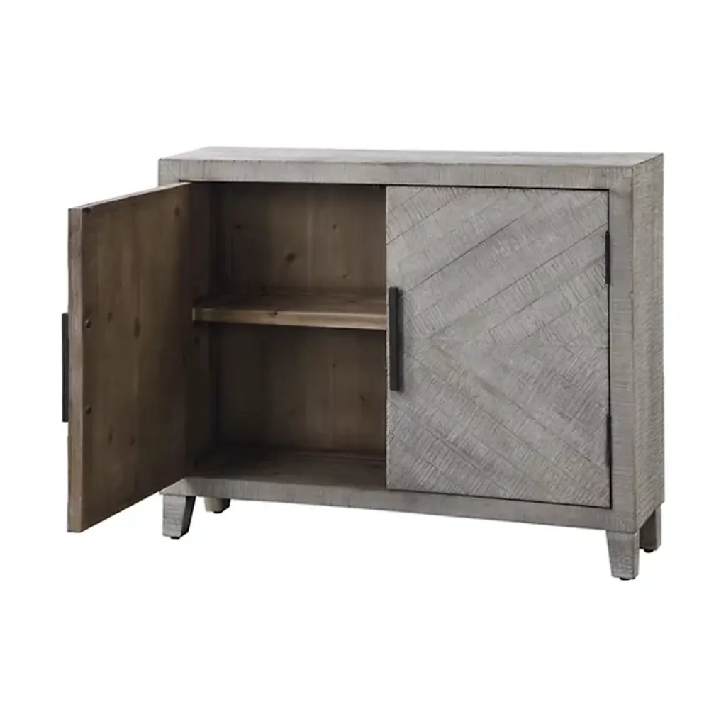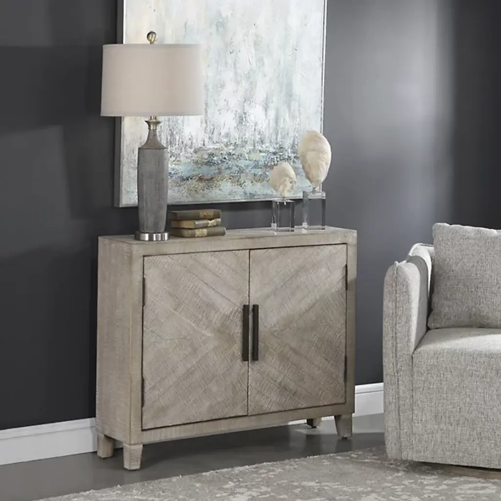 Transform your living space with the casual charm of the Adalind 2 Door Cabinet from Uttermost. Designed by Carolyn Kinder, this modern farmhouse cabinet is made from textured fir wood with linear accents, treated with a white-washed glaze boasting subtle undertones. Its antique iron door pulls add a touch of vintage intricacy, opening to reveal a single fixed shelf within. Crafted from a blend of fir wood and MDF and accented with iron pulls, each piece exudes artisanal characteristics, becoming the embodiment of rustic modern style.
