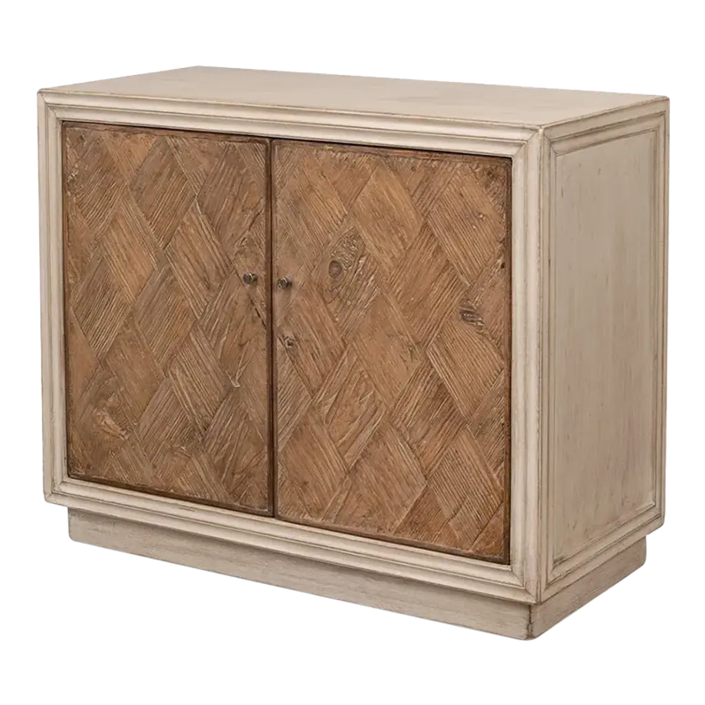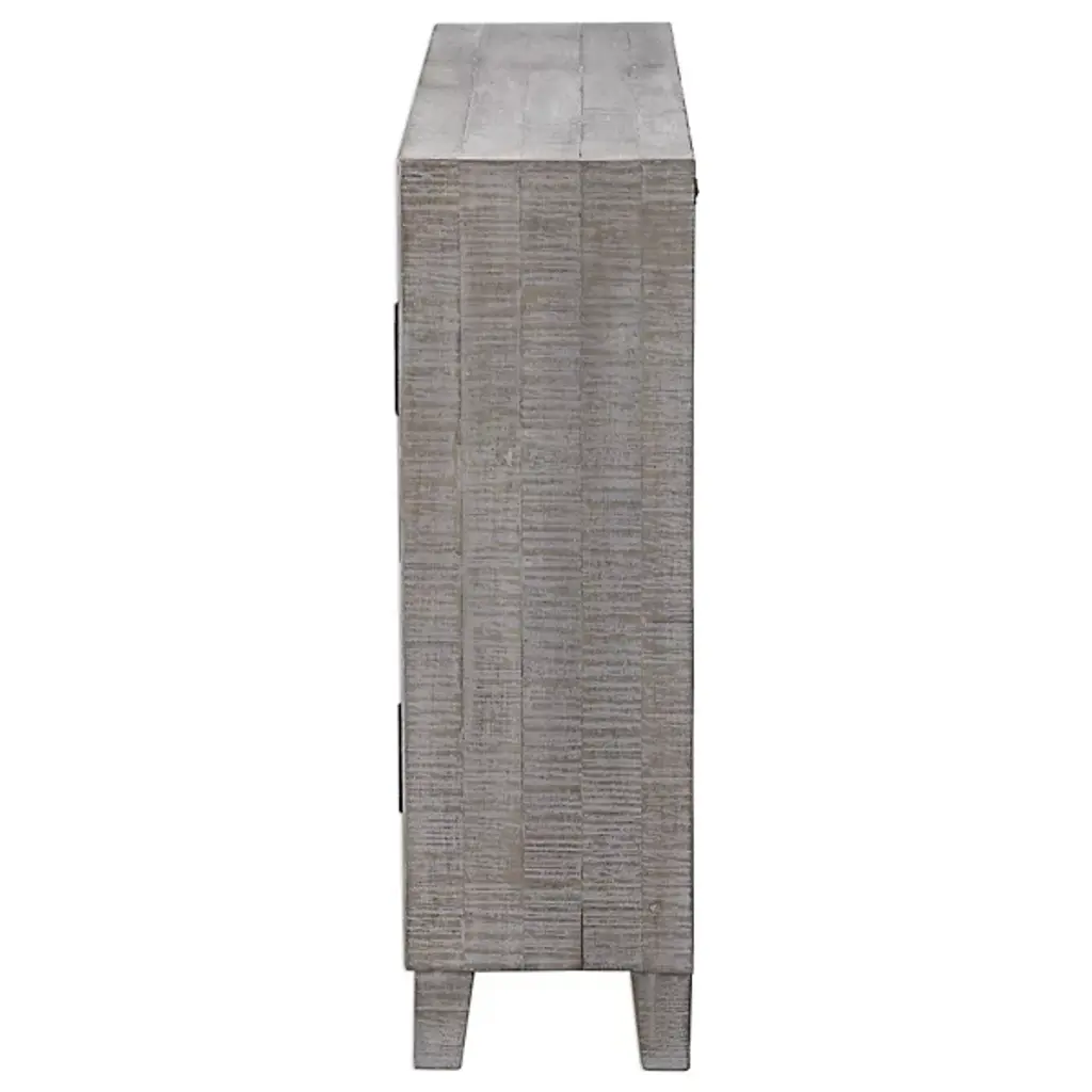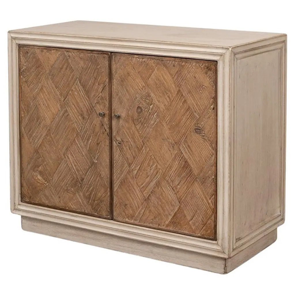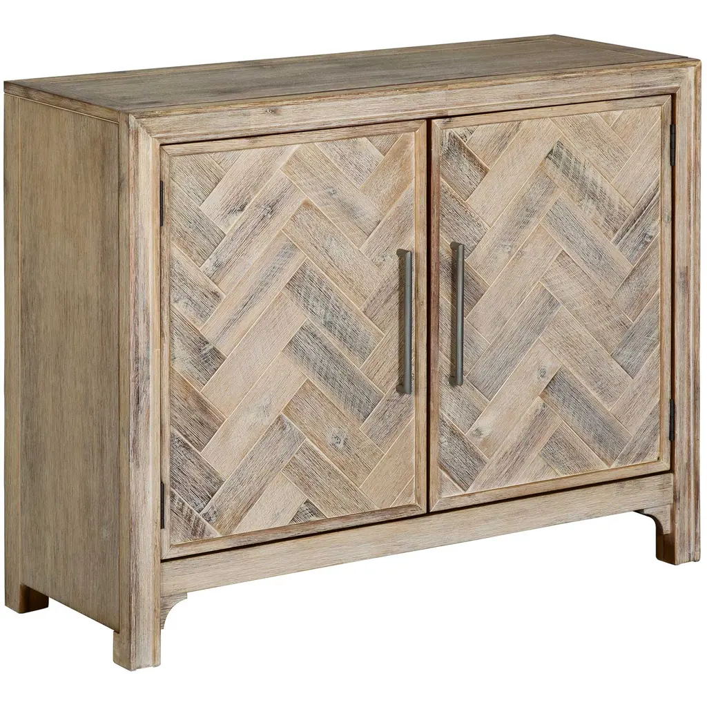 Transform your living space with the casual charm of the Adalind 2 Door Cabinet from Uttermost. Designed by Carolyn Kinder, this modern farmhouse cabinet is made from textured fir wood with linear accents, treated with a white-washed glaze boasting subtle undertones. Its antique iron door pulls add a touch of vintage intricacy, opening to reveal a single fixed shelf within. Crafted from a blend of fir wood and MDF and accented with iron pulls, each piece exudes artisanal characteristics, becoming the embodiment of rustic modern style.