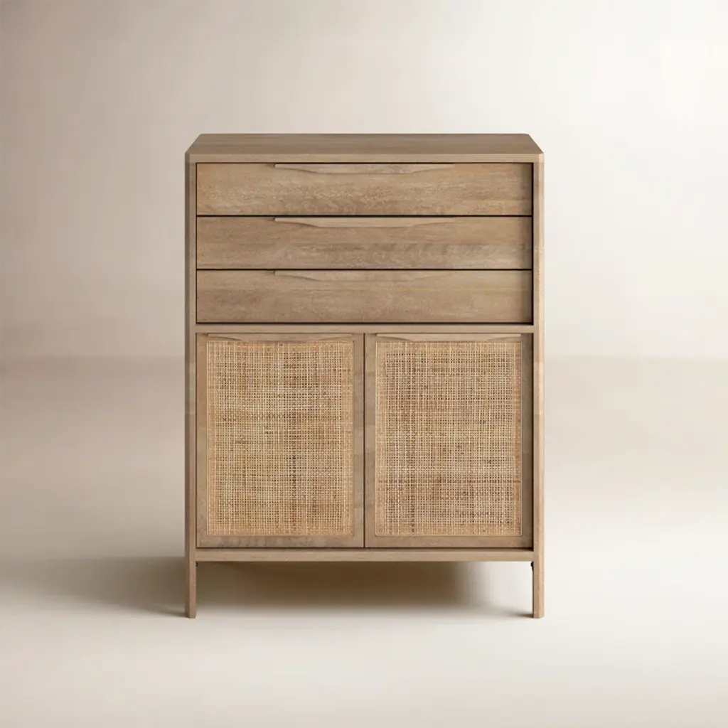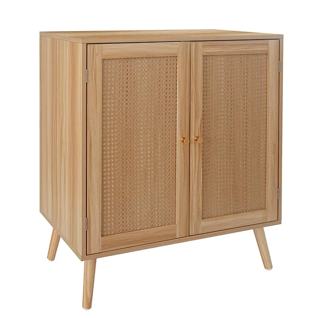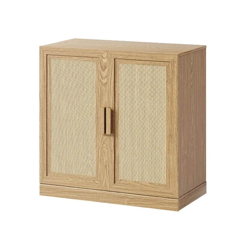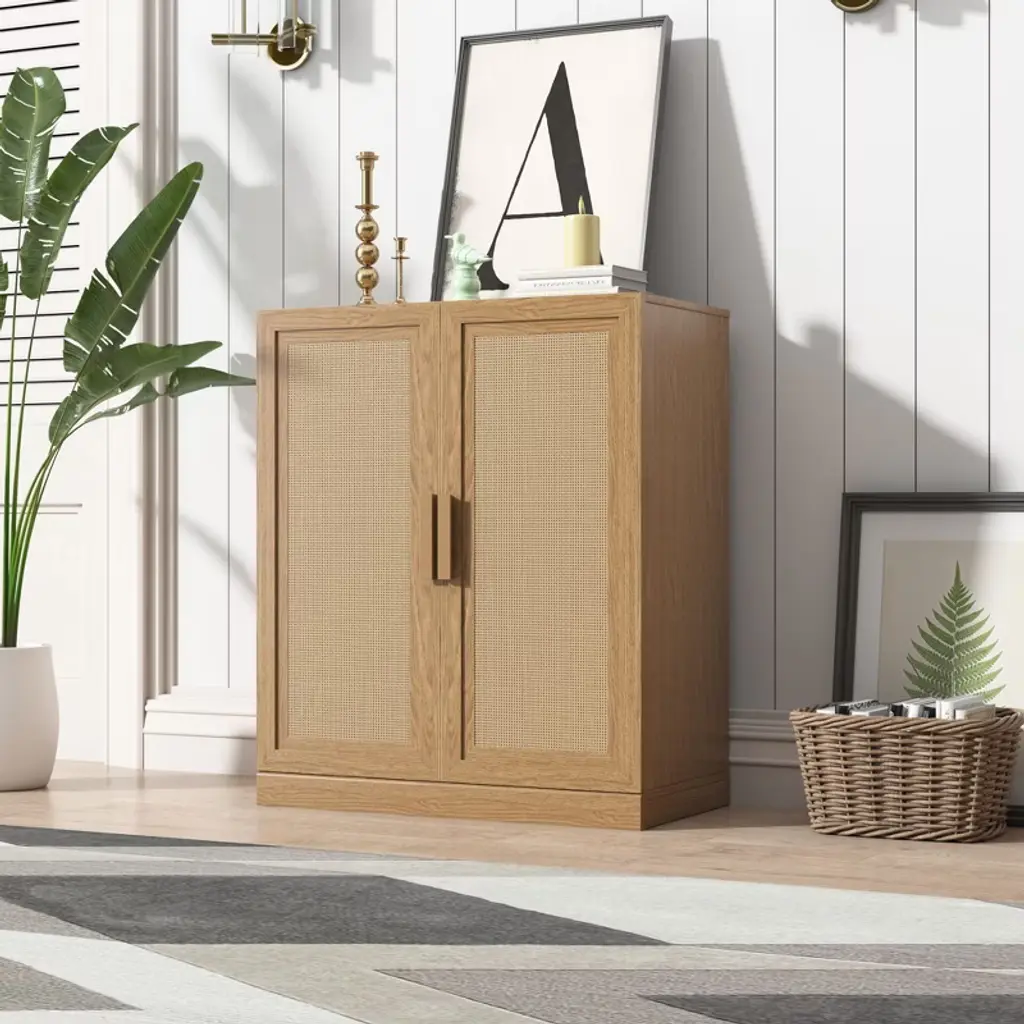 This cabinet showcases a beautiful natural wood grain finish that brings warmth and a touch of nature to any room. The double opening wicker doors not only provide easy access to the spacious interior but also add a rustic, textured element to the design. Whether you need extra storage in your living room, bedroom, or hallway, this cabinet offers a perfect blend of functionality and appealing aesthetics. Its versatile design complements various decor styles, making it a valuable and attractive addition to your home.