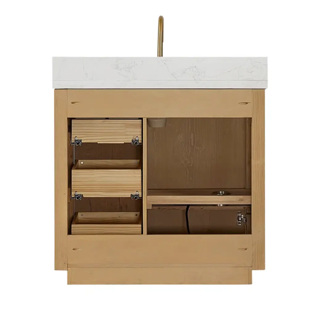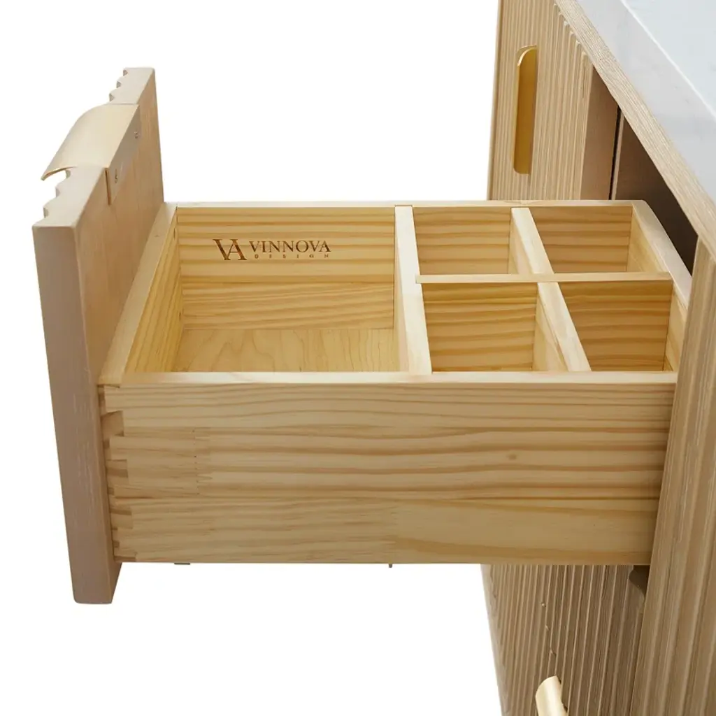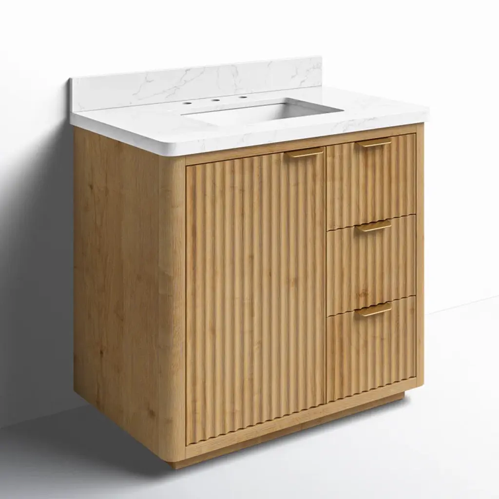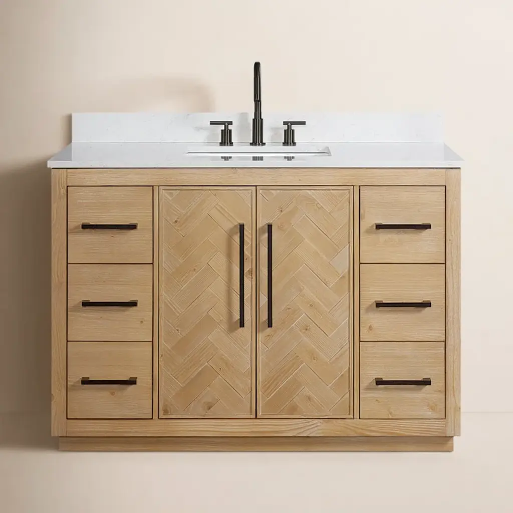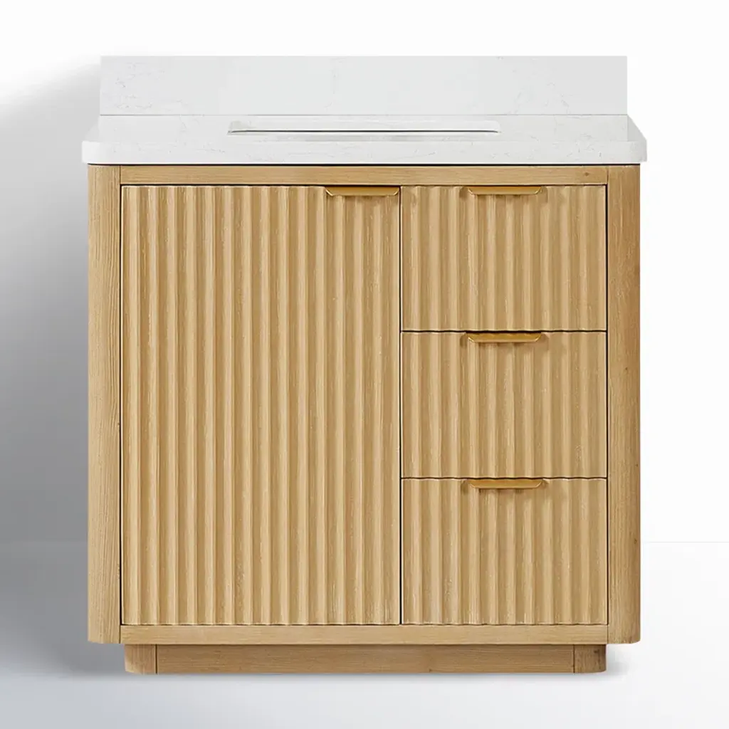 Our Thistle vanity embodies exemplary craftsmanship, featuring premium materials like solid oak hardwood that lends spectacular beauty and durability. The corrugated cabinet and drawer fronts have a rustic distressed finish that sets off the sleek, modern countertop. Deep, spacious cabinets and drawers with adjustable organizer inserts make the Thistle vanity a storage superstar, some models include integrated power/USB outlets and a hair dryer organizer, creating the perfect spot for your grooming routine (does not apply to all vanity sizes).