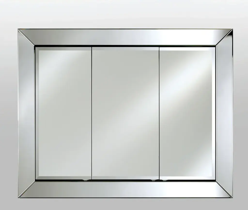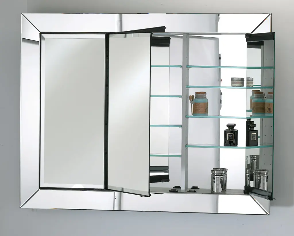Gray Satin Anodized Aluminum Construction (will not rust or corrode).Pivot Door System (no visible hinges)Recessed or OPTIONAL Surface Mount3 Mirror Design3/8" Tempered High Polished Glass Shelves
