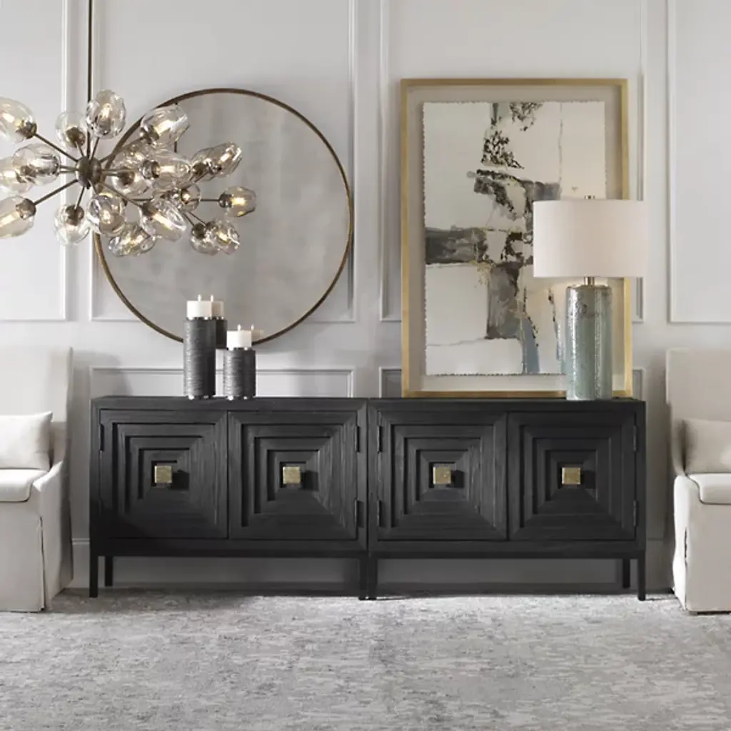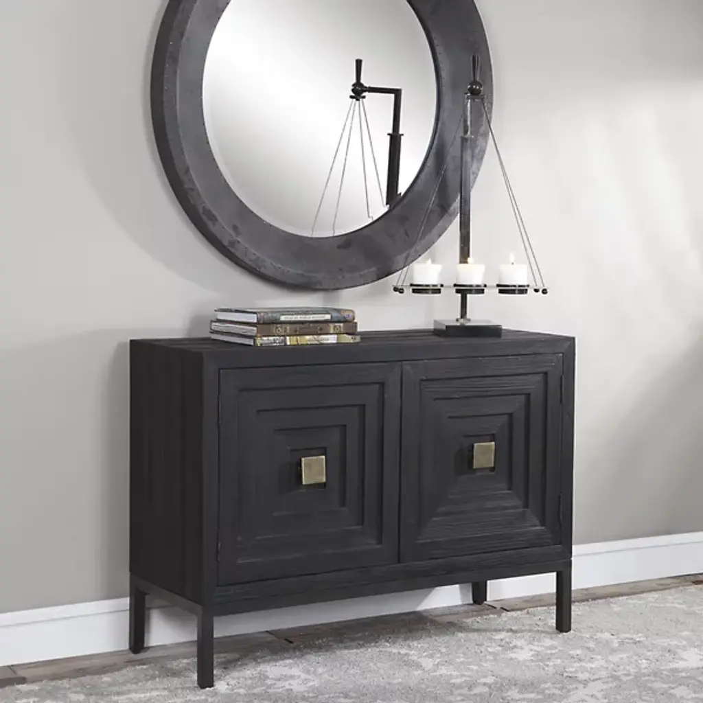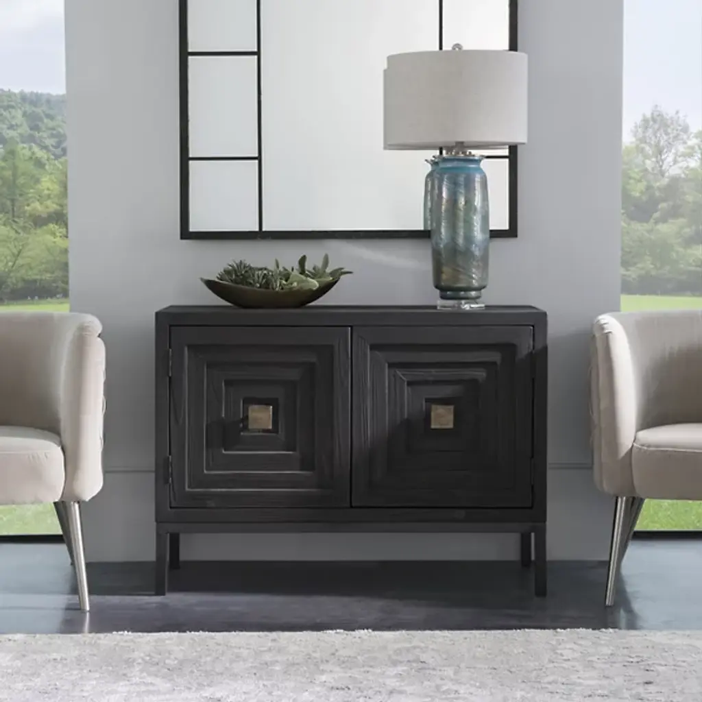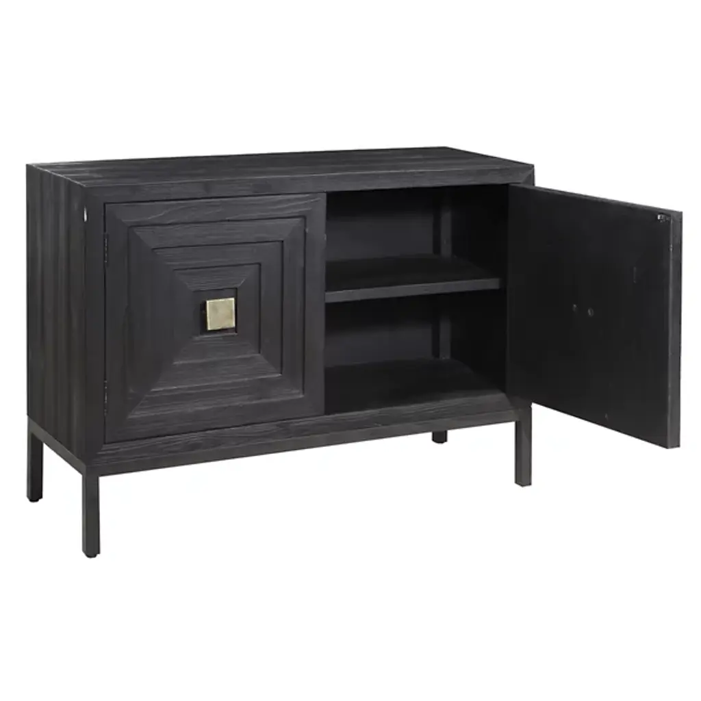 Give your home a mid-century modern look with the Aiken Cabinet by Uttermost. Iron is used throughout your cabinet’s composition, giving this piece its durability. This cabinet takes on a rectangular shape and boasts a flat top for the display of your valued mementos. The front of the Aiken Cabinet showcases a geometric design featuring progressively expanding square frames. This cabinet has two storage shelves and two doors. Individual pulls let give you easy access to your possessions.