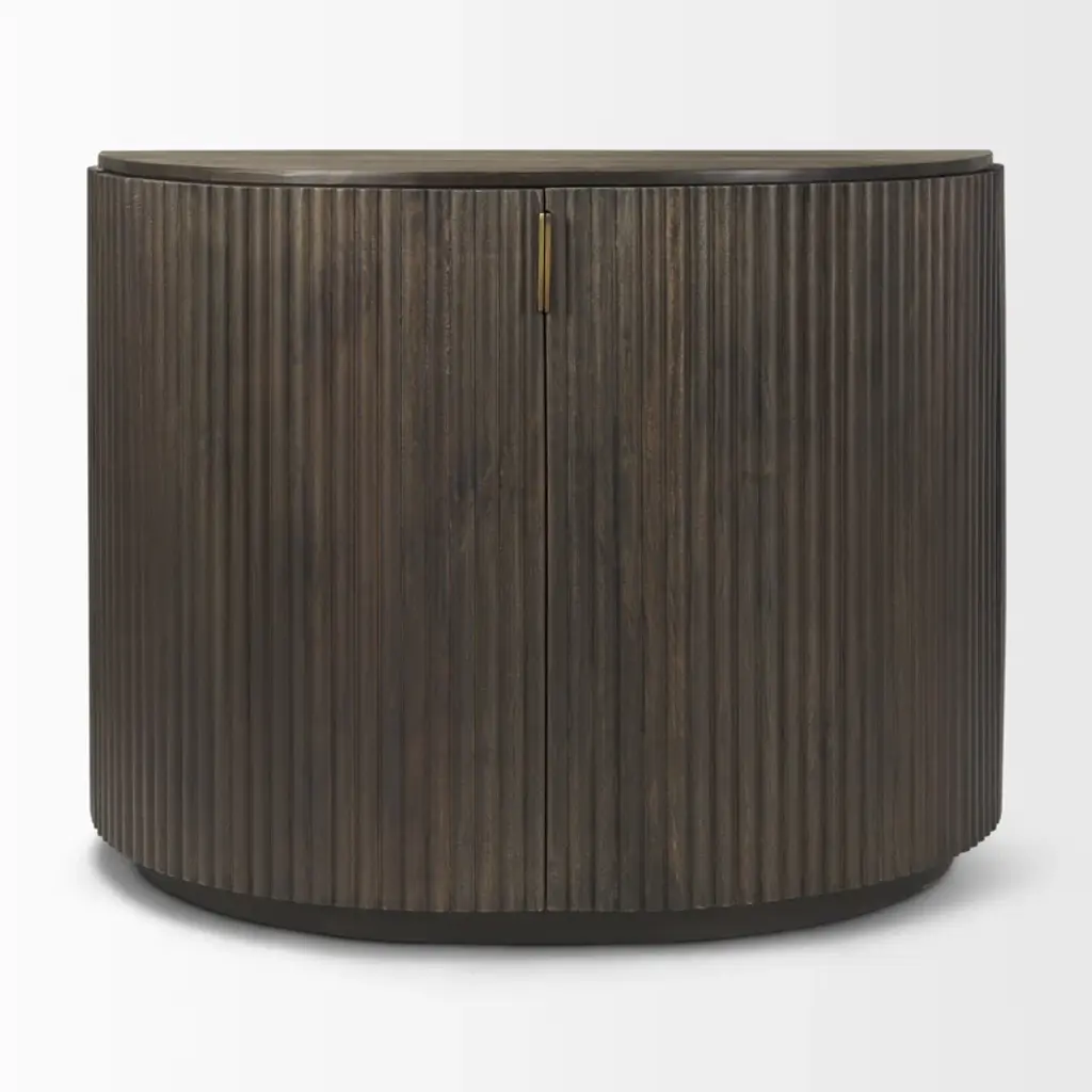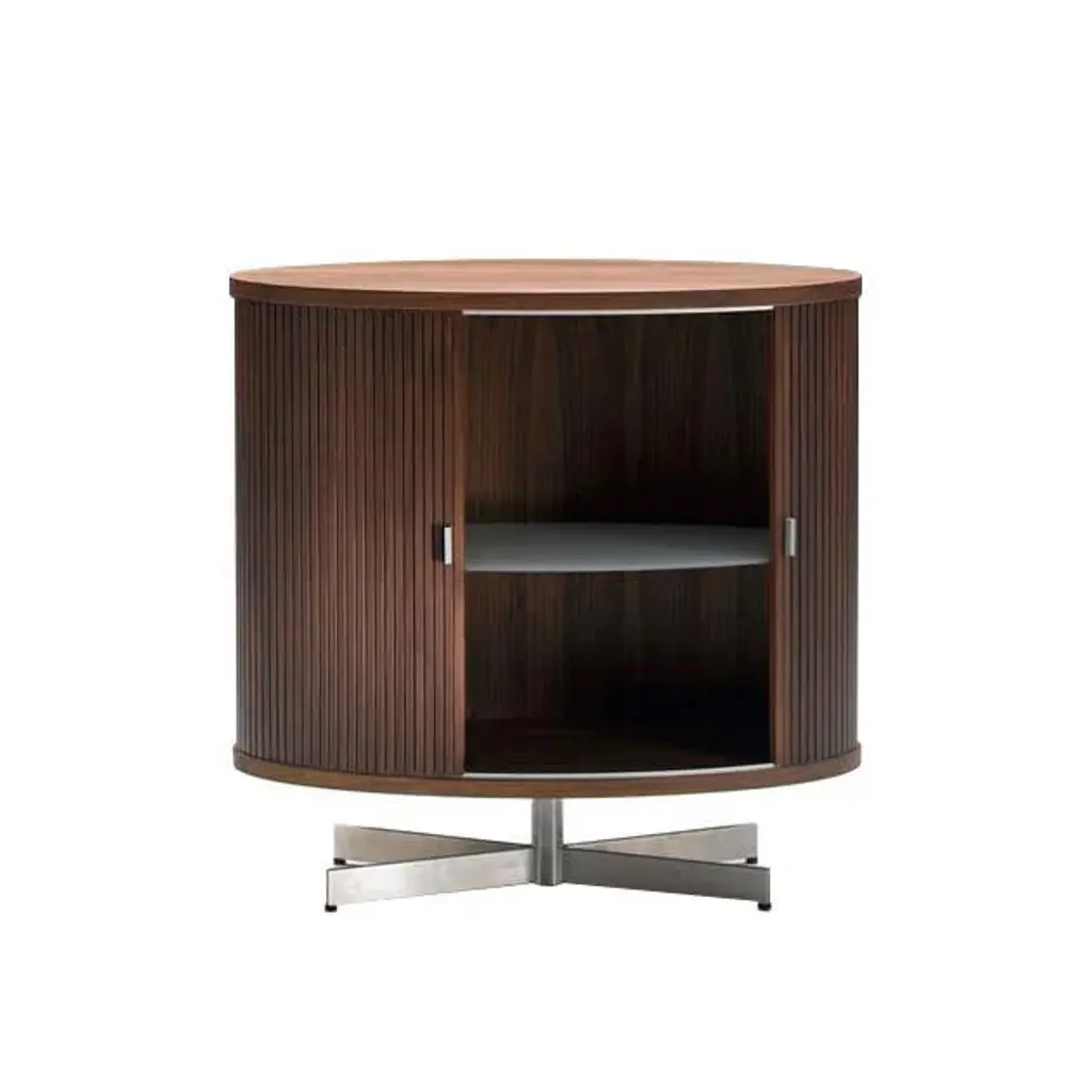 AK1365 Cabinet Designer: Nissen & Gehl MDD Manufactured by: Naver Collection Aero TV unit in wood and with stainless steel base featuring a modern design with tambour doors. Behind the doors you will find useful storage for DVD, electrical wiring, etc.