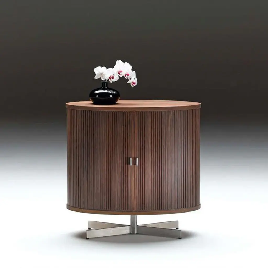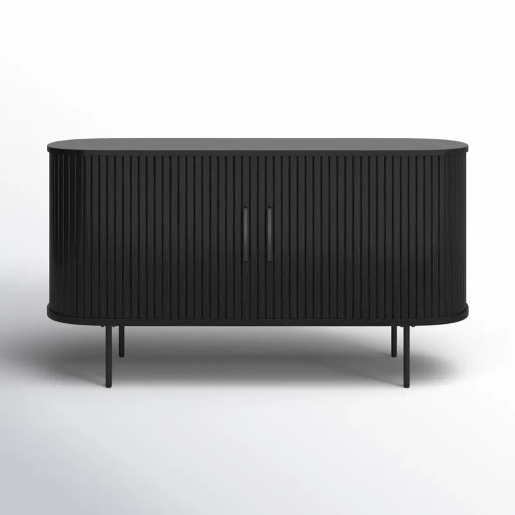 AK1365 Cabinet Designer: Nissen & Gehl MDD Manufactured by: Naver Collection Aero TV unit in wood and with stainless steel base featuring a modern design with tambour doors. Behind the doors you will find useful storage for DVD, electrical wiring, etc.