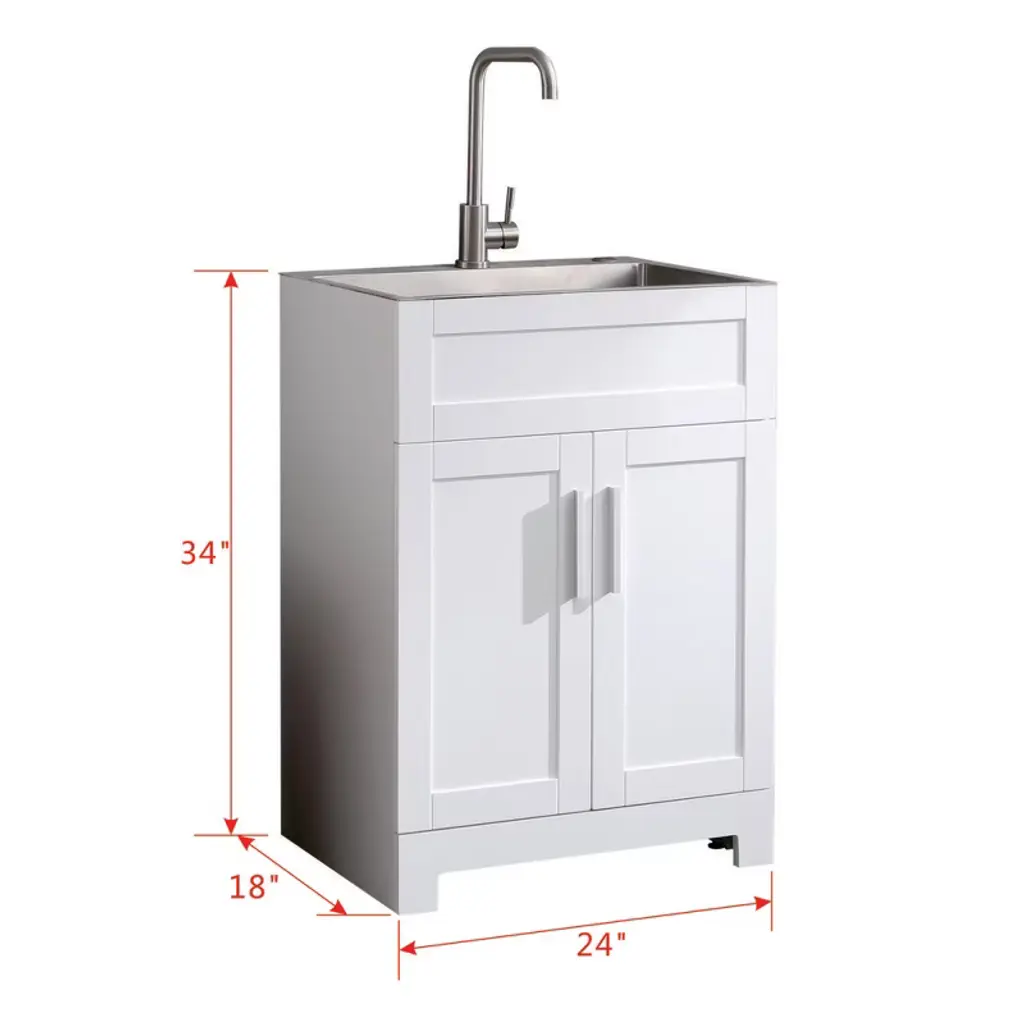 This 24-inch white painted free laundry sink cabinet takes ¡°small space, big function + durable aesthetics¡± as its core, skillfully integrating the practical laundry area with the exquisite storage cabinet, becoming the ¡°invisible storage master¡± in the corner of the laundry room, bathroom or kitchen. Its biggest highlight is the white paint cabinet + stainless steel combination of dual material design - white cabinet body using environmentally friendly water-based paint technology, presenting a pure and flawless cream texture, not only with all types of home decorating styles (Scandinavian, modern, cream wind) easy to match, but also comes with a "clean sense of filter! "so that the laundry area to say goodbye to clutter; with stainless steel components (such as sink frame, support bracket, shelves) to strengthen the moisture and corrosion resistance, even if the long-term contact with water vapor, detergent is not easy to rust and deformation, durability far more than ordinary wooden cabinets.