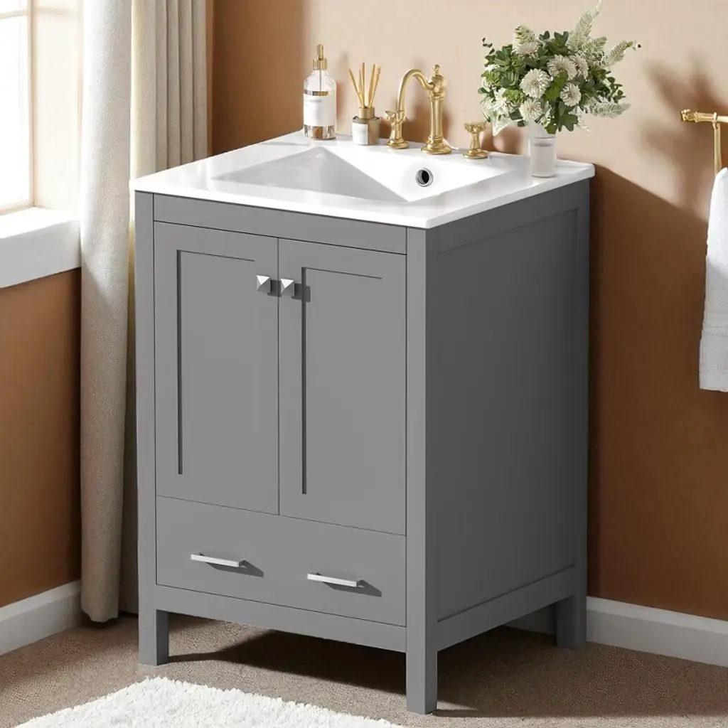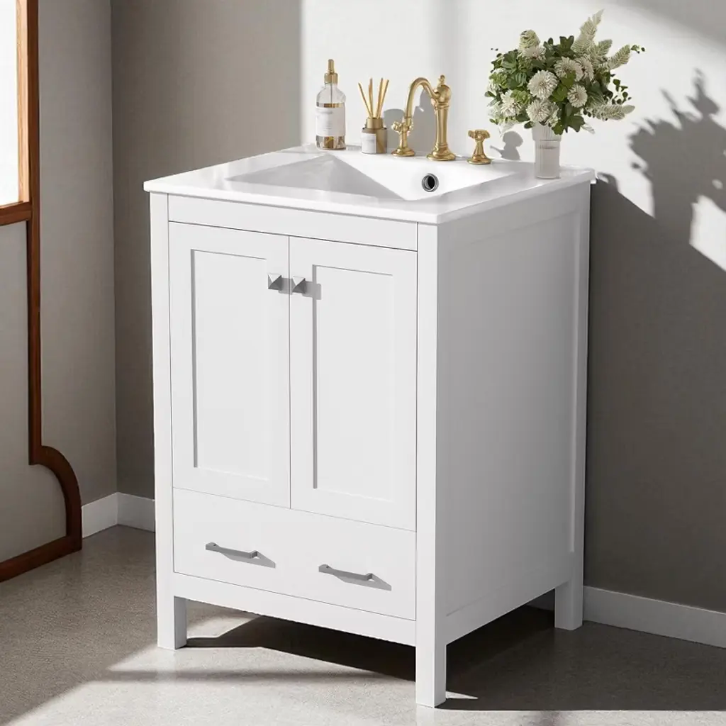 Bring beauty to your bathroom with this timeless vanity cabinet. This design combines traditional and modern influences with its clean-lined frame crafted from solid pine and composite wood. The vanity features nickel pulls and hardware. The soft-close drawer is perfect for stashing washcloths, makeup, and other necessities, while an open shelf down below offers a space for towels or other bathroom accessories. Vanity top and sink are not included.