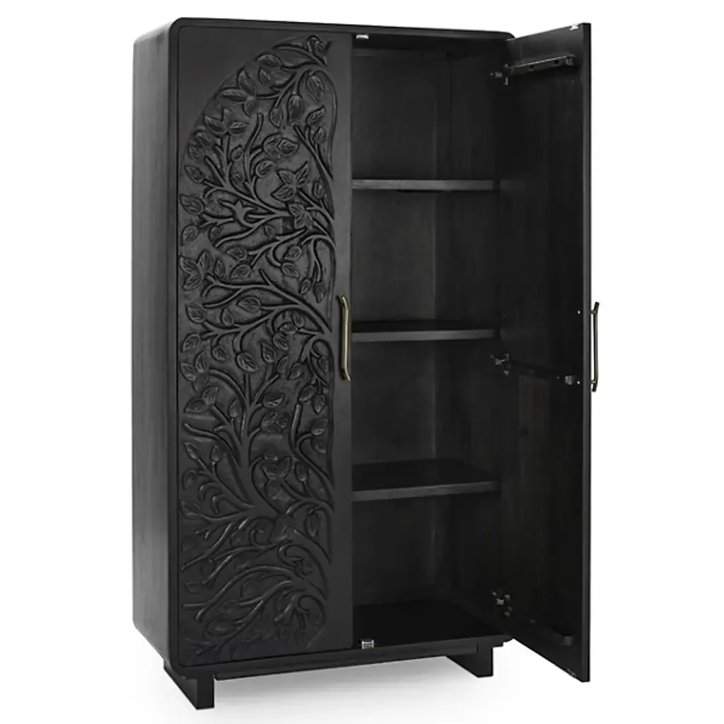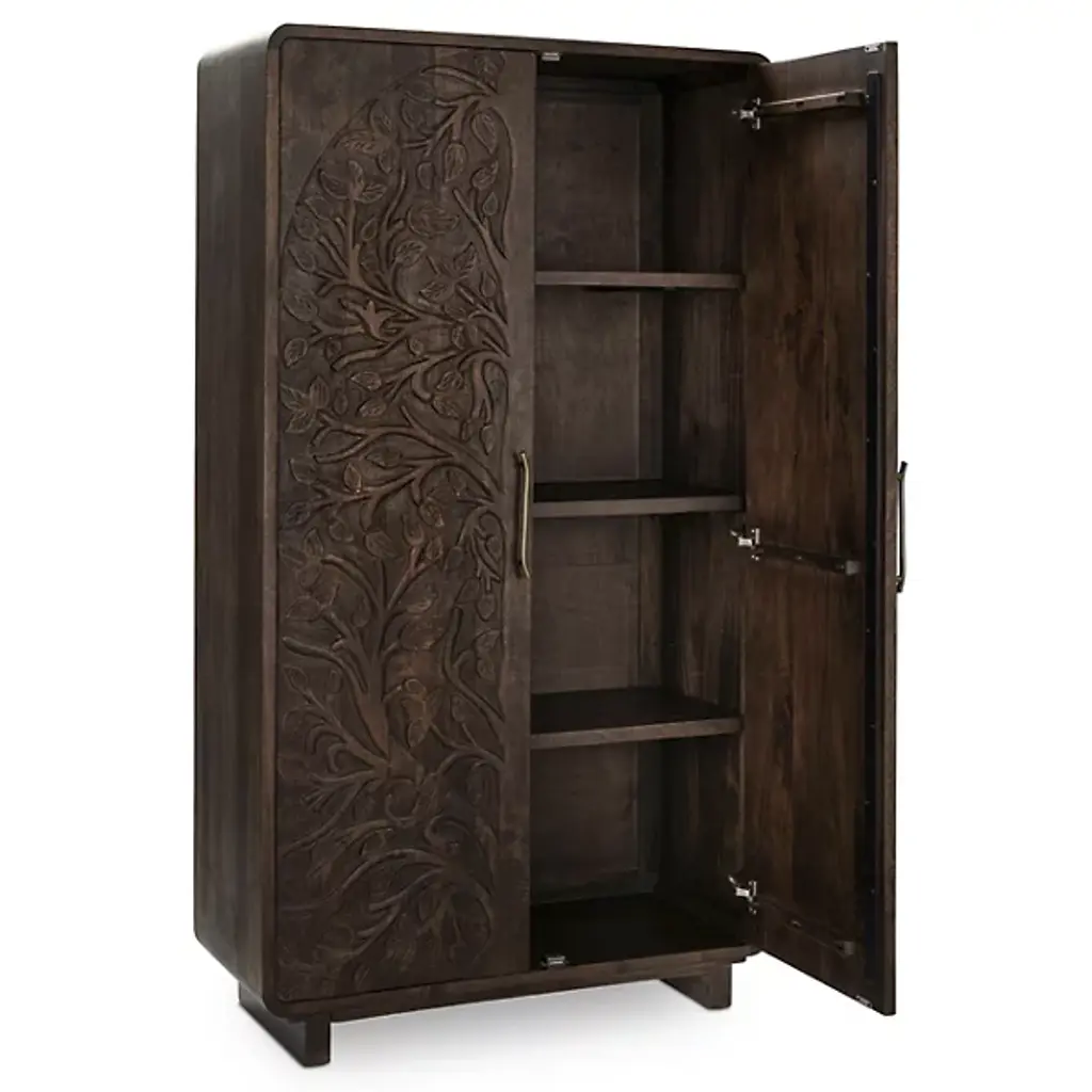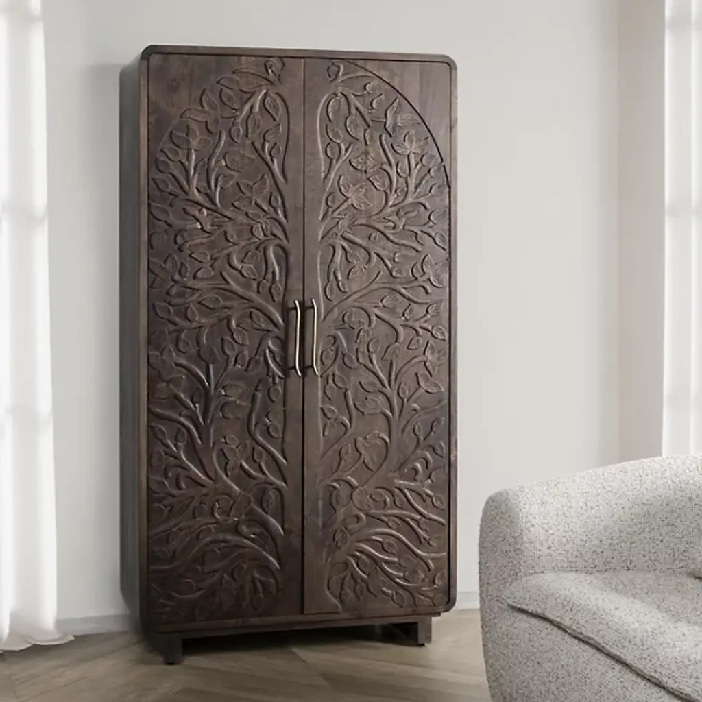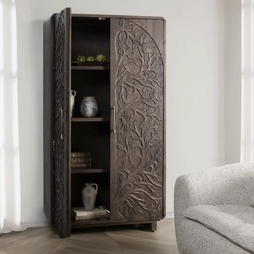 The Albero Tall Cabinet from Classic Home displays intricate botanical carvings that tell stories through its mango wood doors. Indian artisans hand-carve each leaf and branch pattern, creating depth across the surface. The cabinet includes adjustable interior shelving to adapt to storage needs, while brass hardware adds everyday convenience. A water-based finish preserves the wood's natural characteristics while protecting its surface. The vertical design maximizes storage capacity without demanding excessive floor space, making this cabinet practical for various room configurations.