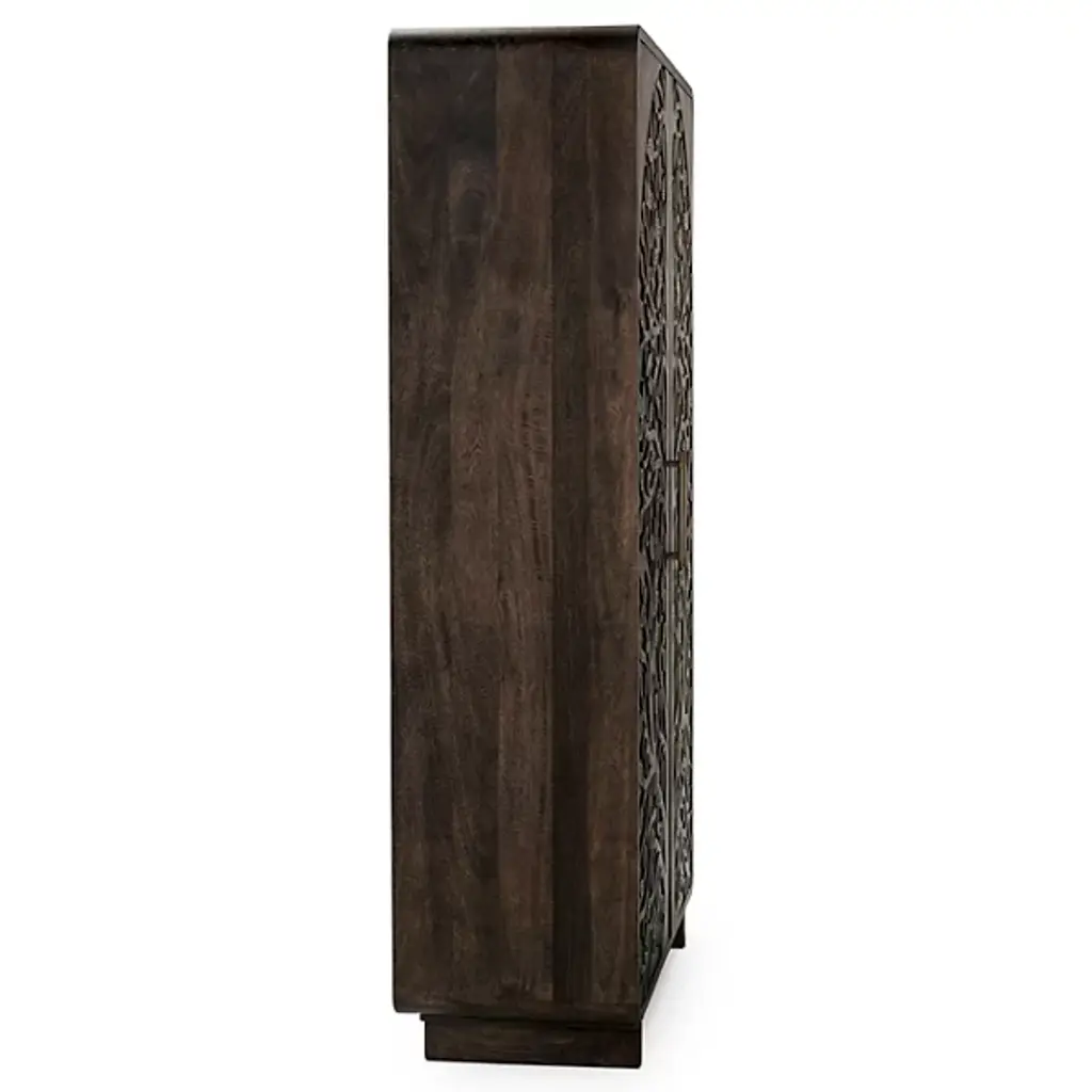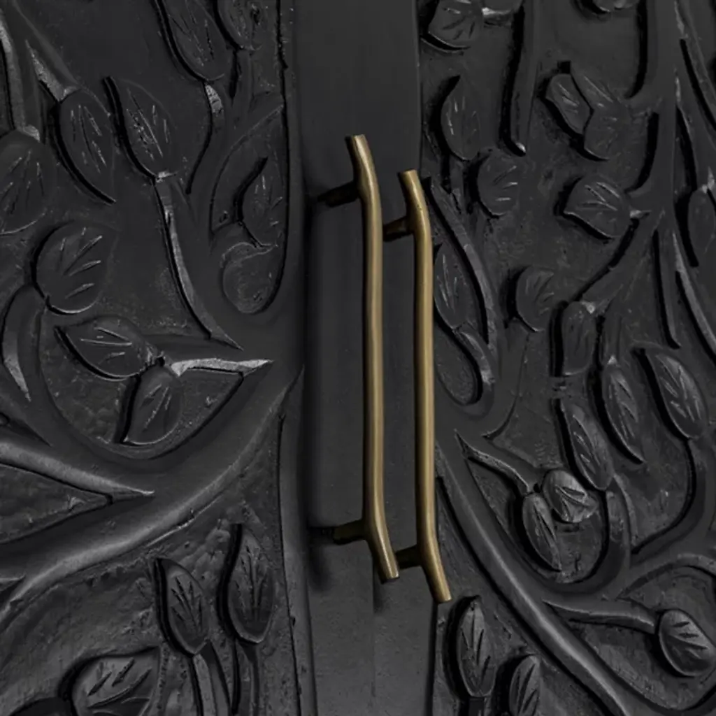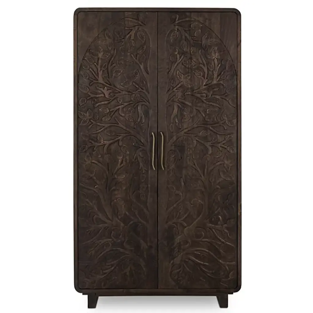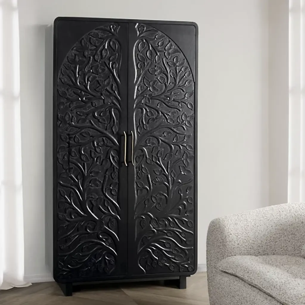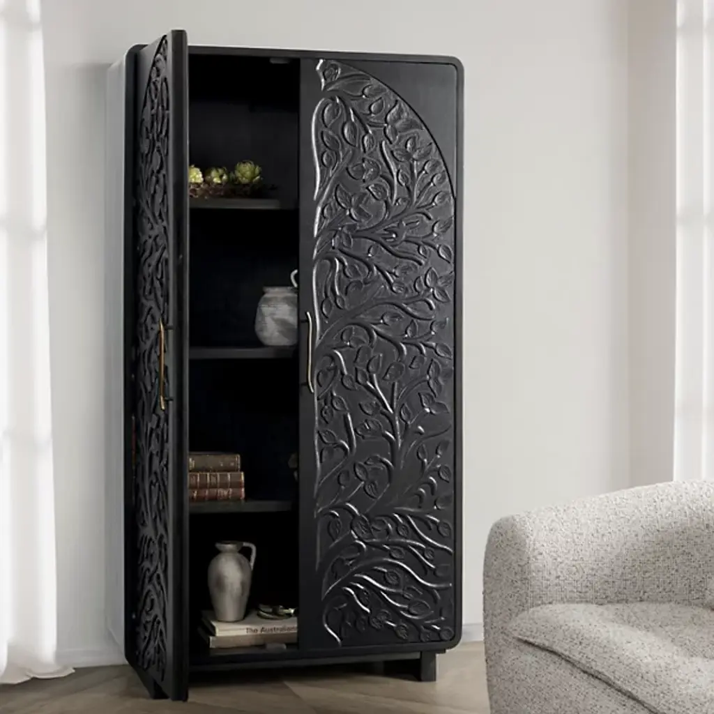 The Albero Tall Cabinet from Classic Home displays intricate botanical carvings that tell stories through its mango wood doors. Indian artisans hand-carve each leaf and branch pattern, creating depth across the surface. The cabinet includes adjustable interior shelving to adapt to storage needs, while brass hardware adds everyday convenience. A water-based finish preserves the wood's natural characteristics while protecting its surface. The vertical design maximizes storage capacity without demanding excessive floor space, making this cabinet practical for various room configurations.