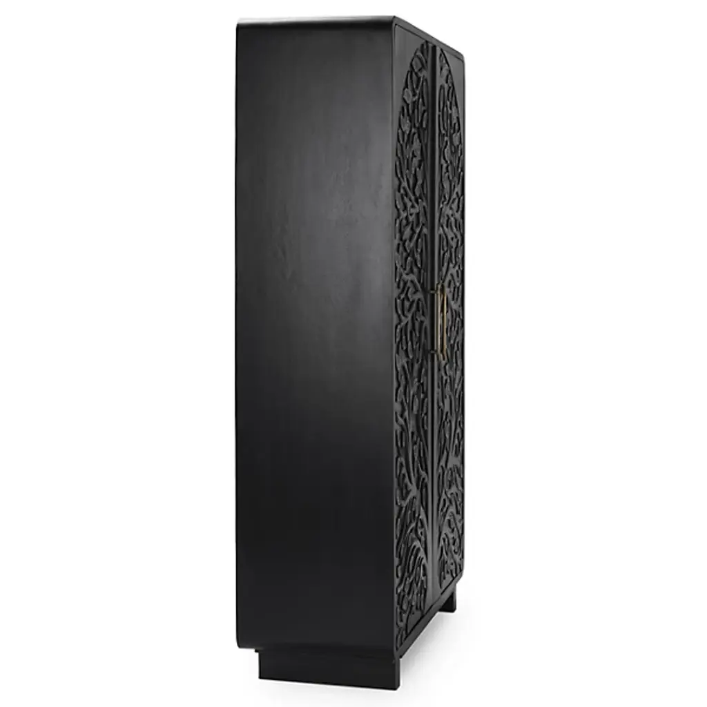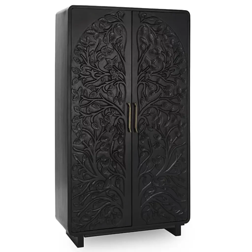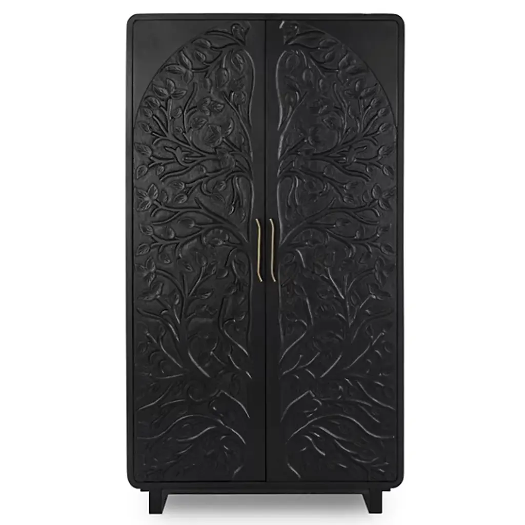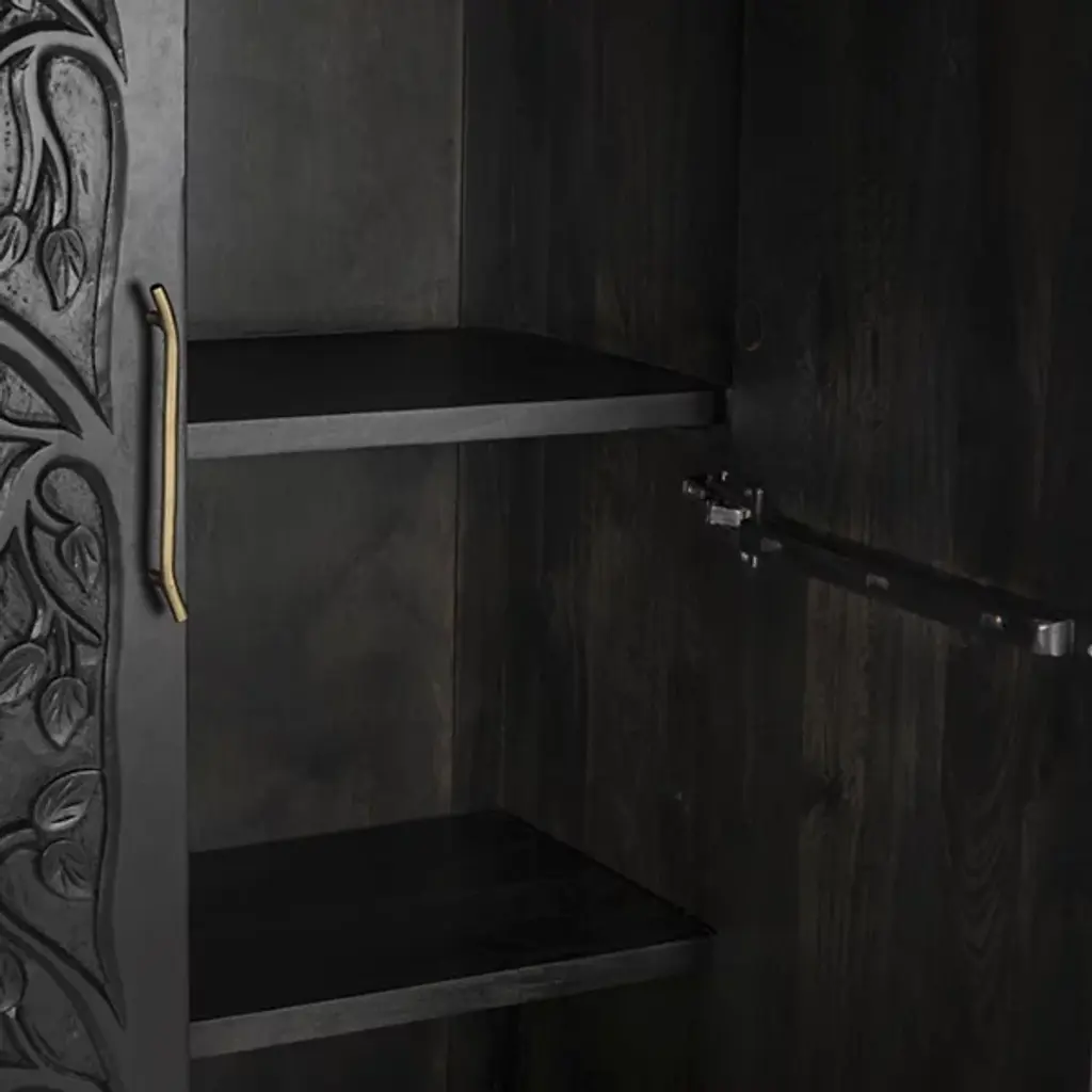 The Albero Tall Cabinet from Classic Home displays intricate botanical carvings that tell stories through its mango wood doors. Indian artisans hand-carve each leaf and branch pattern, creating depth across the surface. The cabinet includes adjustable interior shelving to adapt to storage needs, while brass hardware adds everyday convenience. A water-based finish preserves the wood's natural characteristics while protecting its surface. The vertical design maximizes storage capacity without demanding excessive floor space, making this cabinet practical for various room configurations.