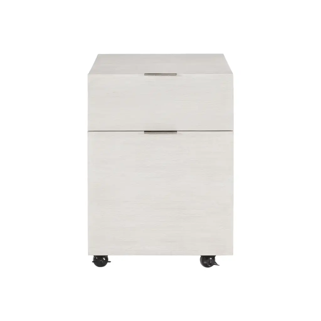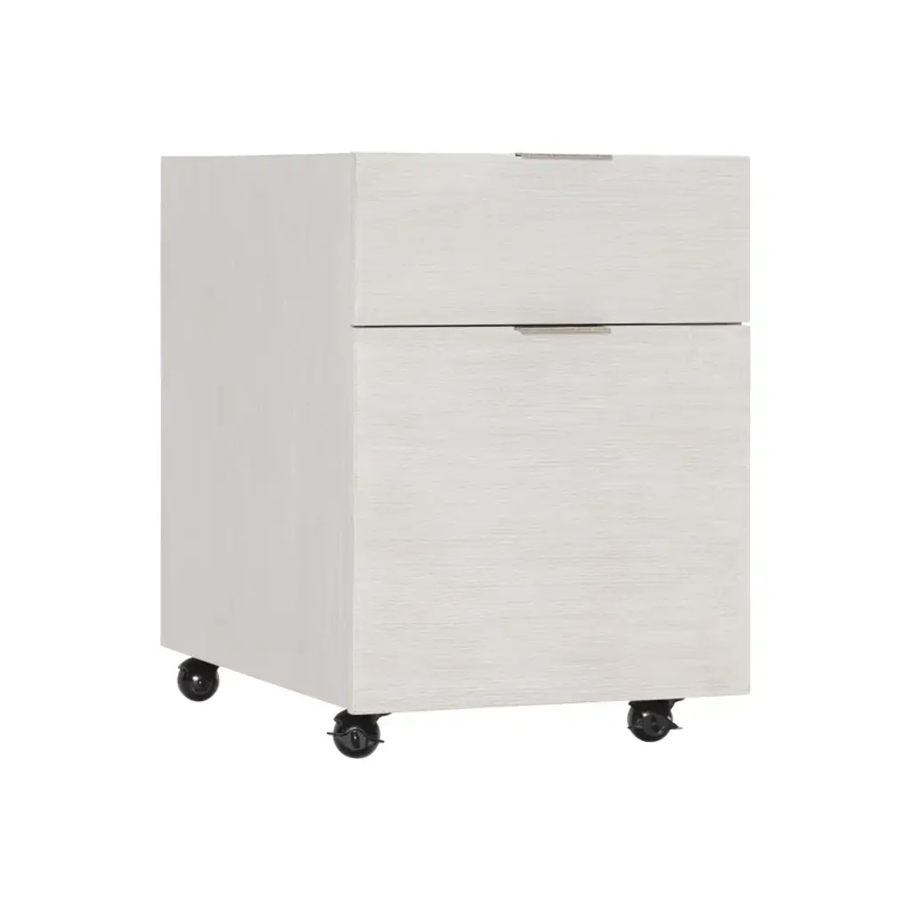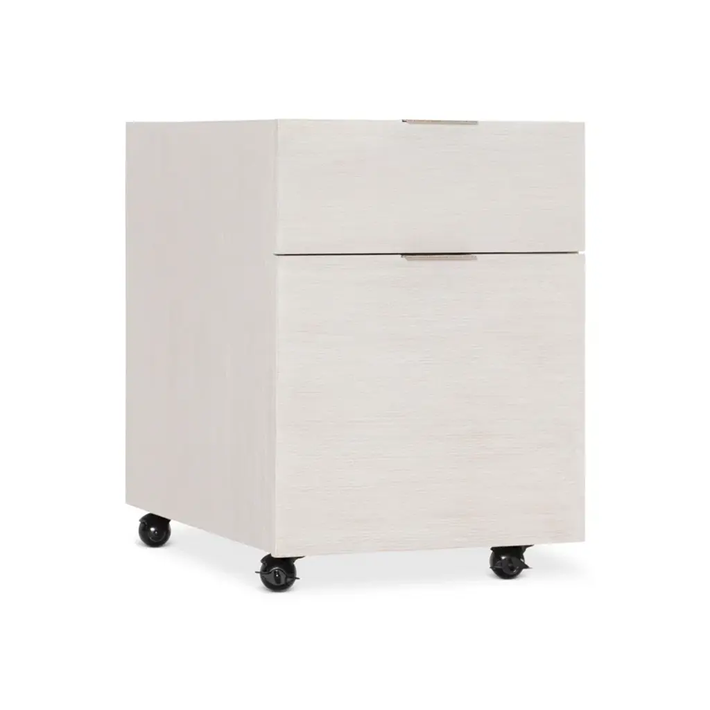 The Solaria file cabinet is clean, simple and essential. Featuring quartered white oak veneers in a Weathered Bone finish, the cabinet houses two office drawers with sleek metal hardware in a shiny nickel finish. The bottom drawer includes removable hanging rods for letter or legal files. Rolling casters create mobility.
