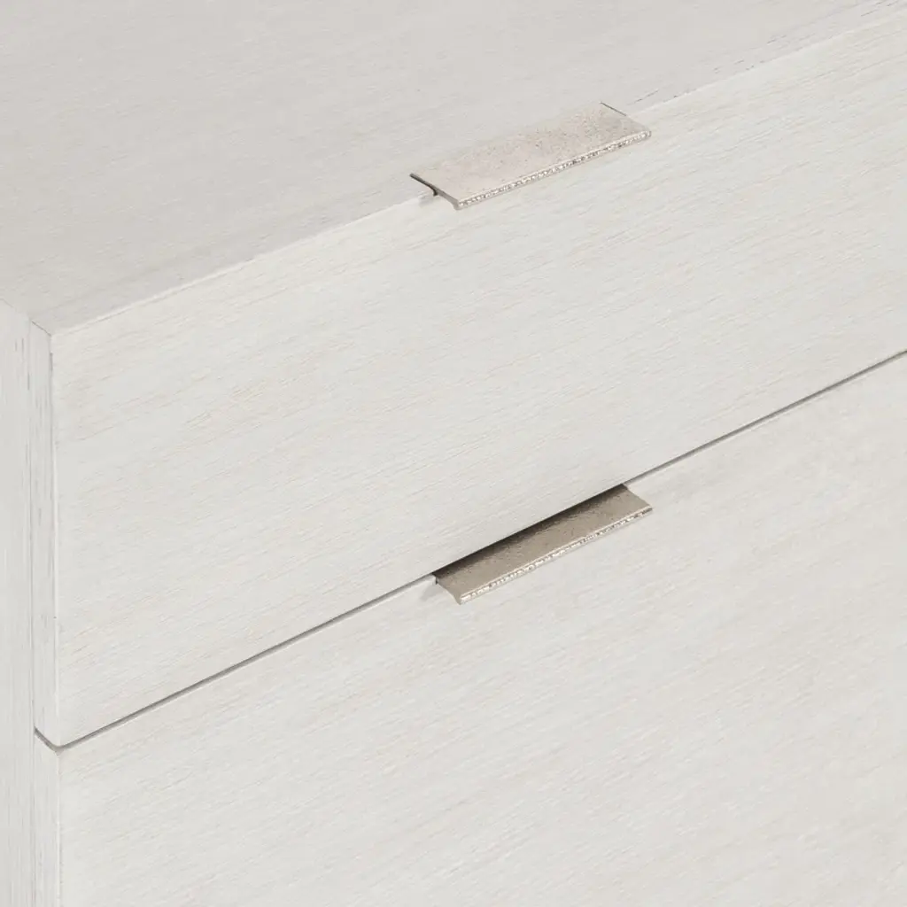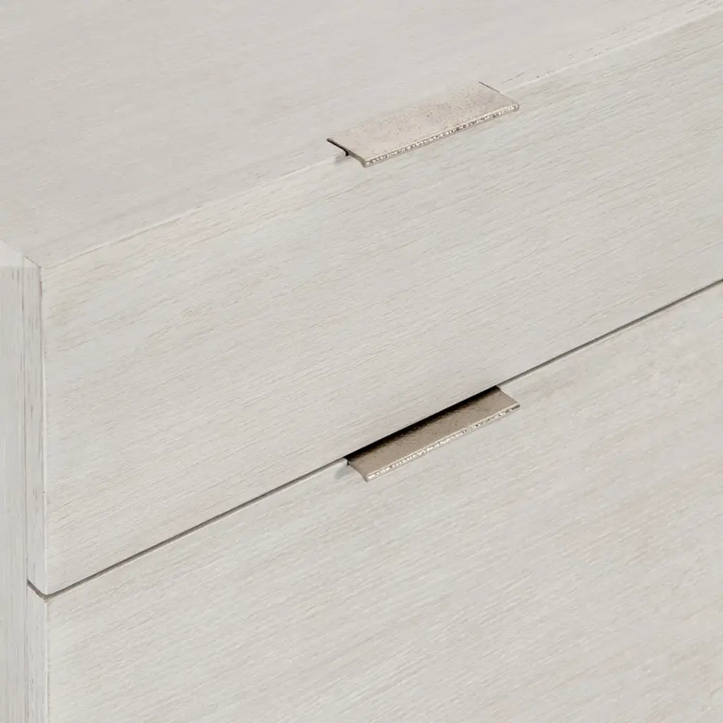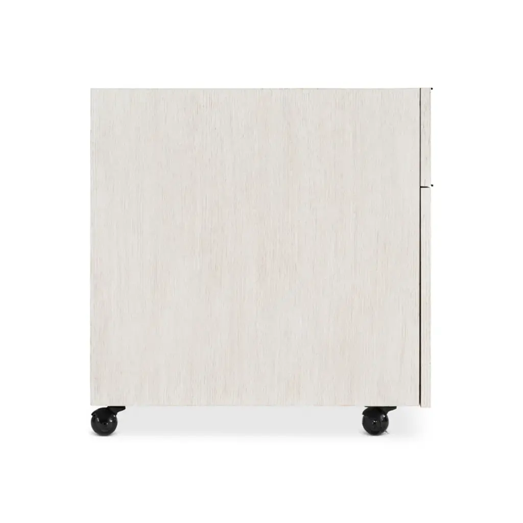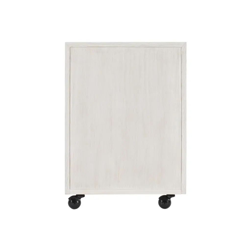 The Solaria file cabinet is clean, simple and essential. Featuring quartered white oak veneers in a Weathered Bone finish, the cabinet houses two office drawers with sleek metal hardware in a shiny nickel finish. The bottom drawer includes removable hanging rods for letter or legal files. Rolling casters create mobility.
