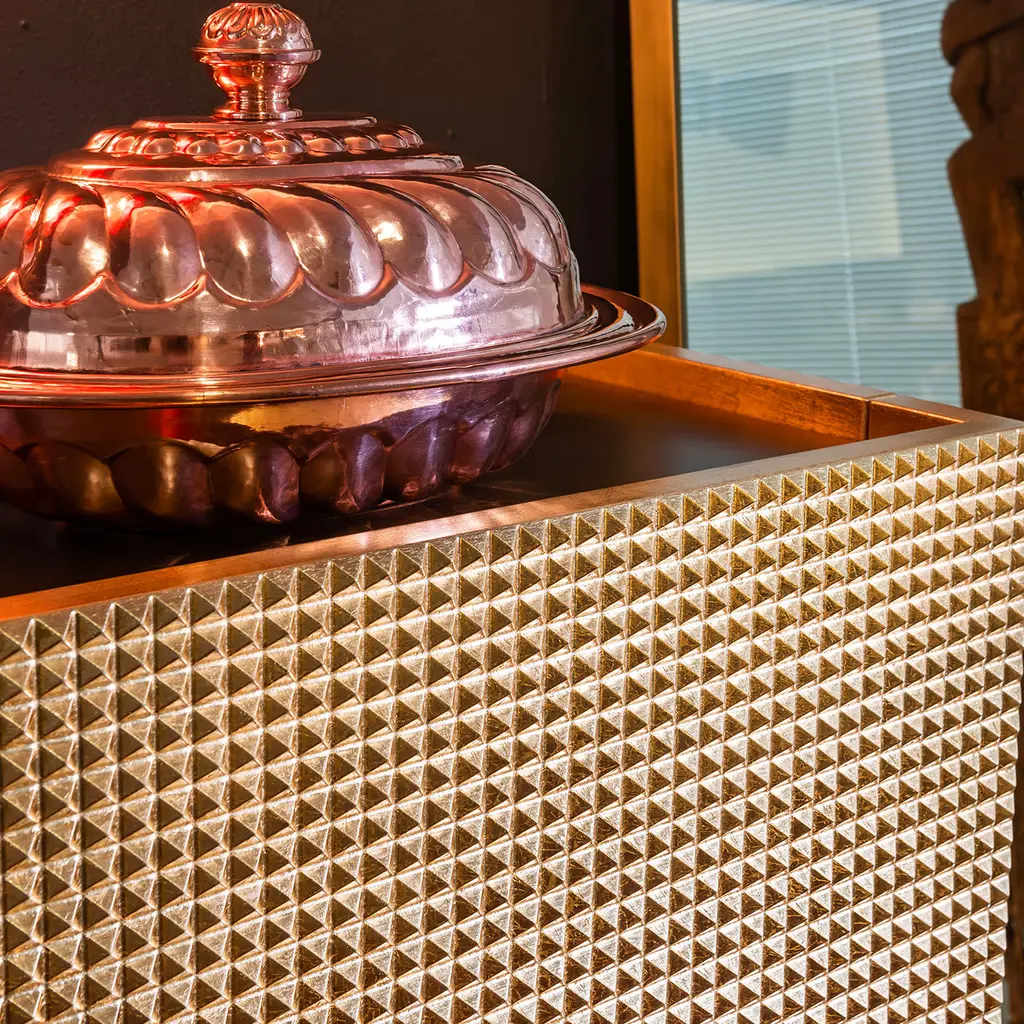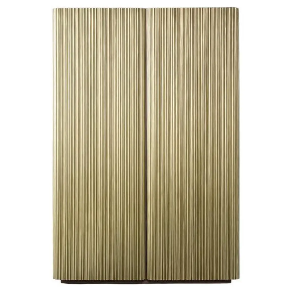 Two-door cabinet with concealed hinges on the sides, gold finish and a top with bronze finish. Inside it features a crystal shelf (included) and upon customer request two sliding drawers on tracks. Part of the internal back is mirrored. On the outside the back is finished to allow a more versatile positioning of this piece. The base is in lacquered MDF.