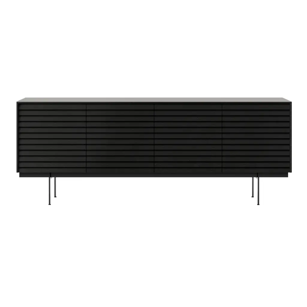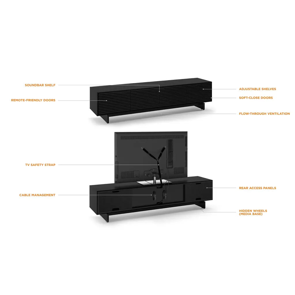 Sleek, streamlined, and full of endless potential, the Align Low 4-Door Cabinet-Media Base from BDI is a striking addition to any room. Both versatile and stylish, this cabinet is outfitted with remote and audio-friendly louvered doors, a soundbar platform, cable management system, and is ready to hold televisions up to 85 inches in size. Station in your living room or lounge space and top with your favorite electronics and decor for a home theater design that speaks volumes.Highlights
