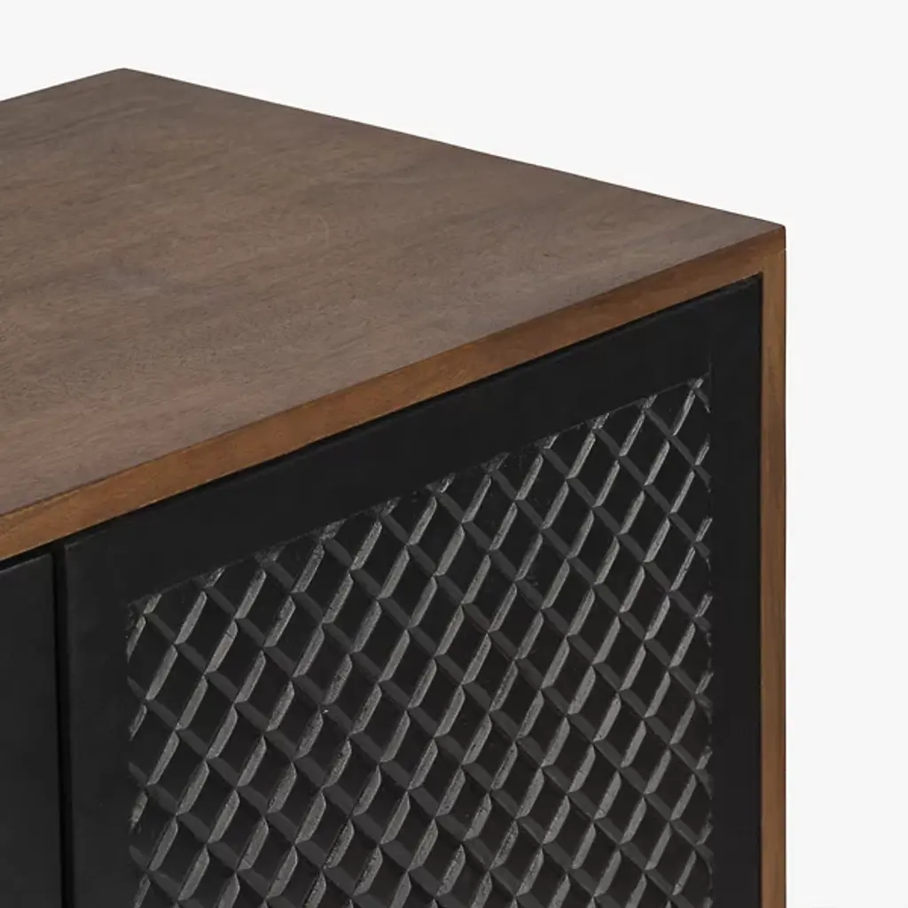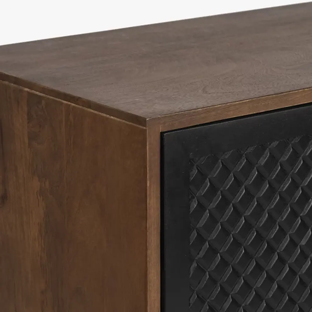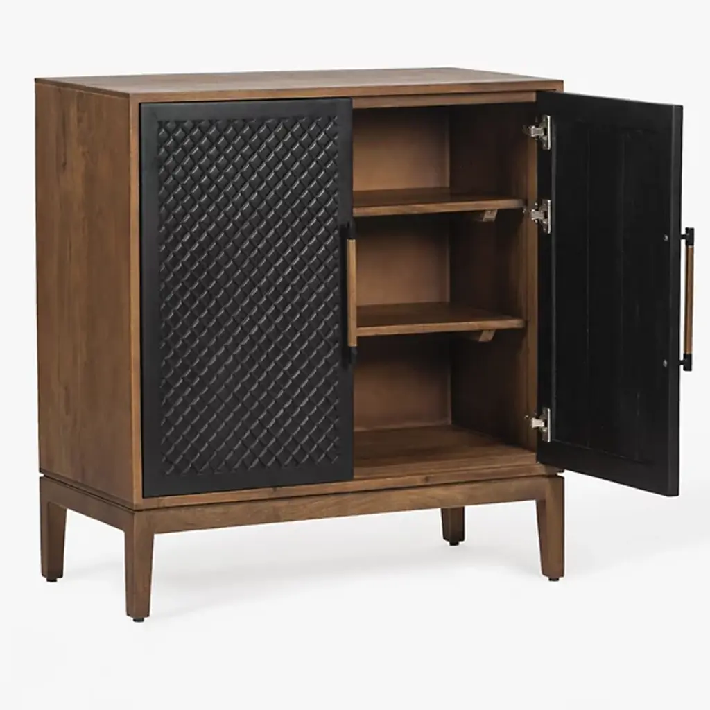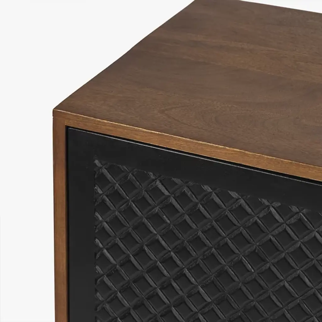 The Allard Entryway Cabinet from Alder & Ore greets visitors with its distinctive diamond-pattern door fronts. The intricate lattice design creates a play of light and shadow as guests enter your home. Soft-close technology protects fingers and prevents noise when closing the cabinet doors. The mango wood construction provides natural durability, while the engineered components ensure structural integrity over time. Media cutouts allow for easy cord management when using this piece for entertainment equipment. The marriage of walnut and black tones creates a welcoming impression that remains fresh and current without yielding to passing trends.