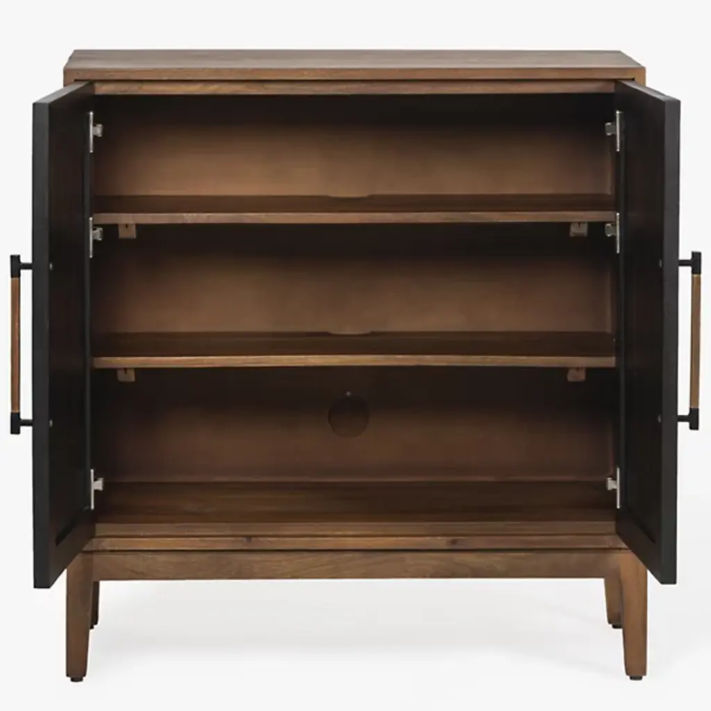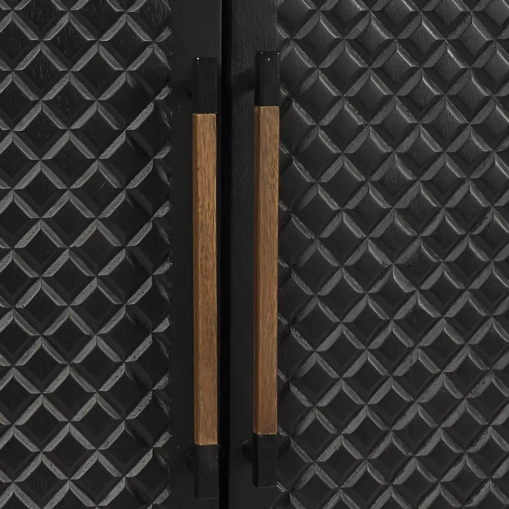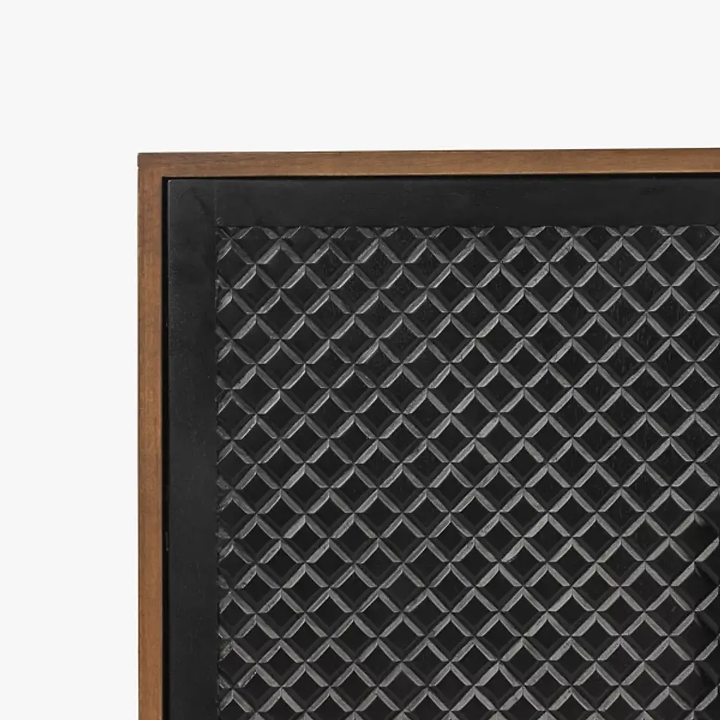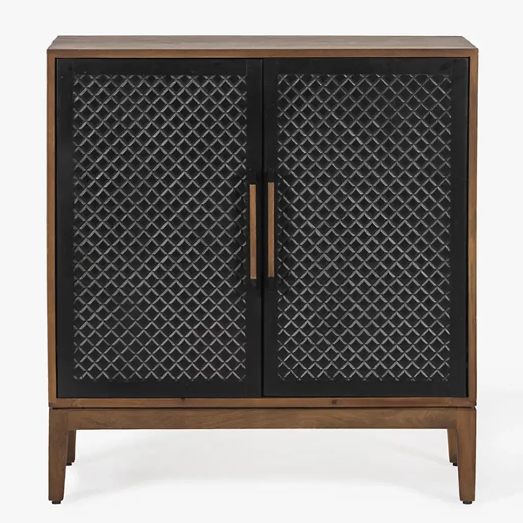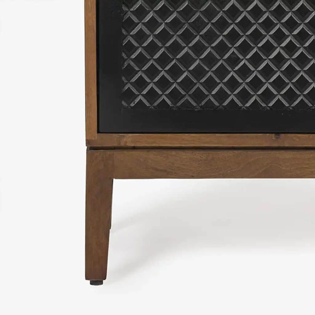 The Allard Entryway Cabinet from Alder & Ore greets visitors with its distinctive diamond-pattern door fronts. The intricate lattice design creates a play of light and shadow as guests enter your home. Soft-close technology protects fingers and prevents noise when closing the cabinet doors. The mango wood construction provides natural durability, while the engineered components ensure structural integrity over time. Media cutouts allow for easy cord management when using this piece for entertainment equipment. The marriage of walnut and black tones creates a welcoming impression that remains fresh and current without yielding to passing trends.