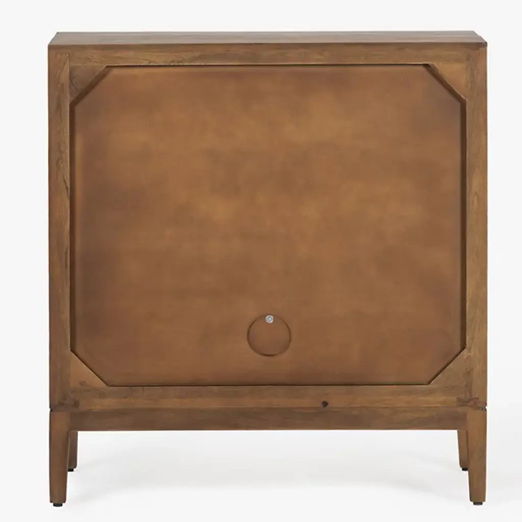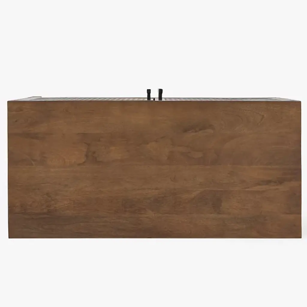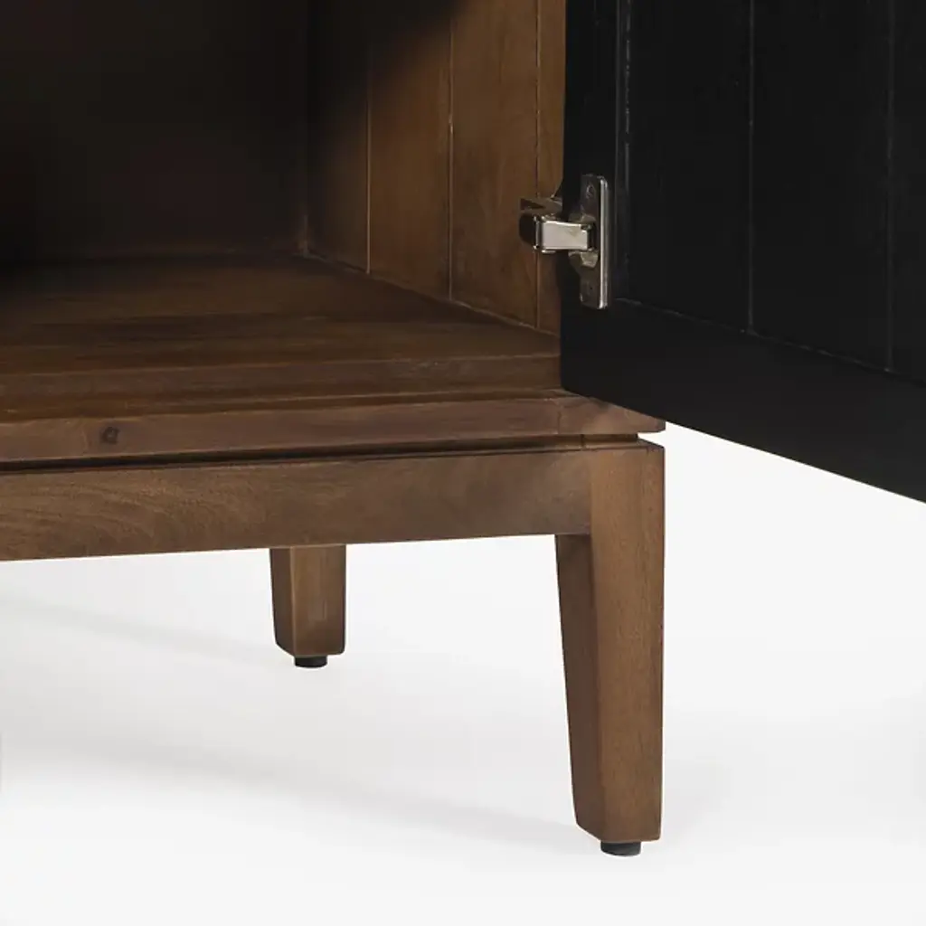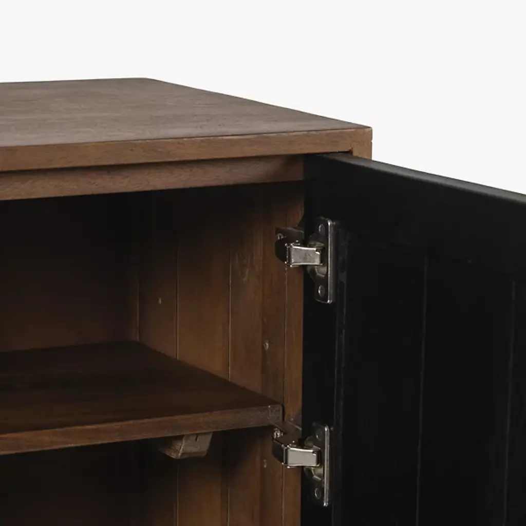 The Allard Entryway Cabinet from Alder & Ore greets visitors with its distinctive diamond-pattern door fronts. The intricate lattice design creates a play of light and shadow as guests enter your home. Soft-close technology protects fingers and prevents noise when closing the cabinet doors. The mango wood construction provides natural durability, while the engineered components ensure structural integrity over time. Media cutouts allow for easy cord management when using this piece for entertainment equipment. The marriage of walnut and black tones creates a welcoming impression that remains fresh and current without yielding to passing trends.