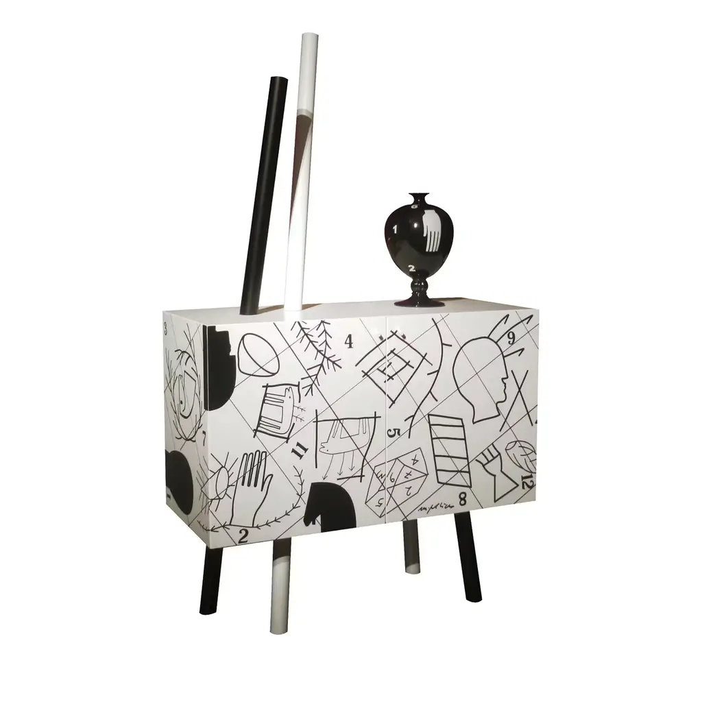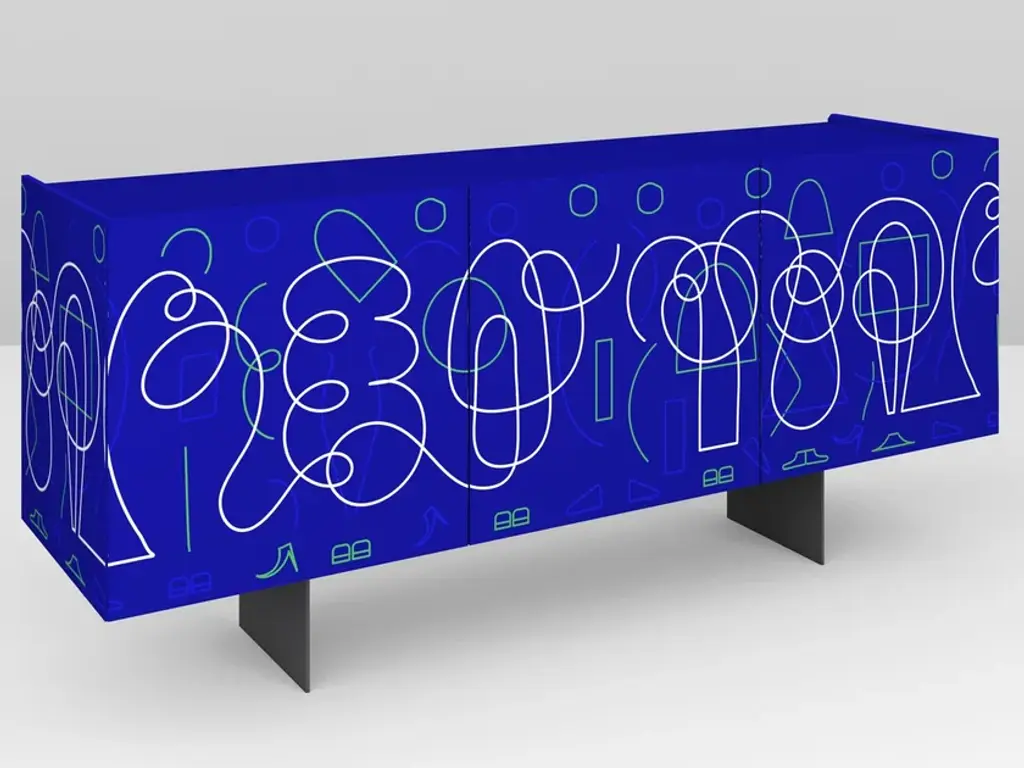 Highboards with two doors in lacquered wood inside. The exterior is made of digital printing with protective paint. The container is provided on a painted metal pedestal.