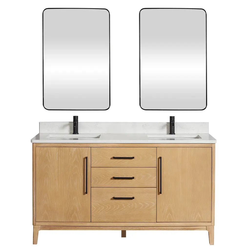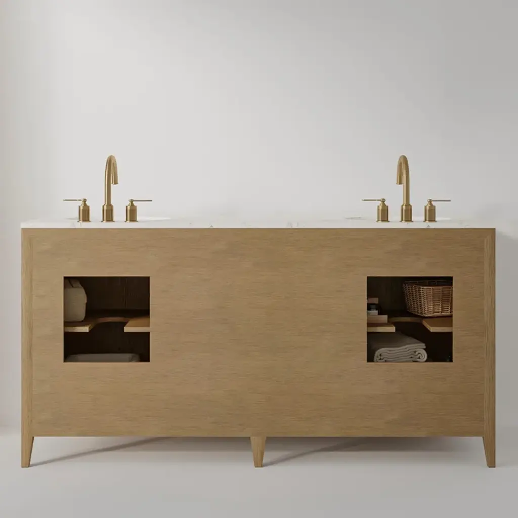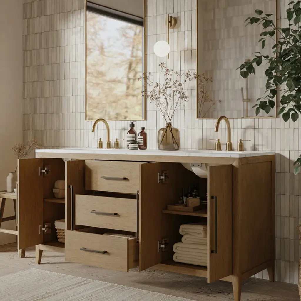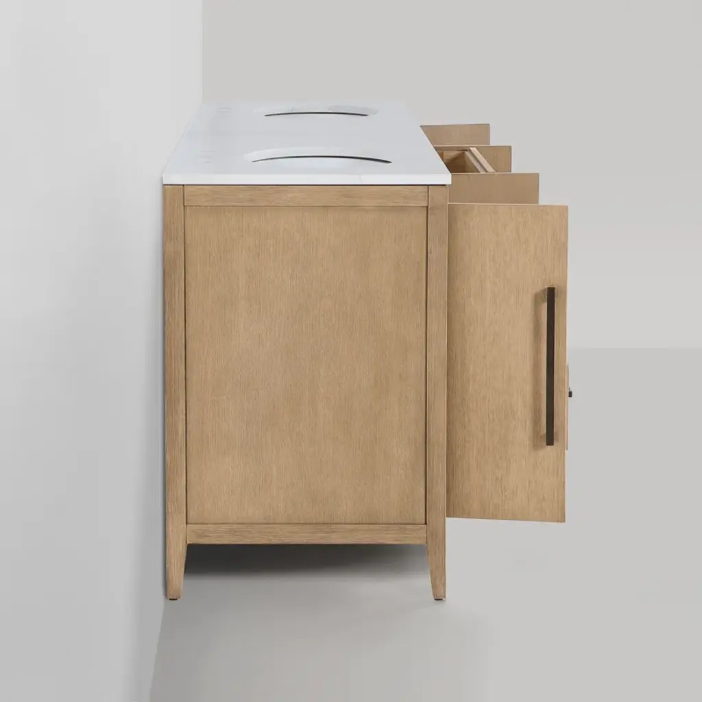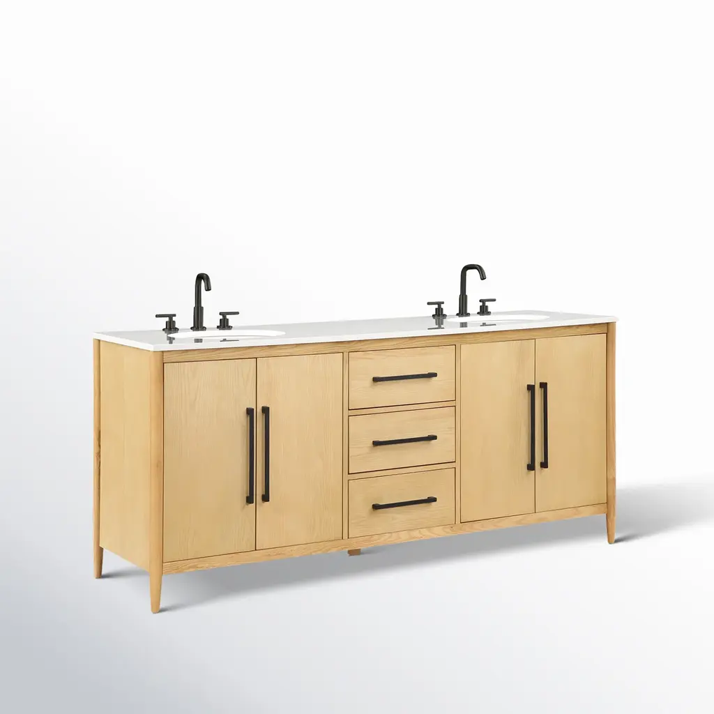 Elevate your bathroom with the Alsup double bathroom vanity, a timeless classic that seamlessly blends into any décor from traditional to modern. This premium 60" freestanding vanity features solid wood construction with a multi-step finish, standing on elegant tapered legs for sophisticated appeal. Generous storage includes 3 soft-close drawers and 4 cabinet doors with adjustable shelves, providing ample space for all your bathroom essentials. Topped with luxurious Calacatta Gold Quartz countertop and two ceramic undermount sinks, this designer bathroom furniture combines functionality with enduring quality built to last a lifetime. Faucets sold separately.