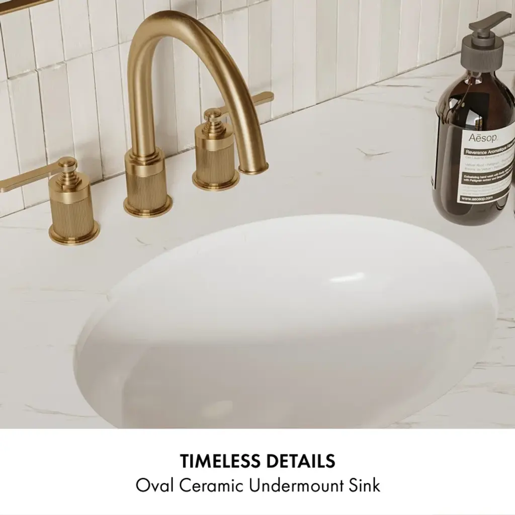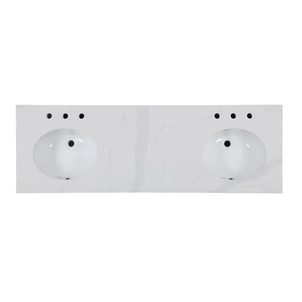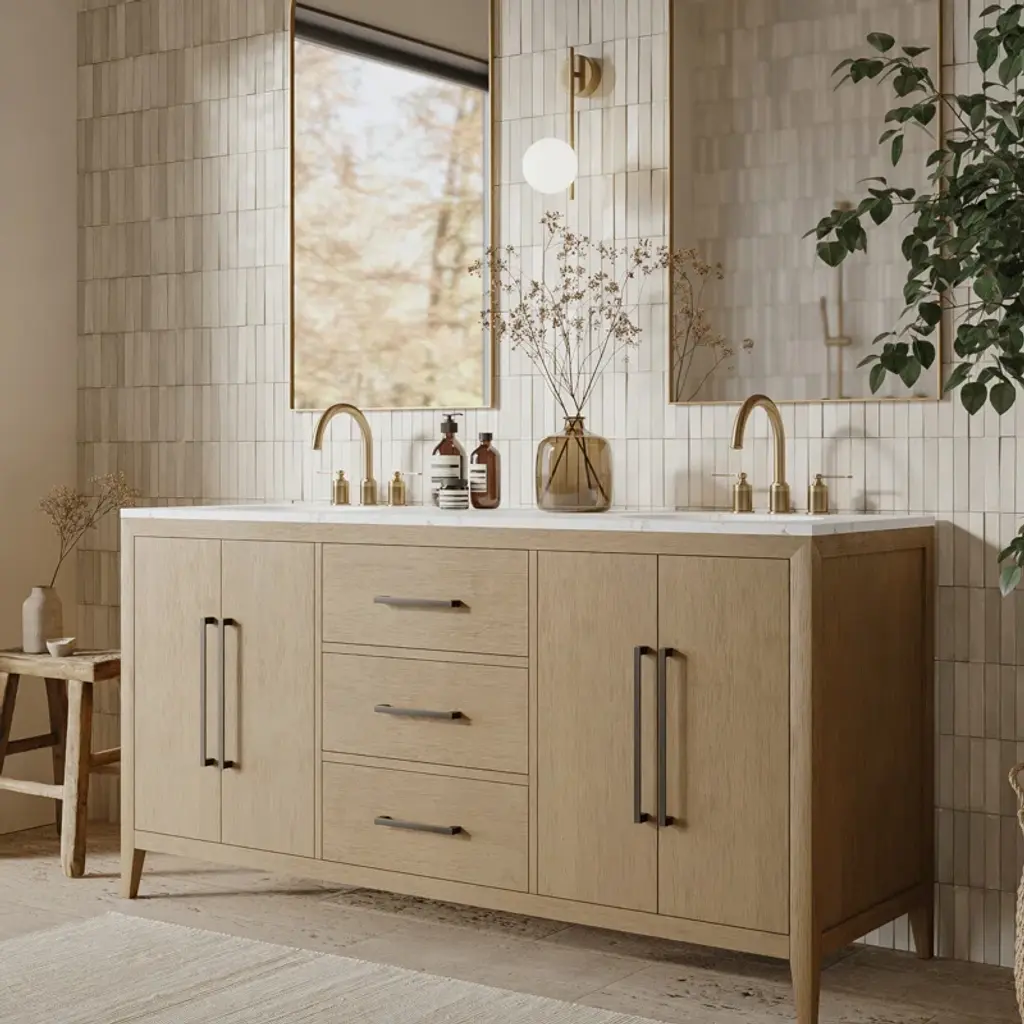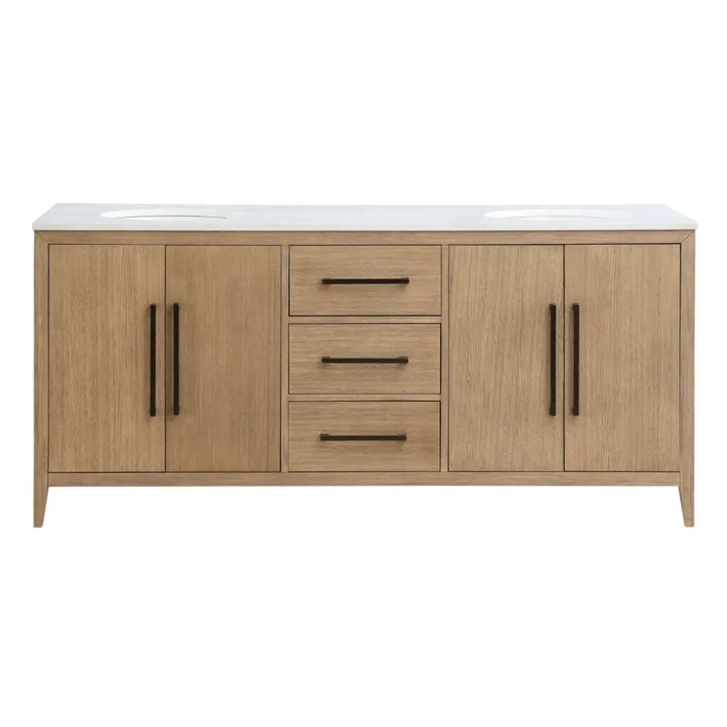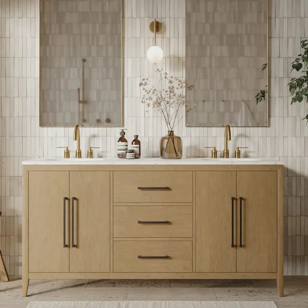 Elevate your bathroom with the Alsup double bathroom vanity, a timeless classic that seamlessly blends into any décor from traditional to modern. This premium 60" freestanding vanity features solid wood construction with a multi-step finish, standing on elegant tapered legs for sophisticated appeal. Generous storage includes 3 soft-close drawers and 4 cabinet doors with adjustable shelves, providing ample space for all your bathroom essentials. Topped with luxurious Calacatta Gold Quartz countertop and two ceramic undermount sinks, this designer bathroom furniture combines functionality with enduring quality built to last a lifetime. Faucets sold separately.