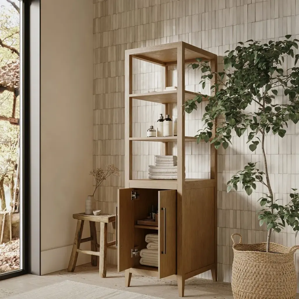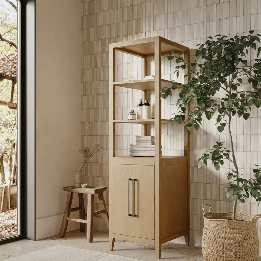 This 2-door cabinet completes your traditional makeover with plenty of storage and a classic look. It's crafted from solid eucalyptus + oak wood in a natural hue and a rectangular silhouette. The design features a base with three shelves that are great for storing everything from cotton swabs to soap. We love that the base has two doors with antique bronze metal handles that open to reveal space for towels and other bathroom essentials. It's freestanding, and it comes with a tip-over restraint device for extra safety.