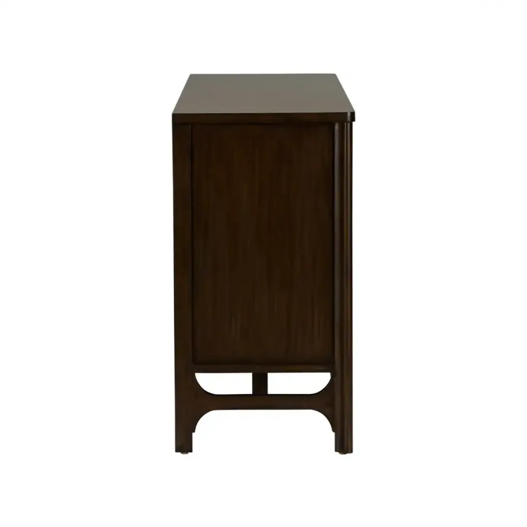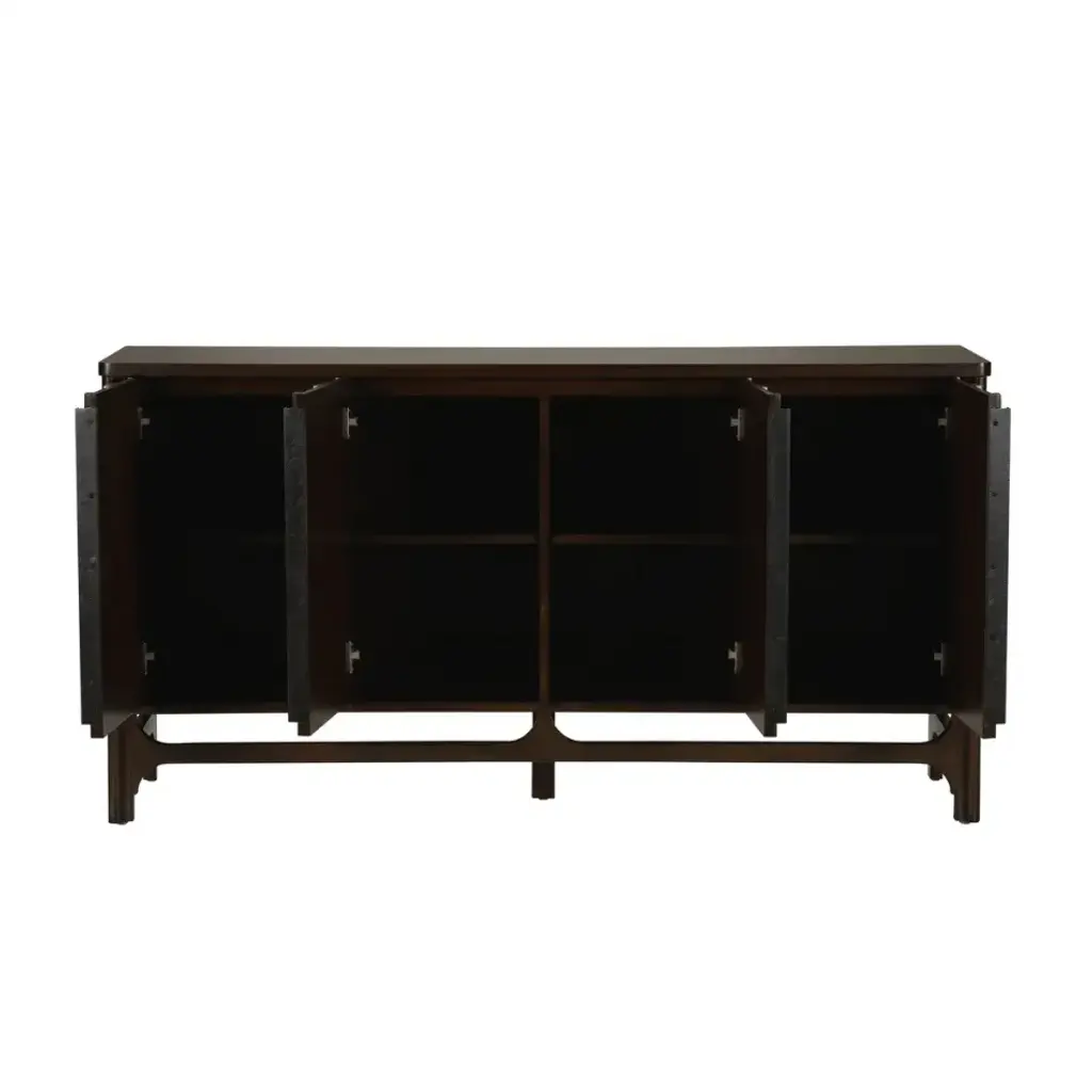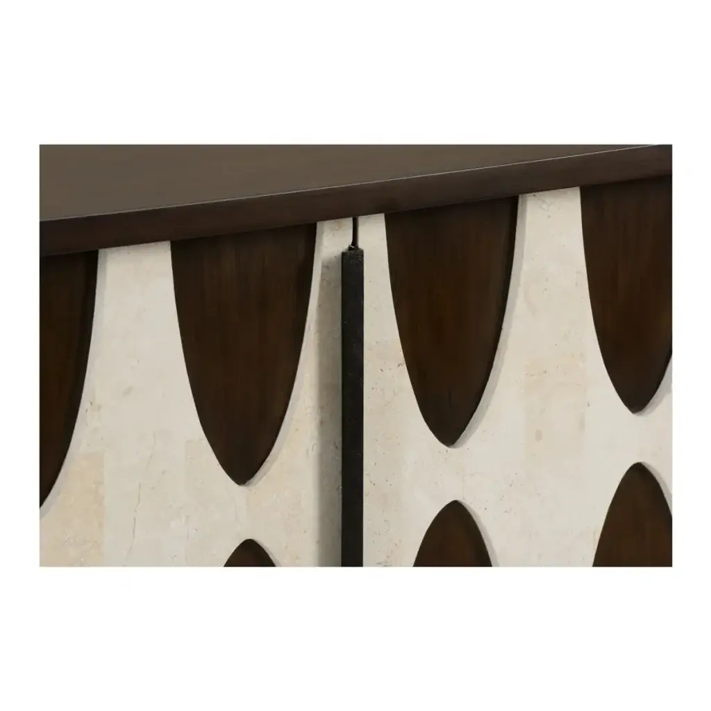 The Althea Cabinet brings mid-century modern elegance to your home with its sophisticated design and luxurious materials. Crafted from rich, dark wood, this cabinet showcases a sleek silhouette enhanced by a stunning white stone inlay, adding texture and visual interest to the doors. The cabinet is supported by an open wood base, giving it a light, airy feel while maintaining its sturdy presence. Inside, you'll find two spacious shelves.