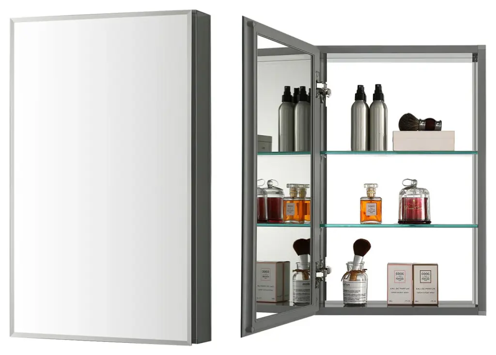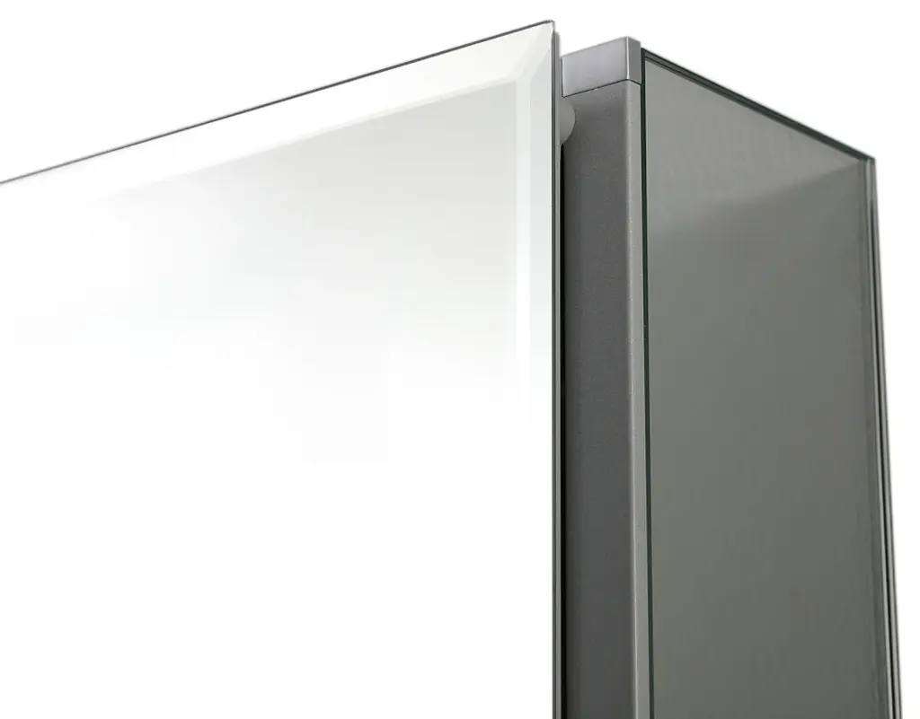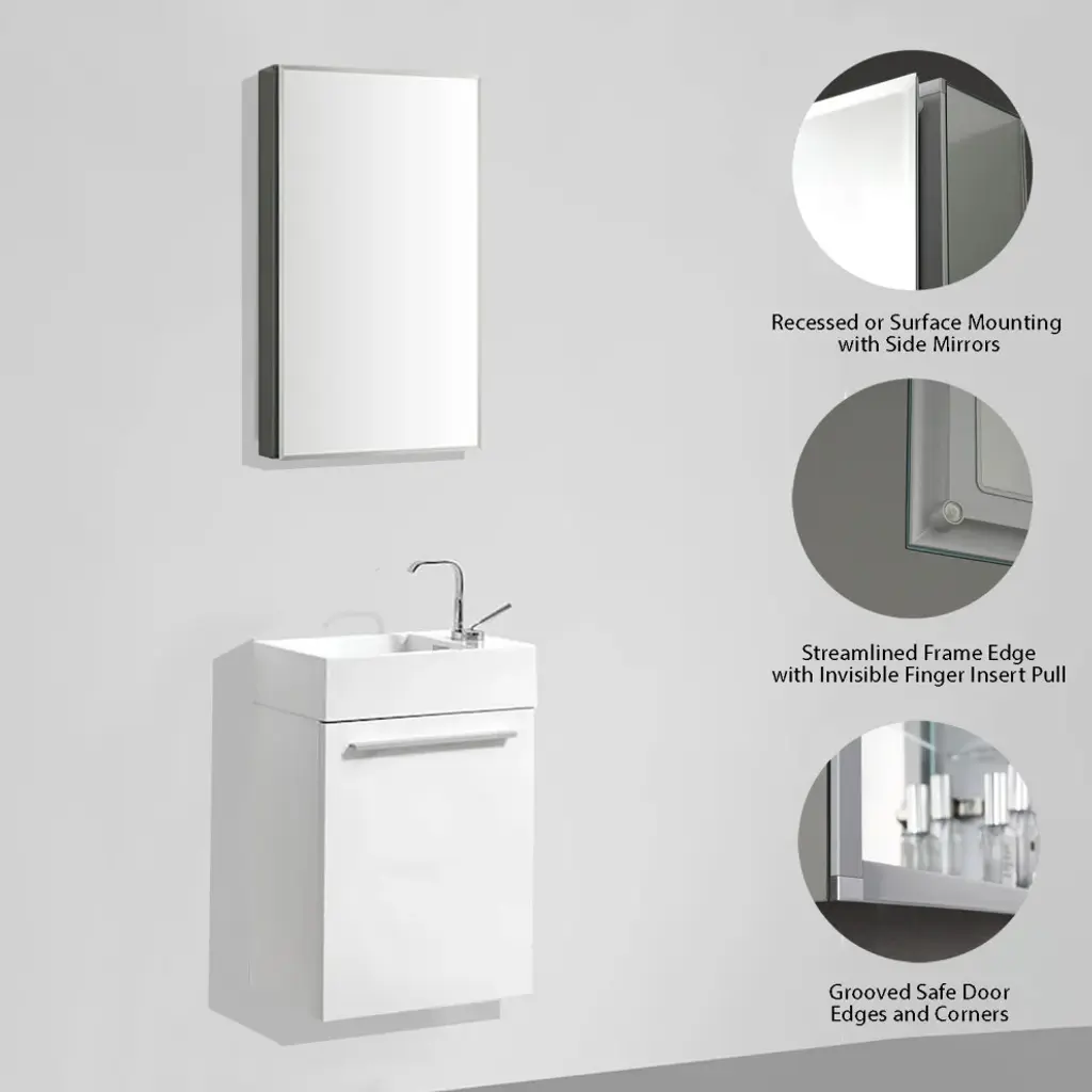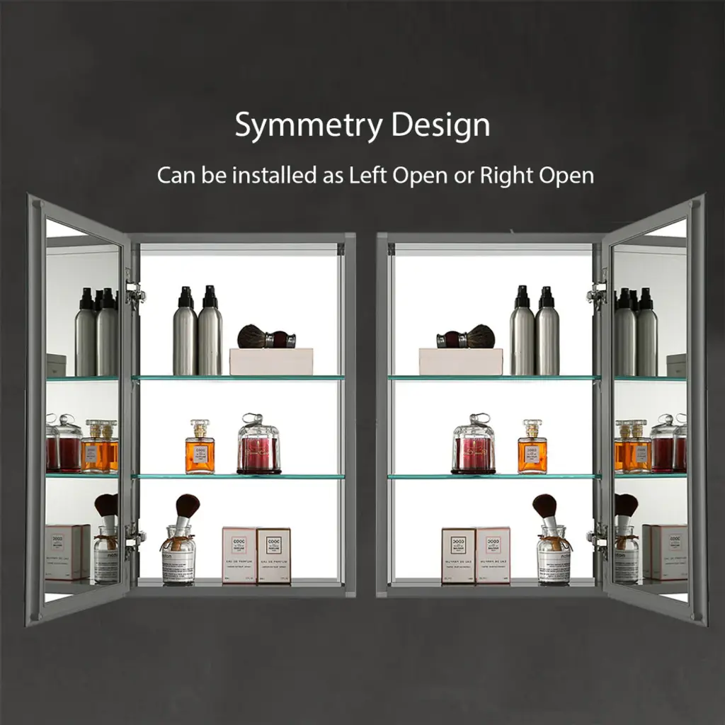 Our Blossom aluminum medicine cabinet is a brilliant combination of elegant style and modern convenience. It offers you great storage space and bathroom convenience. Three way adjustable hinges can be adjusted and moved up and down, left and right, front and back directions. Hinges can be installed for left or right hand swings.High-end hardware brand DTC 110° wide-open soft closed hinges provide strong support for large medicine cabinet. Bathroom medicine cabinet recessed or surfaced.Two adjustable 8mm thick tempered glass medicine cabinet shelves, simple & elegant, easy to organize. Anodized aluminum material medicine cabinet with popular streamlined frame edge can be used as an invisible handle.COPPER FREE silver medicine cabinet mirror prevents black edges in the harsh bathroom environment. The Inside back panel is constructed with a whole piece of glass to provide a large visible area.The smaller inner frame provides more space, the glass shelf depth reachs 100mm. The Inside back panel glass with a high quality resin material mirror provides a smooth image and prevents rust.Mirrors on both sides of the door, interior walls & both side panels, which makes it a bathroom cabinet with mirror on all sides. Grooved door edges and corners for safe use.Blossom Frameless Bathroom Mirror Medicine Cabinet with thicker & stronger side glass, not easy to break. Door panel with integral steel mold construction makes the structure integrated and stronger, while the matte surface looks high-end and scratch-resistant.IP44 rated Anodized Aluminum Frame for extra durability. Scratch-free painting finish.Two years warranty with top level customer service.