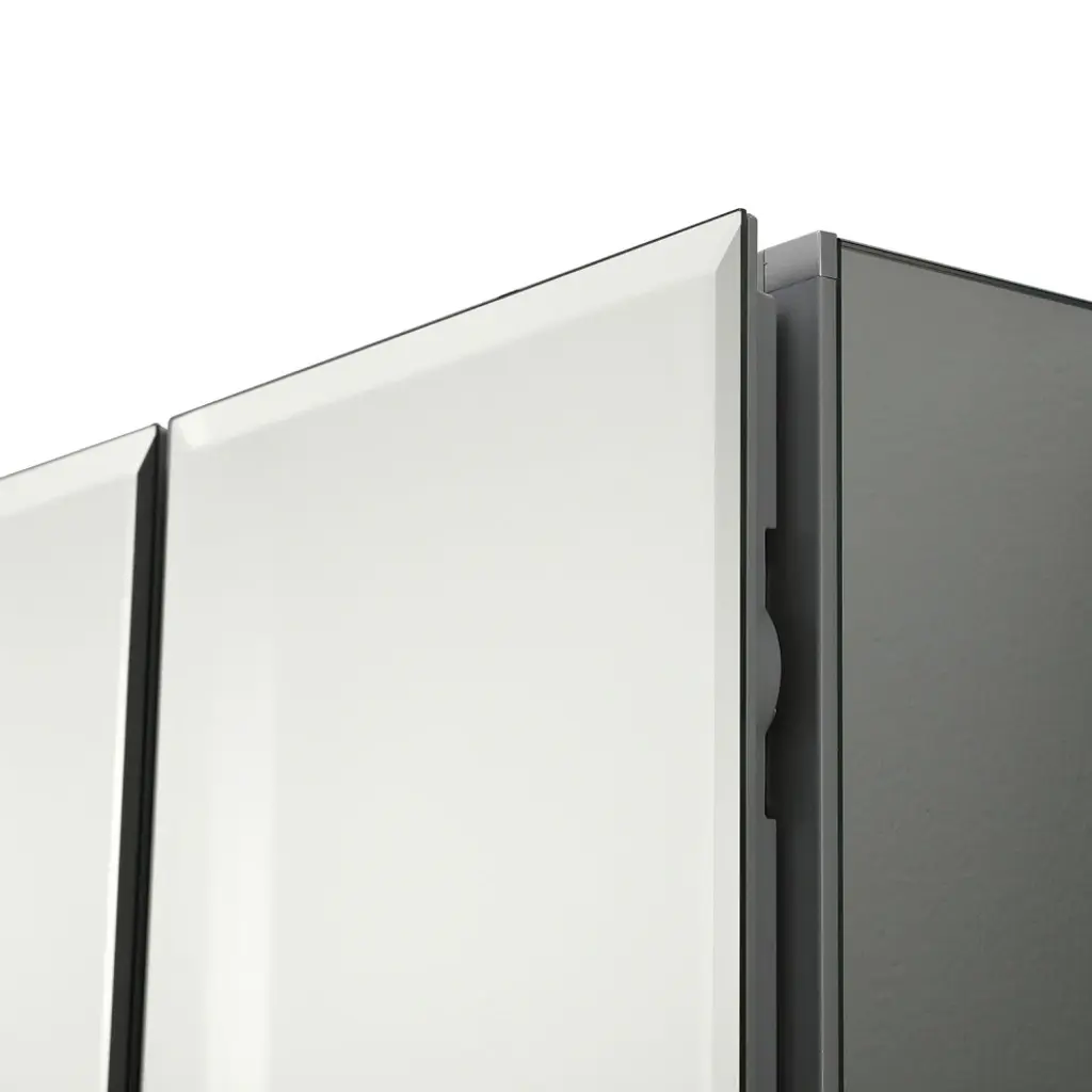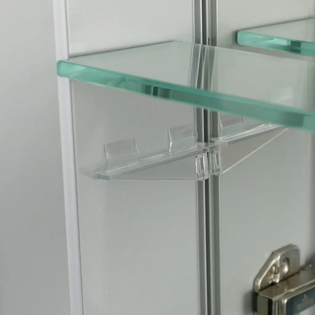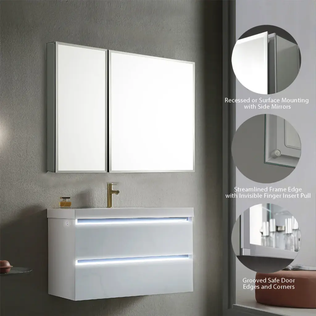 Our Blossom aluminum medicine cabinet is a brilliant combination of elegant style and modern convenience. It offers you great storage space and bathroom convenience. Three way adjustable hinges can be adjusted and moved up and down, left and right, front and back directions. Hinges can be installed for left or right hand swings.High-end hardware brand DTC 110° wide-open soft closed hinges provide strong support for large medicine cabinet. Bathroom medicine cabinet recessed or surfaced.Two adjustable 8mm thick tempered glass medicine cabinet shelves, simple & elegant, easy to organize. Anodized aluminum material medicine cabinet with popular streamlined frame edge can be used as an invisible handle.COPPER FREE silver medicine cabinet mirror prevents black edges in the harsh bathroom environment. The Inside back panel is constructed with a whole piece of glass to provide a large visible area.The smaller inner frame provides more space, the glass shelf depth reachs 100mm. The Inside back panel glass with a high quality resin material mirror provides a smooth image and prevents rust.Mirrors on both sides of the door, interior walls & both side panels, which makes it a bathroom cabinet with mirror on all sides. Grooved door edges and corners for safe use.Blossom Frameless Bathroom Mirror Medicine Cabinet with thicker & stronger side glass, not easy to break. Door panel with integral steel mold construction makes the structure integrated and stronger, while the matte surface looks high-end and scratch-resistant.IP44 rated Anodized Aluminum Frame for extra durability. Scratch-free painting finish.Two years warranty with top level customer service.