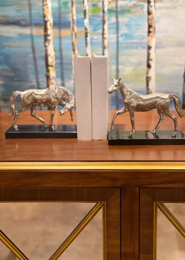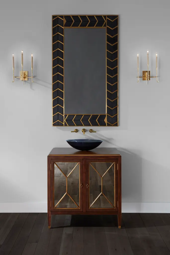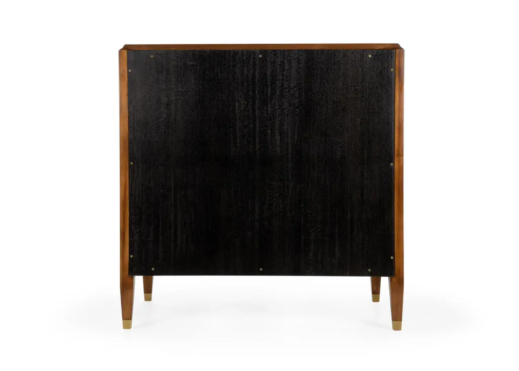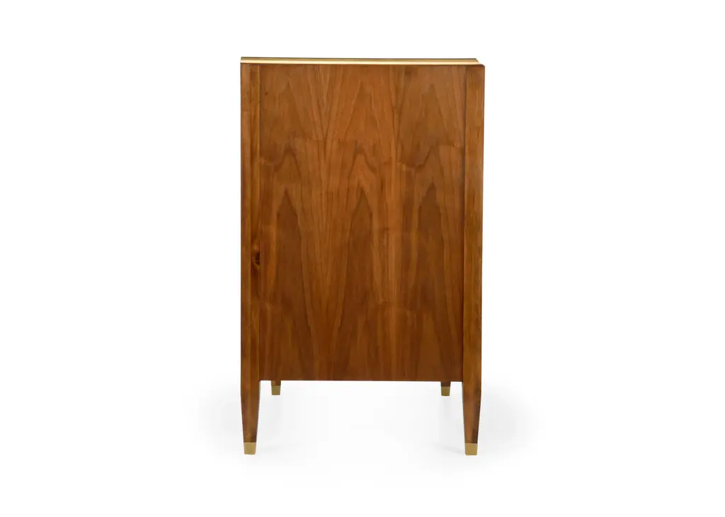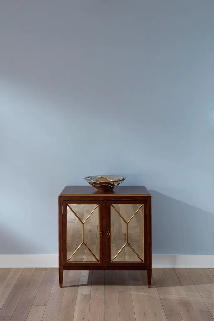 Two door, walnut cabinet features an antique mirrored front with brass trim and hardware. Inside has two cabinets that measure 25.5"h x 17"w x 20.5"d each with a shelf that adjusts from 10-14". Not intended for clothing storage.
