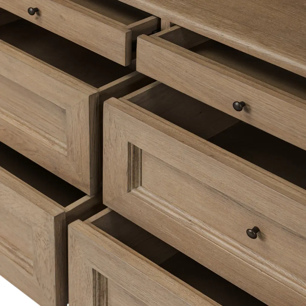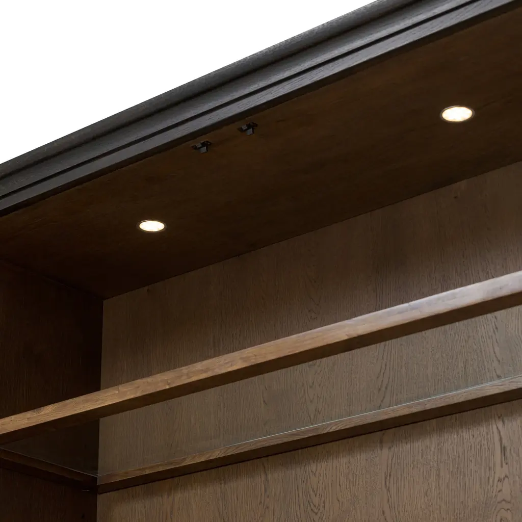 Elevate your storage potential with the Amber Lewis x Four Hands Sussex Wide Cabinet. Each detail, from the rounded edges to the bun feet and smooth cornice, exudes sophistication. The rich, drifted oak finish and faux key plates add character. With eight drawers, shelves, and accent lighting, this cabinet offers ample storage in a spiced oak finish. Highlights