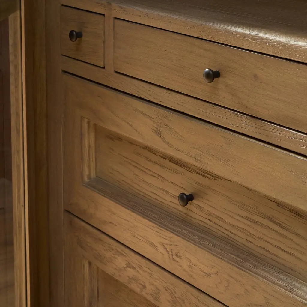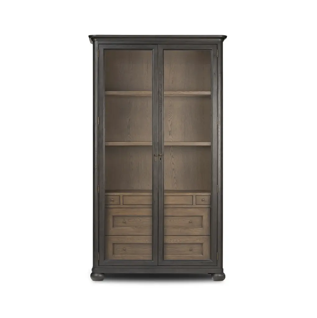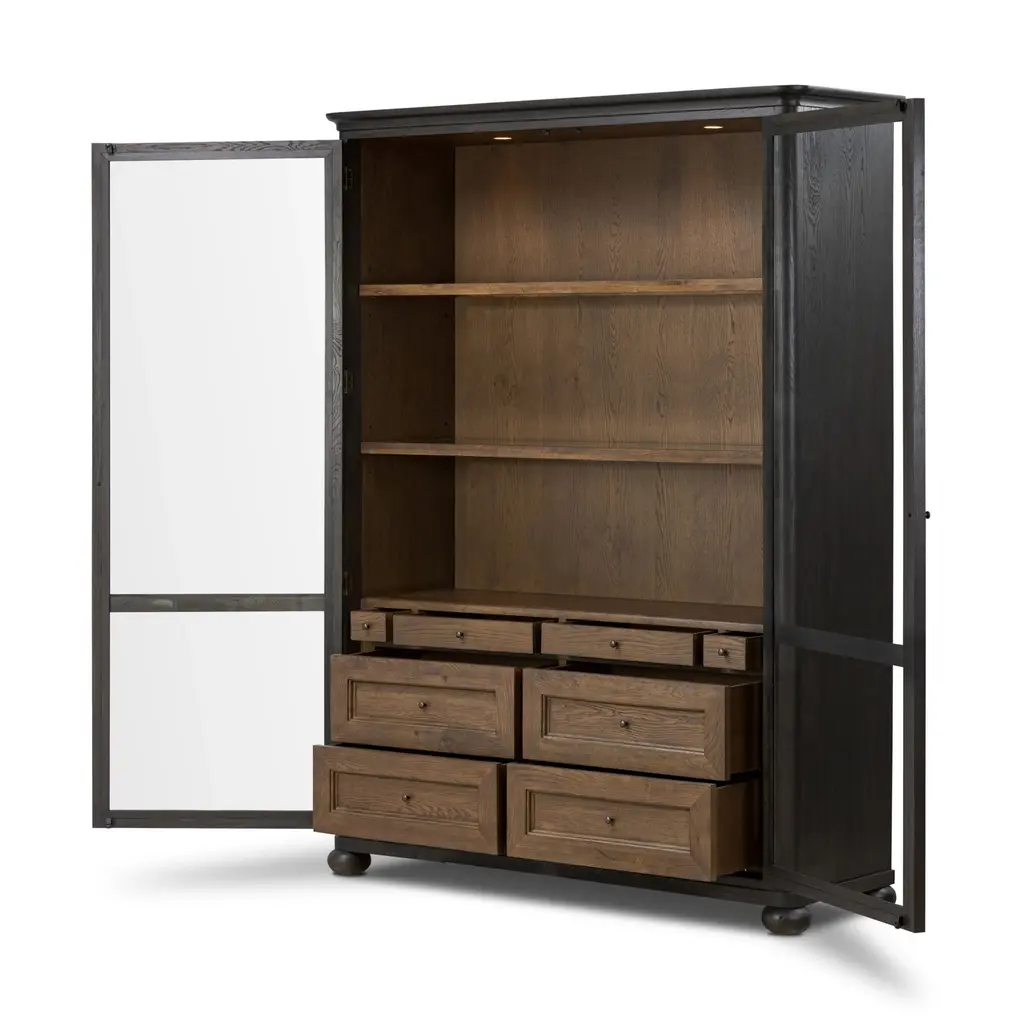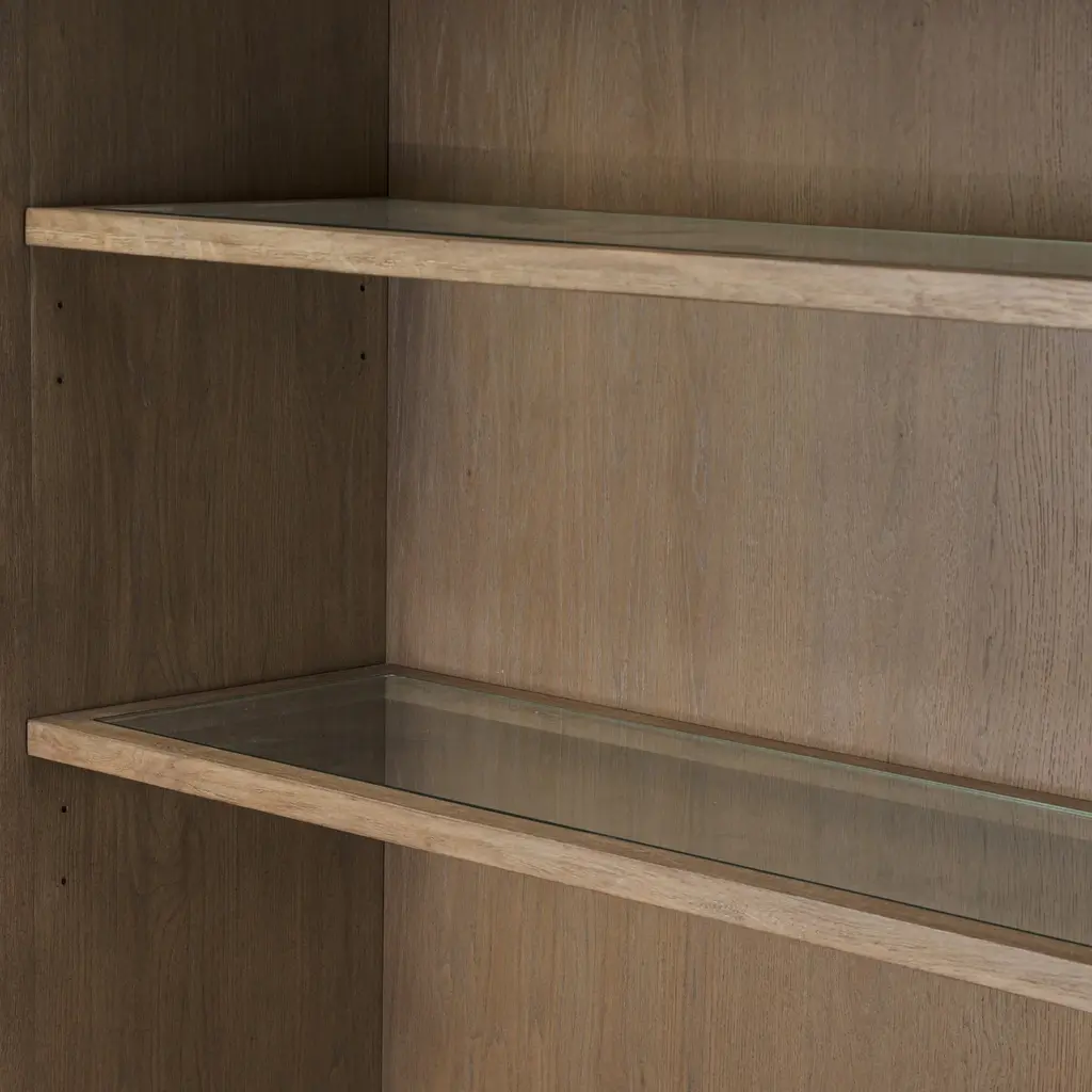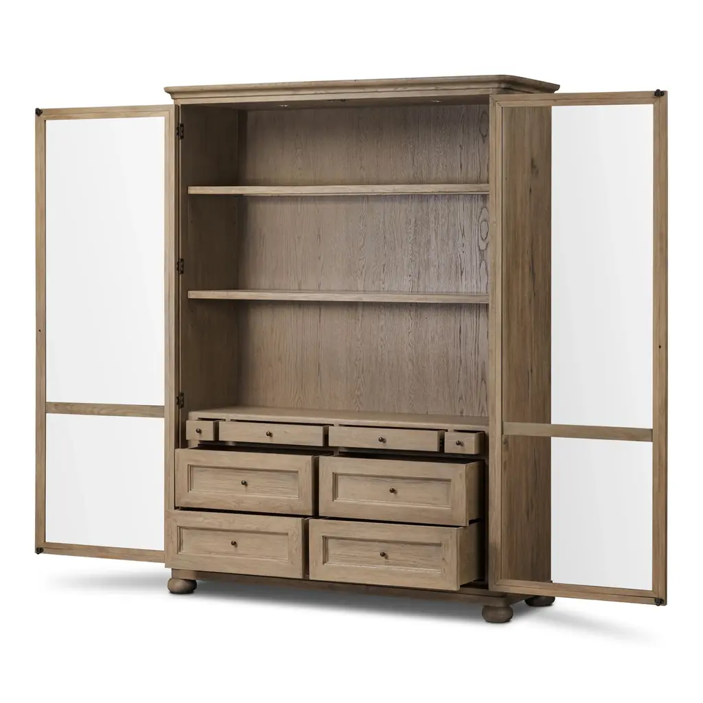 Elevate your storage potential with the Amber Lewis x Four Hands Sussex Wide Cabinet. Each detail, from the rounded edges to the bun feet and smooth cornice, exudes sophistication. The rich, drifted oak finish and faux key plates add character. With eight drawers, shelves, and accent lighting, this cabinet offers ample storage in a spiced oak finish. Highlights
