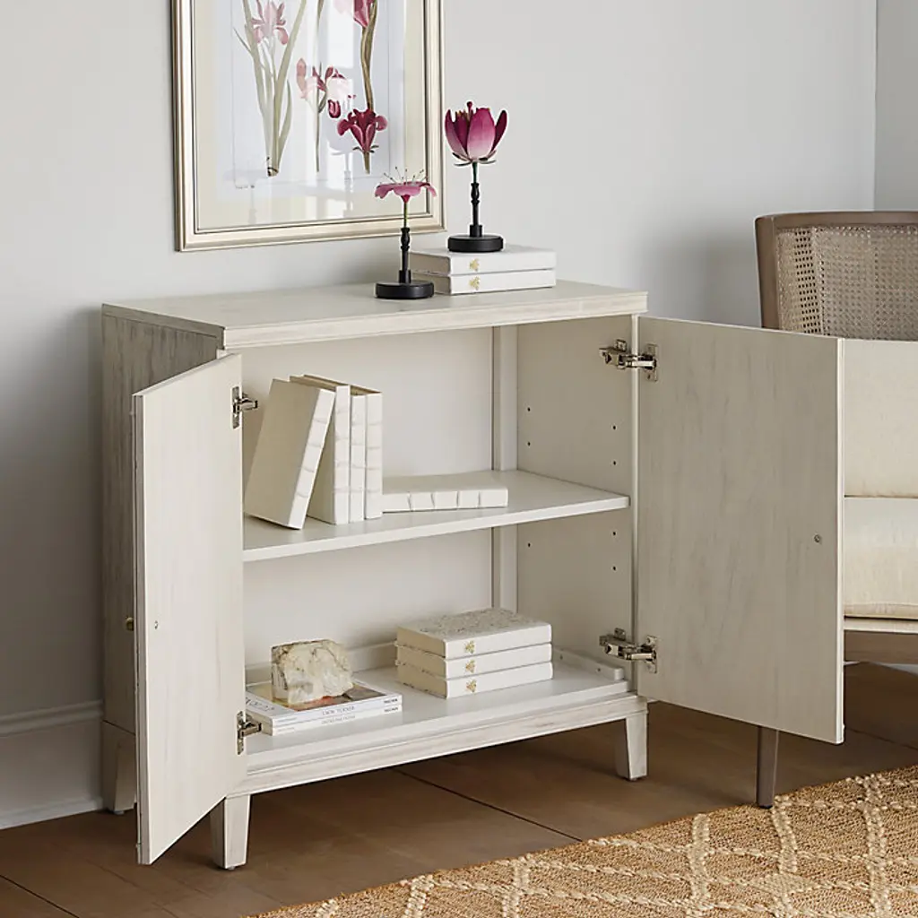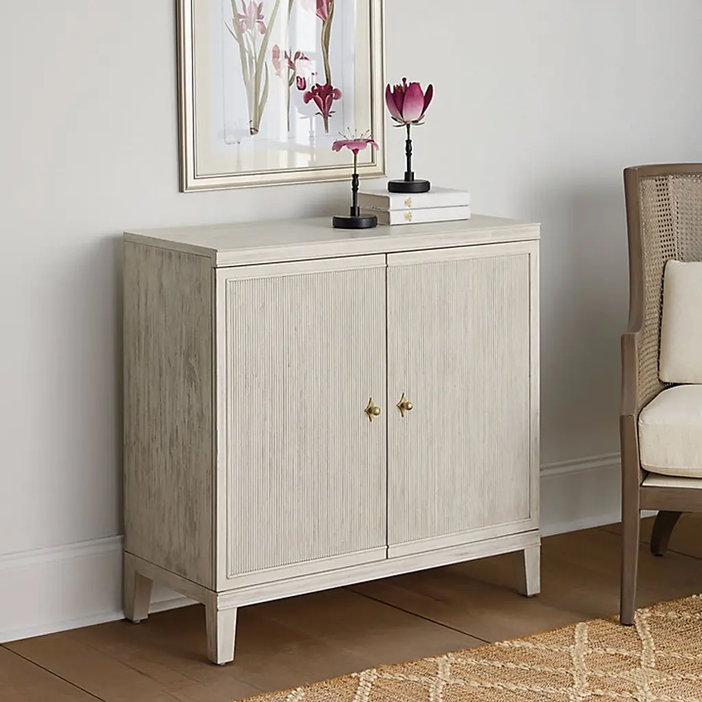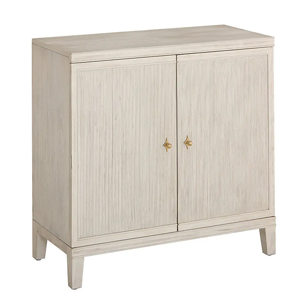 Our modular Amelia Collection is a beautiful blending of Gustavian-inspired style and fresh texture. This gorgeous storage cabinet is hand crafted of solid mahogany with washed alabaster finish and fluted doors framed in tailored bead details. Cabinet doors open with decorative antique brass knobs mounted on matching brass diamond back plates. Inside, one adjustable shelf offers generous storage beside the living room sofa or in the bedroom as a dresser. We also love this petite console cabinet as a small TV console or entryway cabinet. Stand two or more side by side to create even more storage space. Amelia Cabinet features: