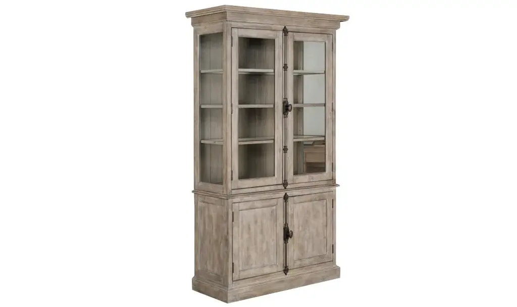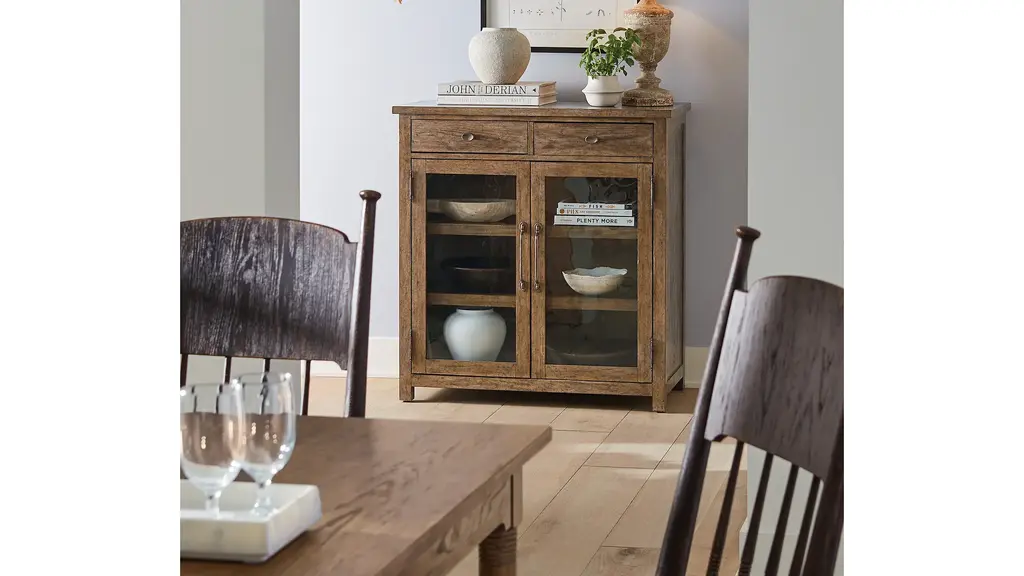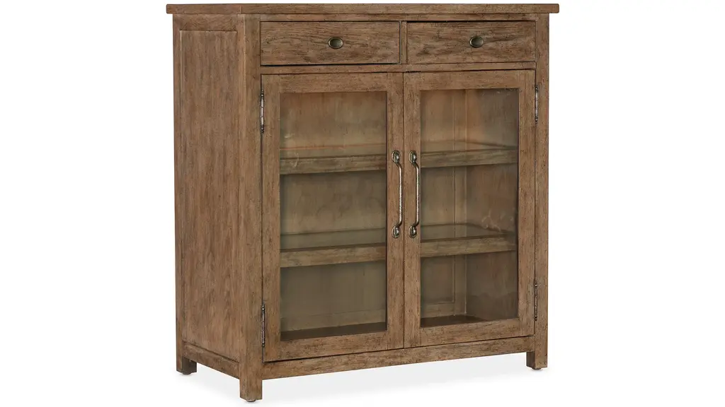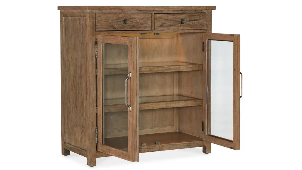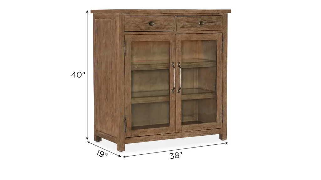 Americana Cabinets has two wood-framed seeded glass doors with magnetic catches and a light in the door area. Crafted of Oak Veneer, it is finished in the gentle warm Honey tone with distressing for authenticity. Measuring 40 inches high by 38 inches wide, it has two self-closing drawers, and two adjustable wood framed tempered glass shelves with plate grooves. Metal alloy oval and bar pulls in an antique bronze finish.