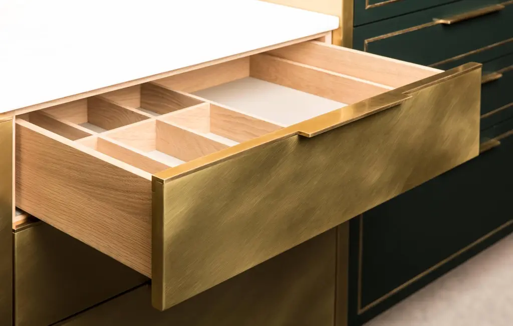 Amuneal's Brass Pantry Cabinetry, part of our metal Kitchen Collection, is designed as a feature element for any space. The three doors on the upper cabinets are fabricated with a knife-edge detail for an integral pull to maintain the clean, modern lines of the unit. Inside, silvered oak cabinets with adjustable shelves provide flexibility for use as a kitchen cabinet, a bar or a pantry. The countertop, side returns and backsplash are all finished in a hand-applied warm brass patina to match the rest of the exterior of the unit. The countertop and backsplash are further highlighted by integral lighting from the cabinet above. The lower three drawers and matching width doors feature Amuneal’s full width pulls that are machined from solid brass. The interiors of the drawers are lined with faux leather and silvered oak dividers. These units are fabricated in our Philadelphia-based furniture studio and are available in custom sizes, configurations and in a range of materials and finishes.