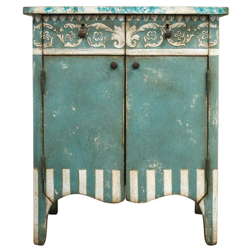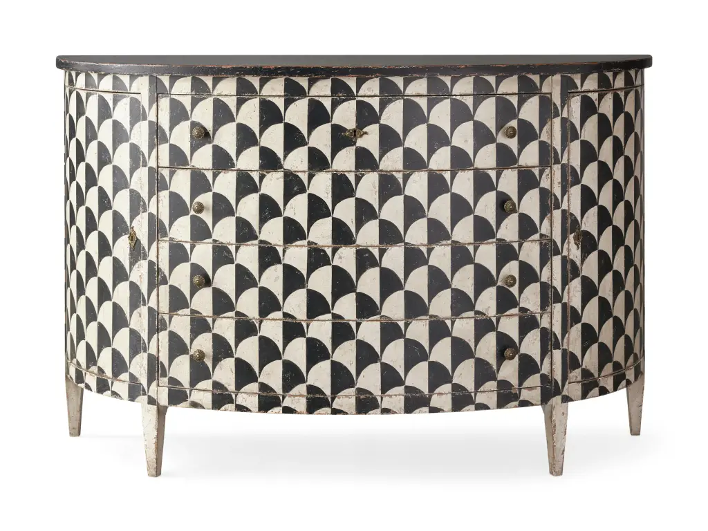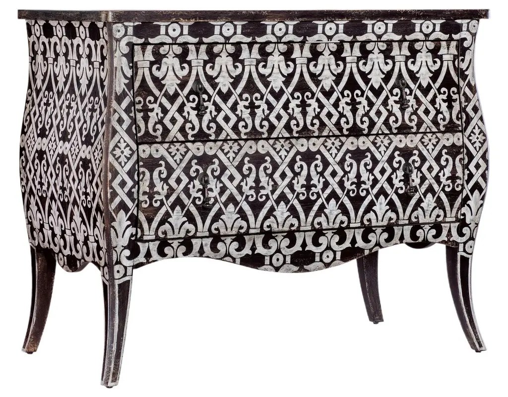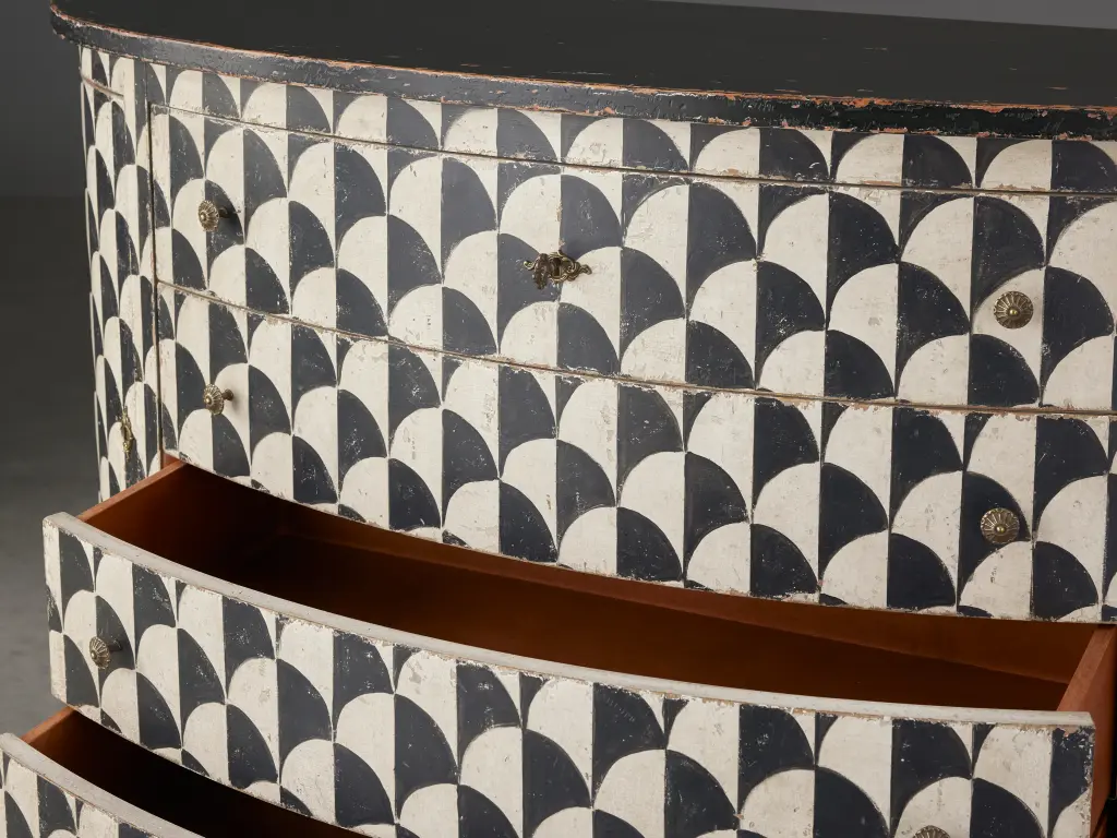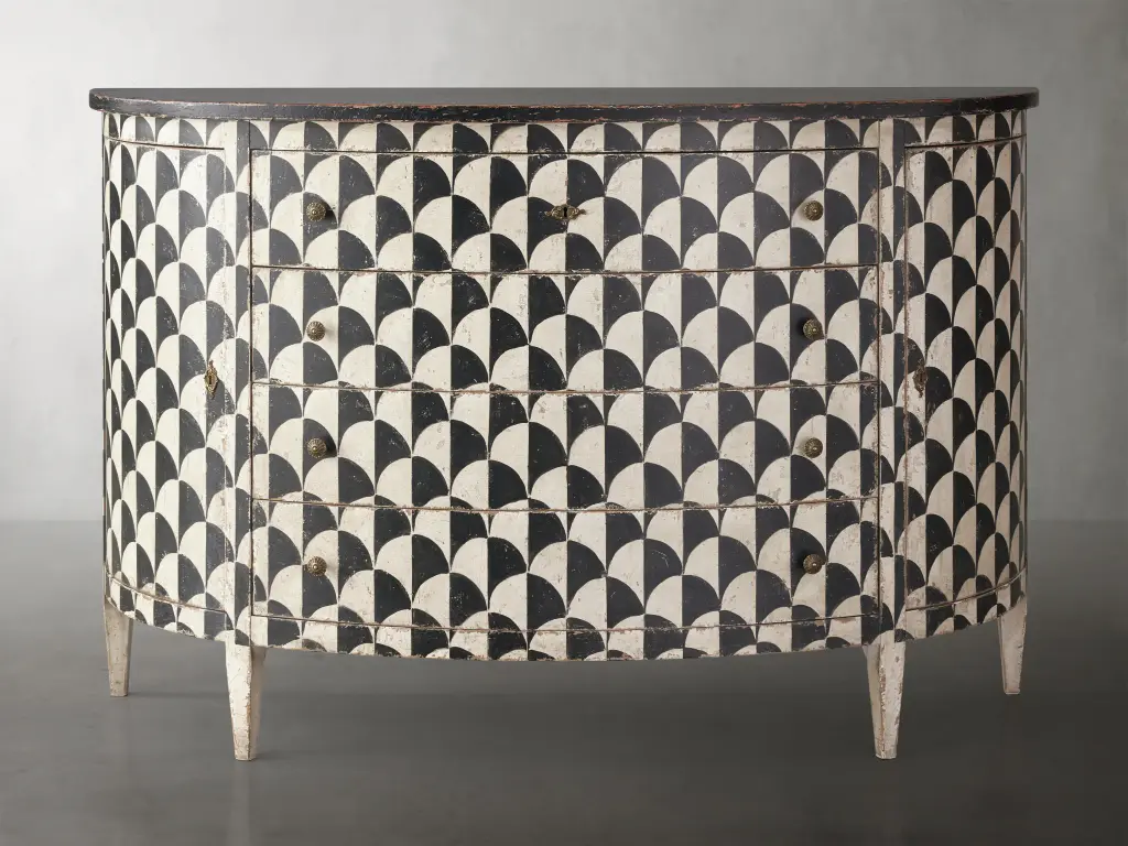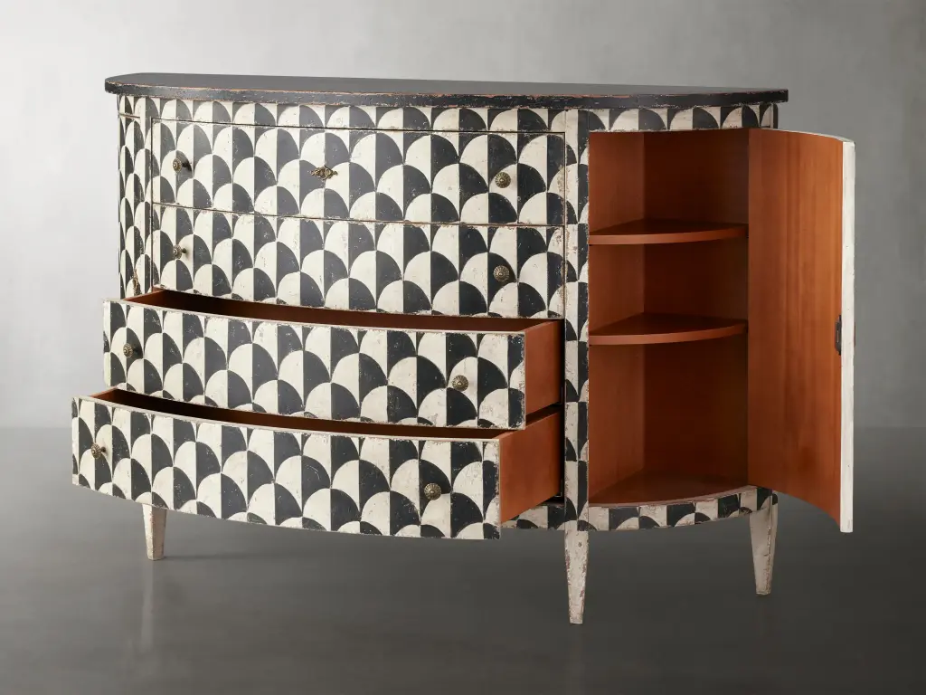 Centuries-old woodworking techniques are used to craft every exquisite detail of our exclusive Bell’Arte collection. Handcrafted to order in a region of Italy renowned for its furniture-making, our dedicated artisans treat each unique piece like a work of art. Cabinetry is built from solid poplar wood and masterfully finished by hand, combining layers of stain, paint, and lacquer—a process which takes over three days to complete per piece. Our Andretta Cabinet is inspired by authentic Italian antiques, featuring hand-painted black and white geometric decor for a touch of charm and warmth.
