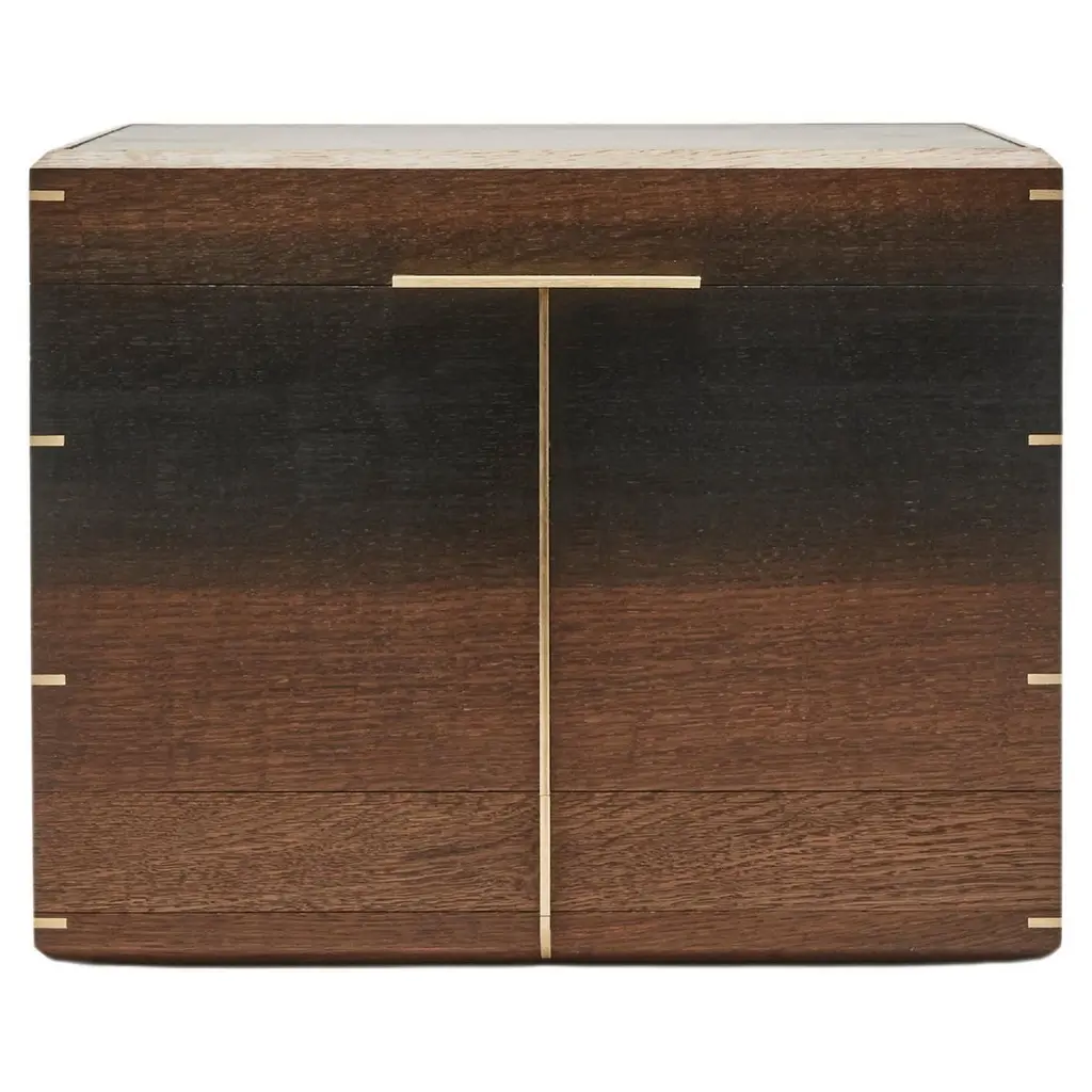 Accented by brass trim doors and feet, this two door cabinet with a checkerboard pattern in varied walnut features a large square antique mirror and a tapered leg base. Not intended for clothing storage.